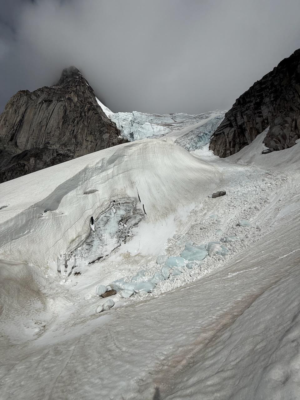 Be mindful of the South Howser icefall as you come and go from camp. It has been active lately, threatens a hefty portion of the approach, and can occasionally send debris to within metres of some of the tent sites.