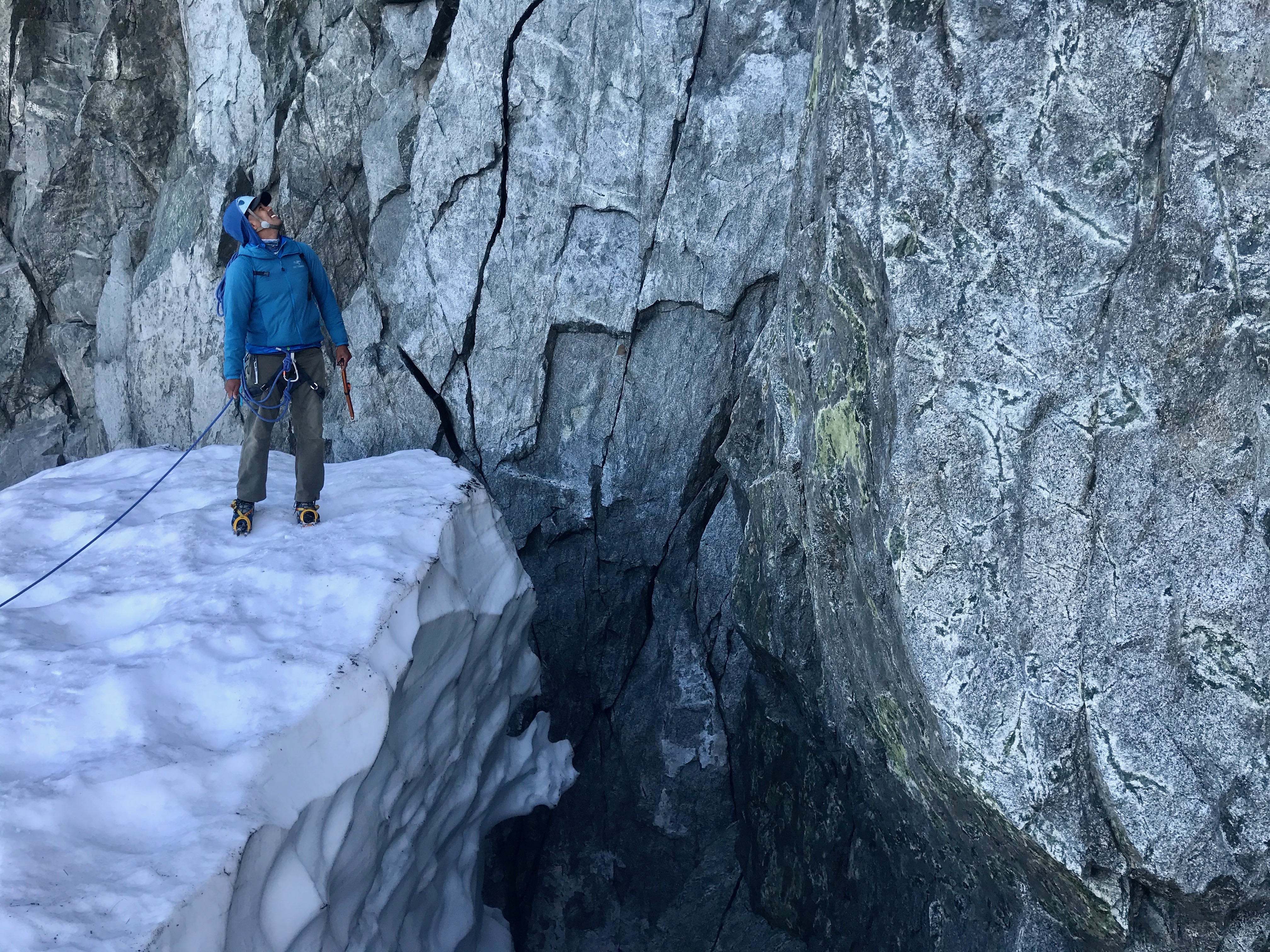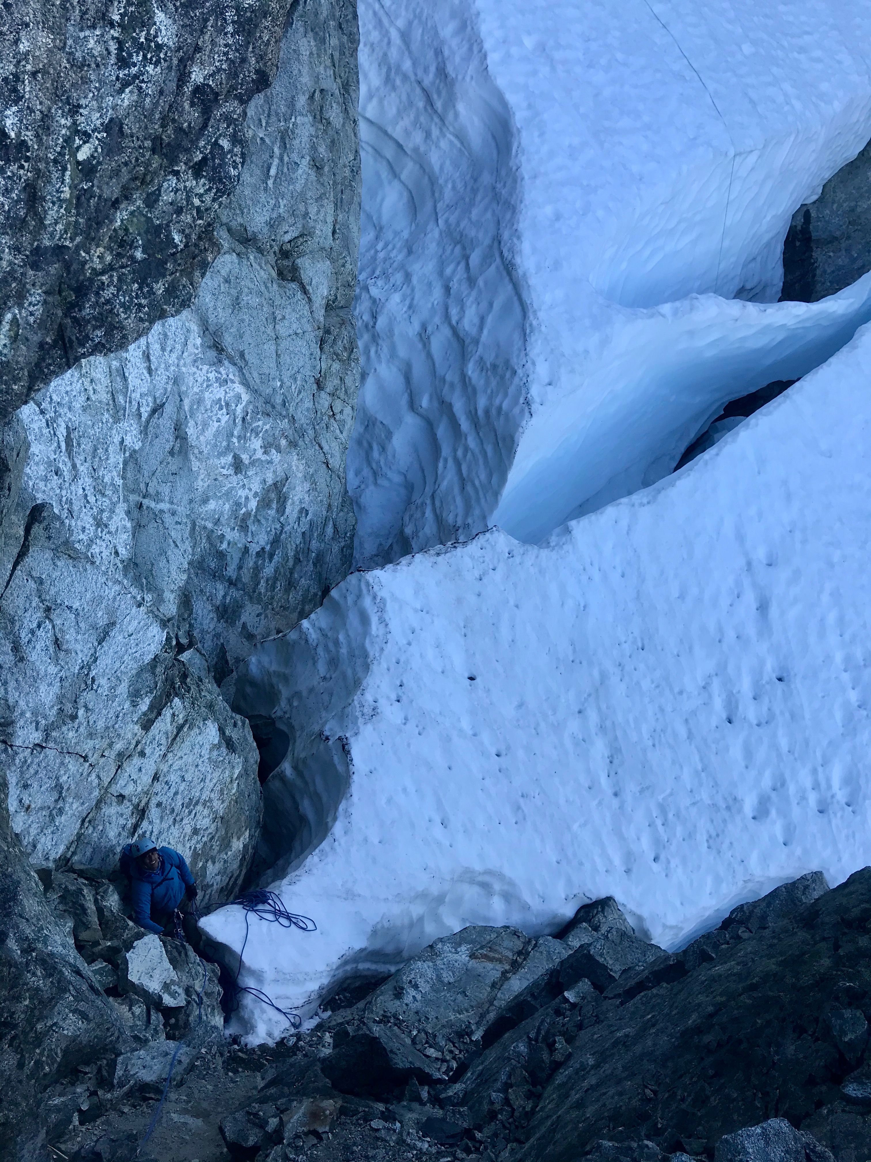 The moat to access the SE Spur route on Mt Tantalus is still easy to cross, but it’s a bit further north than it has been the past few years, making the rock climbing more difficult to get back on route (probably the hardest climbing on the route). If you’re coming from the north on the Tantalus Traverse (as most people seem to be doing lately), this is not an issue as you rappel right over it.
