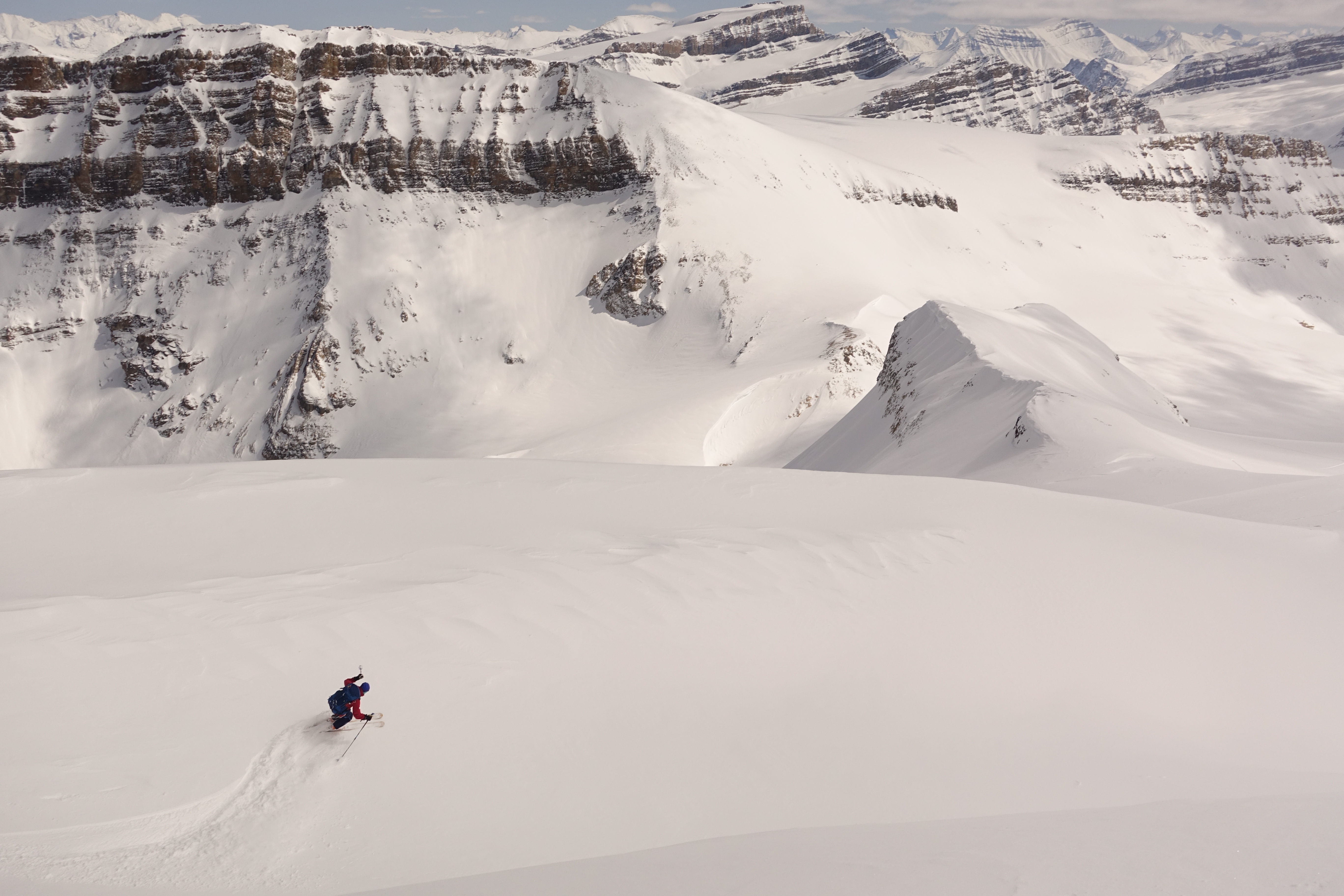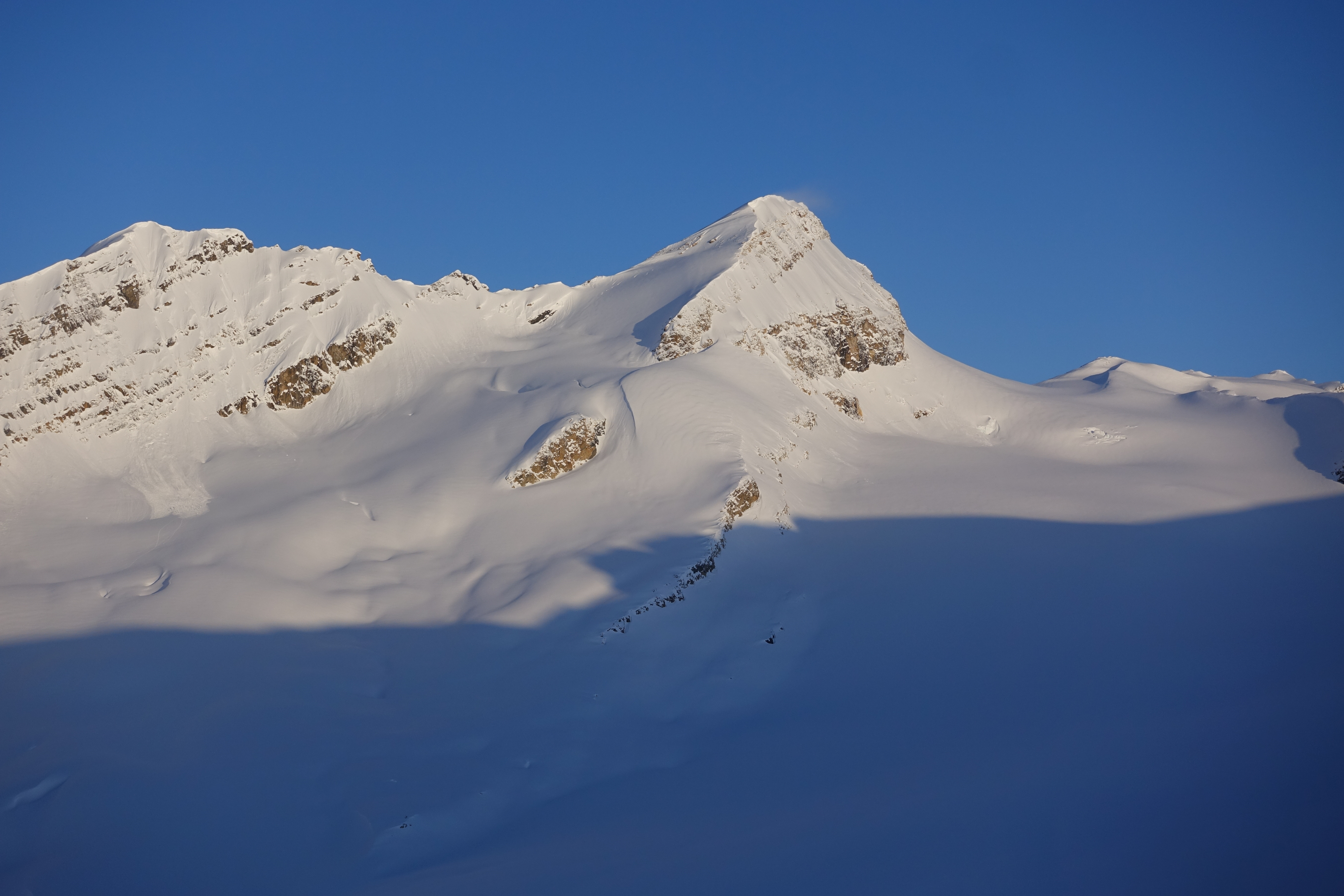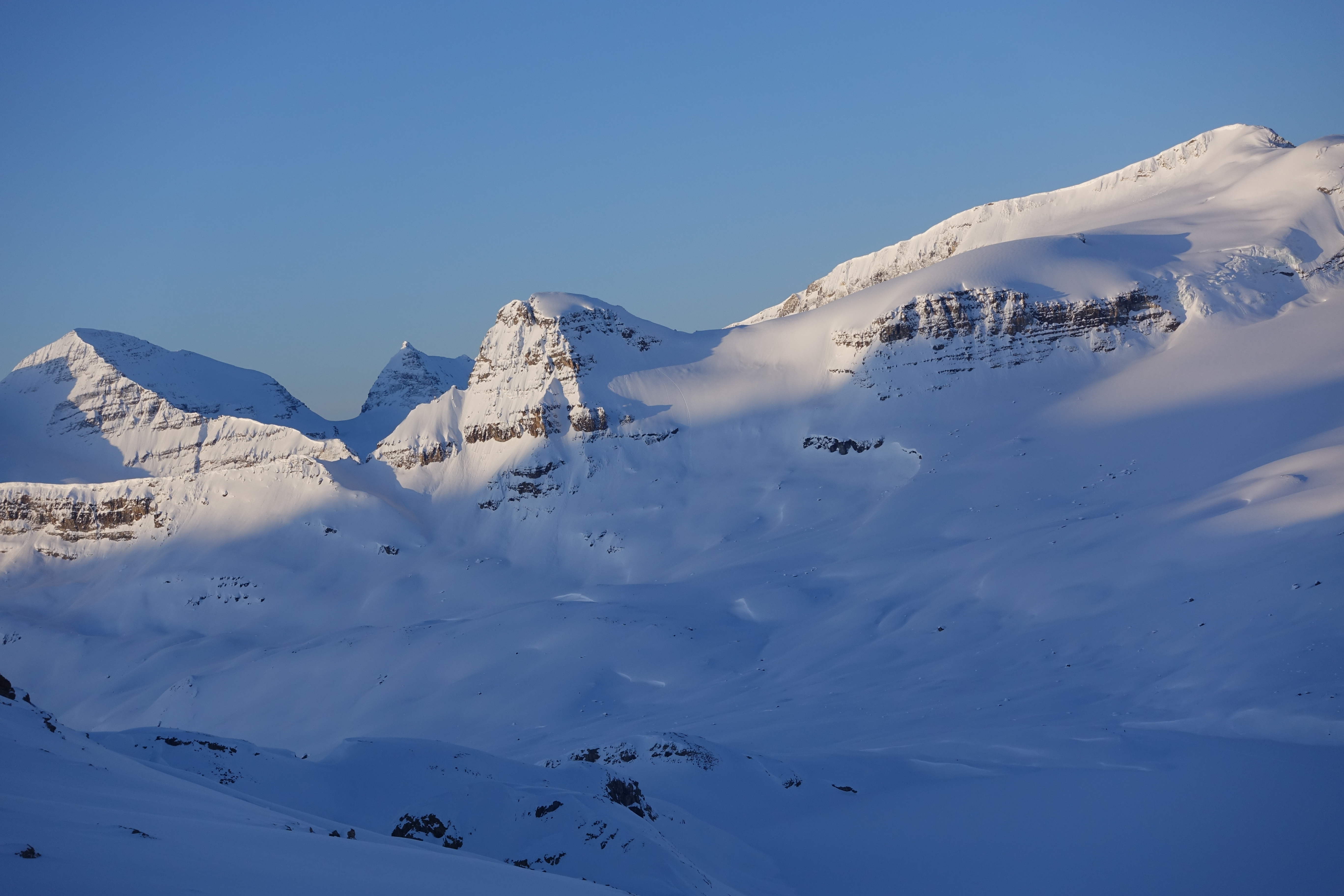 On Thursday we skied up to 2950 m on Mt. Des Poilus, SE aspect, as well as to the summit of the neighboring 3050 m sub-peak just to the north (the one that Mark Klassen's original map accidentally labels as Des Poilus) and found excellent skiing. By the afternoon, all aspects well into the alpine except for sheltered north were moist from sun exposure. Yesterday we skied over Isolated Col, sneaking in a hot lap on the north aspect, which was excellent skiing. The south aspect down to Stanley Mitchell was some of the most challenging breakable crust (2 cm thick, overlying dry snow) I've skied in a long time, and it took us a while in the flat light with heavy packs to make it down safely.