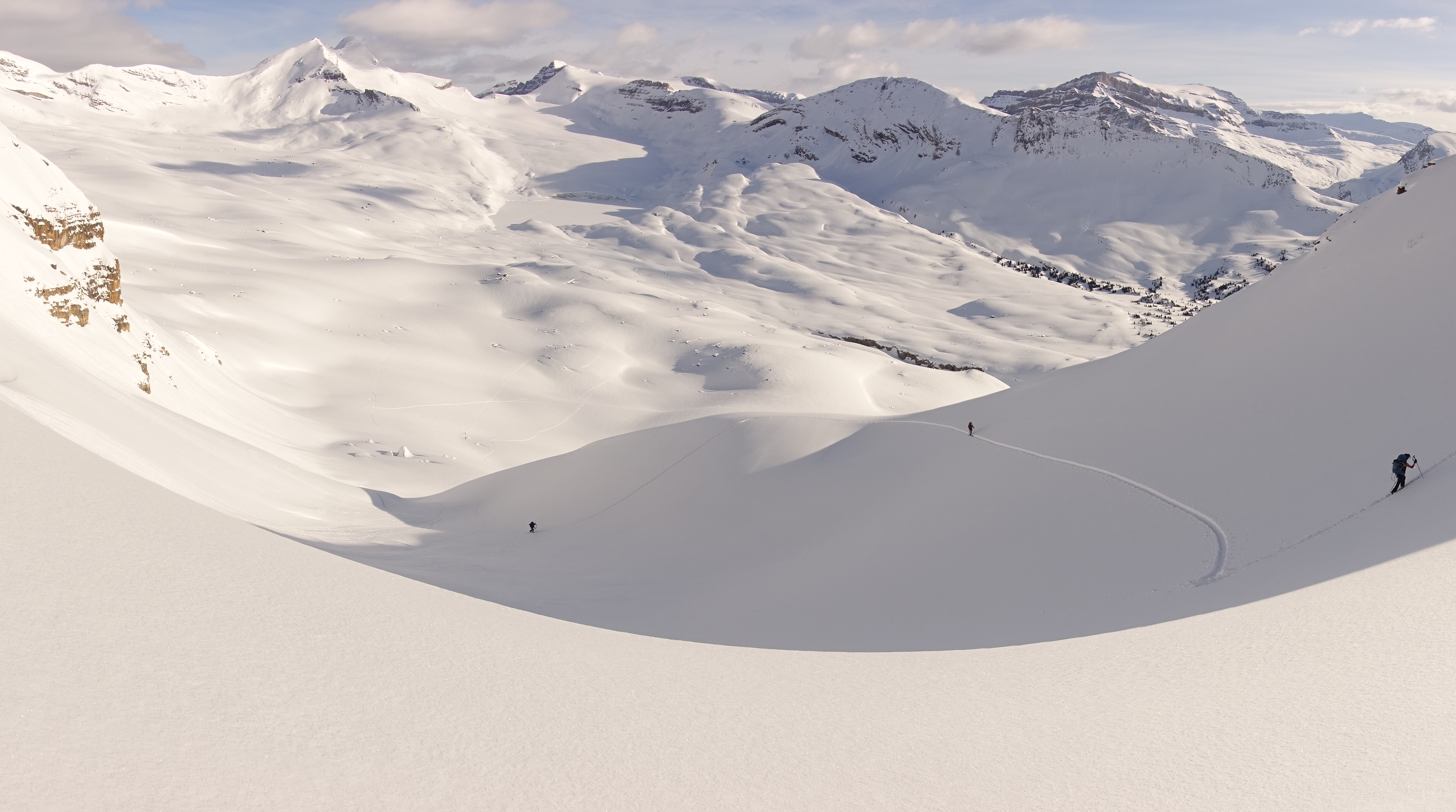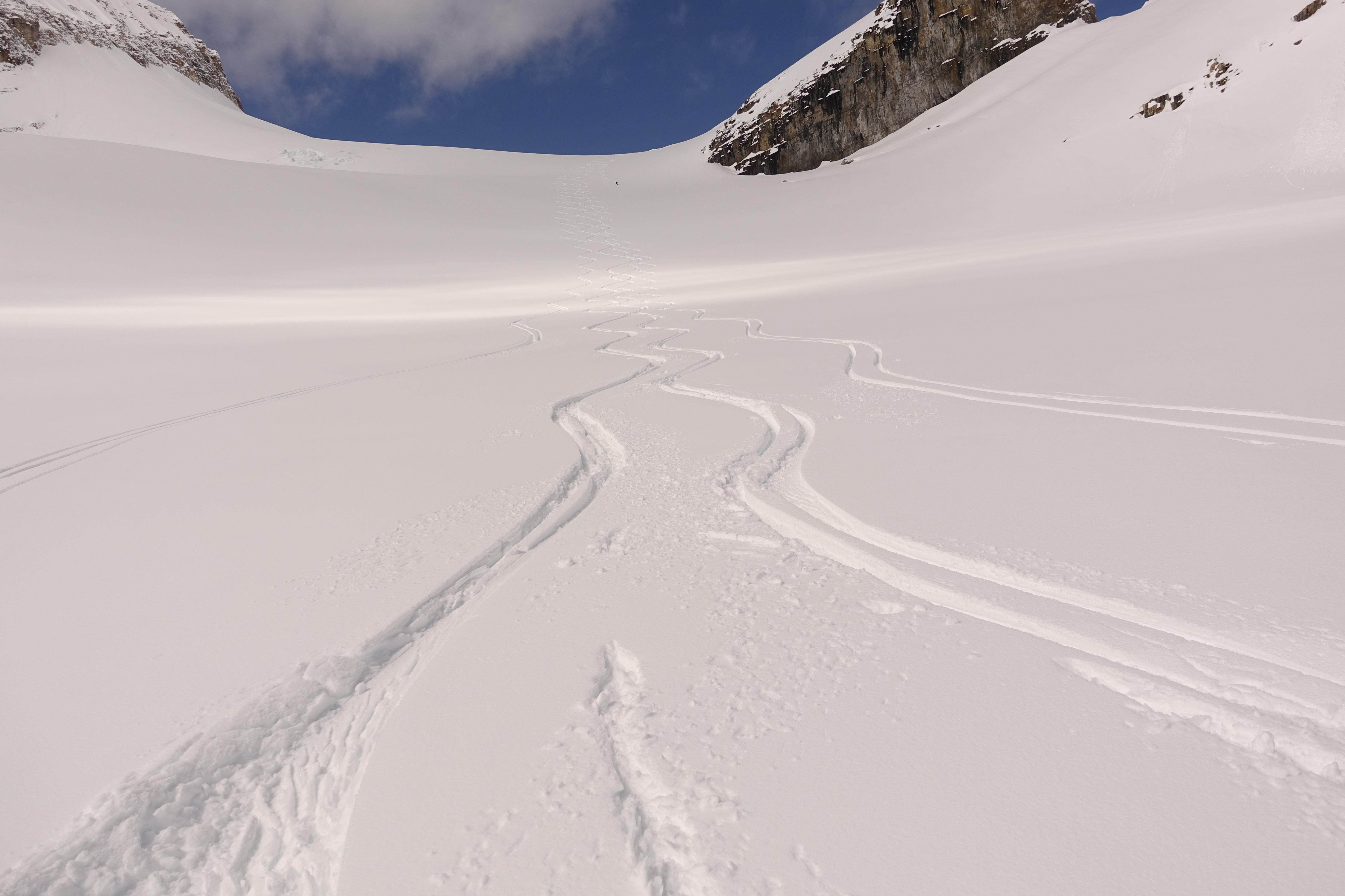 Today we skied out the road in a spring storm. I would guess the alpine saw another 10 cm at least, with wind and freezing levels dropping a bit from the 2200 m of yesterday. The route down from Stanley Mitchell was a bit spicy through the switchbacks but otherwise pretty quick.