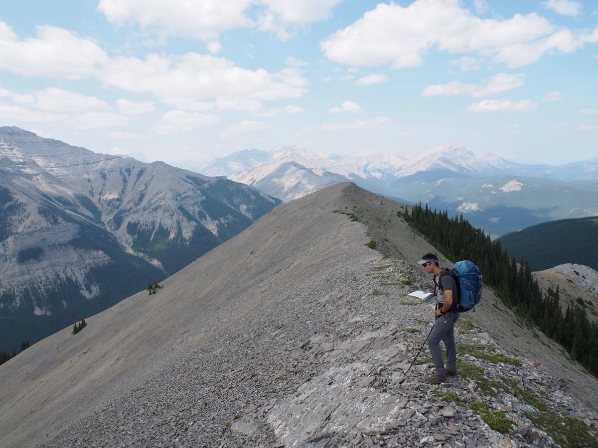 From the Junction Creek trailhead we forded Sheep River at 50cm, a pole was helpful for balance. We then followed Sheep River Horse Trail to 613 083 and followed game trails to Northern edge of ridge at 608 072. This took 90min. From there we followed the beautiful undulating ridge to 618 052. Descend the skiers right spur going down into drainage picking up visible game trails to arrive at Junction Creek. The desent is steep through small screen that is not deep enough to scree ski. There is no water until you are back at creek. Junction Creek is easily forded. We were attempting to go to Junction Lake but the creek was blasted by flood and trail was gone in most places. We ascended up the creek but travel slowed to 1km/hr. We decided to turn around and stay at a campsite on Junction Creek at 615 044. The second day we walked up the main Junction Creek Trail, that is horse hammered, until we go to the turn off to Pickekjar lakes 019. There are some waterfalls that are visible right away but the main and much larger falls is about 100m up the trail. Many more tent spots open in here. We then did the 9km walk back to the Trailhead. All GR is for MT Rae 82J/10 Overall a nice challenging trip that give some serious off trail hiking mixed with some nice waterfalls.