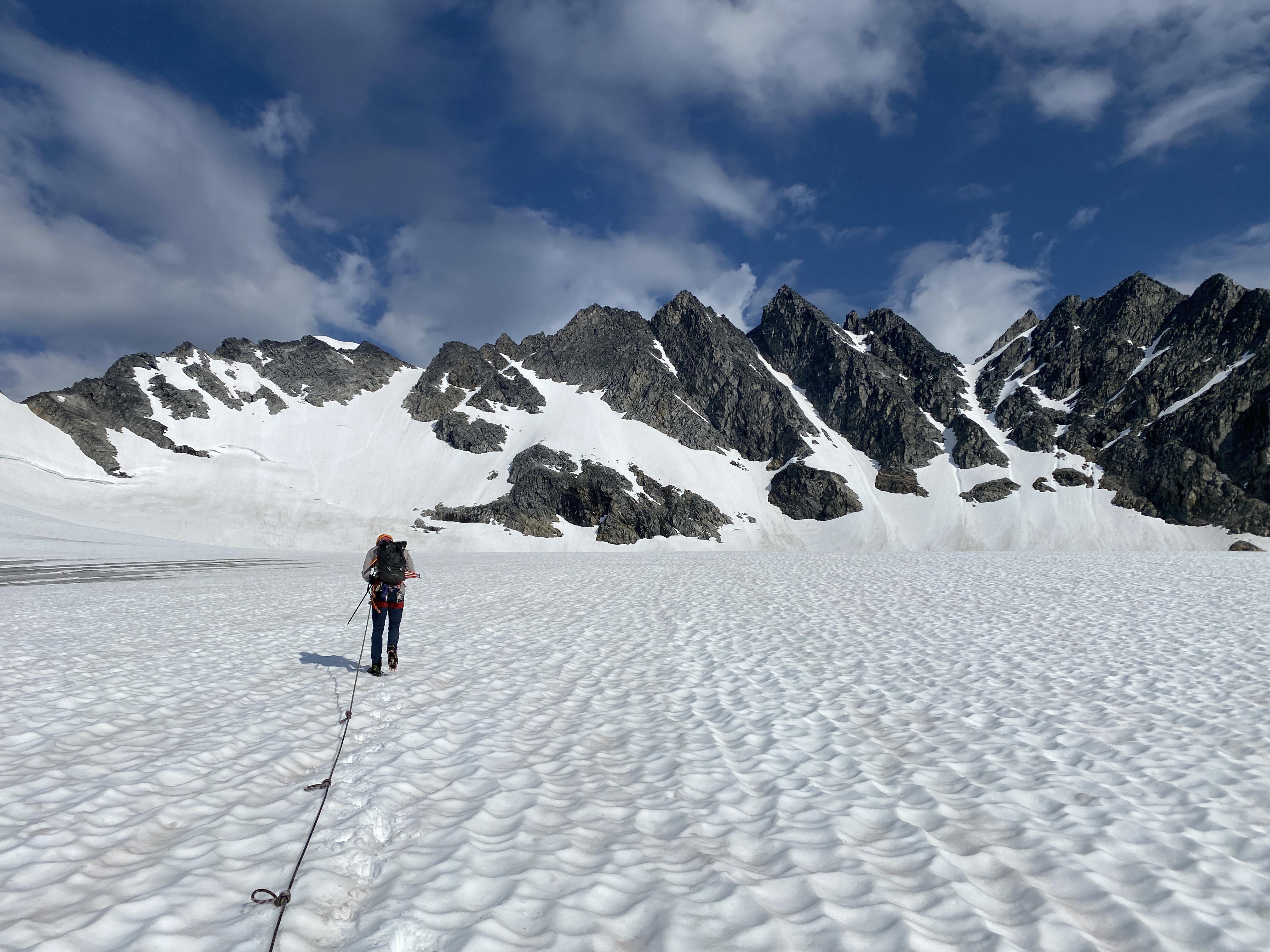 We climbed the Swiss Peaks traverse yesterday from the Mount Rogers col and descended the Truda couloir. The travel on snow remained excellent despite having no overnight freeze and sunny, hot conditions up high.