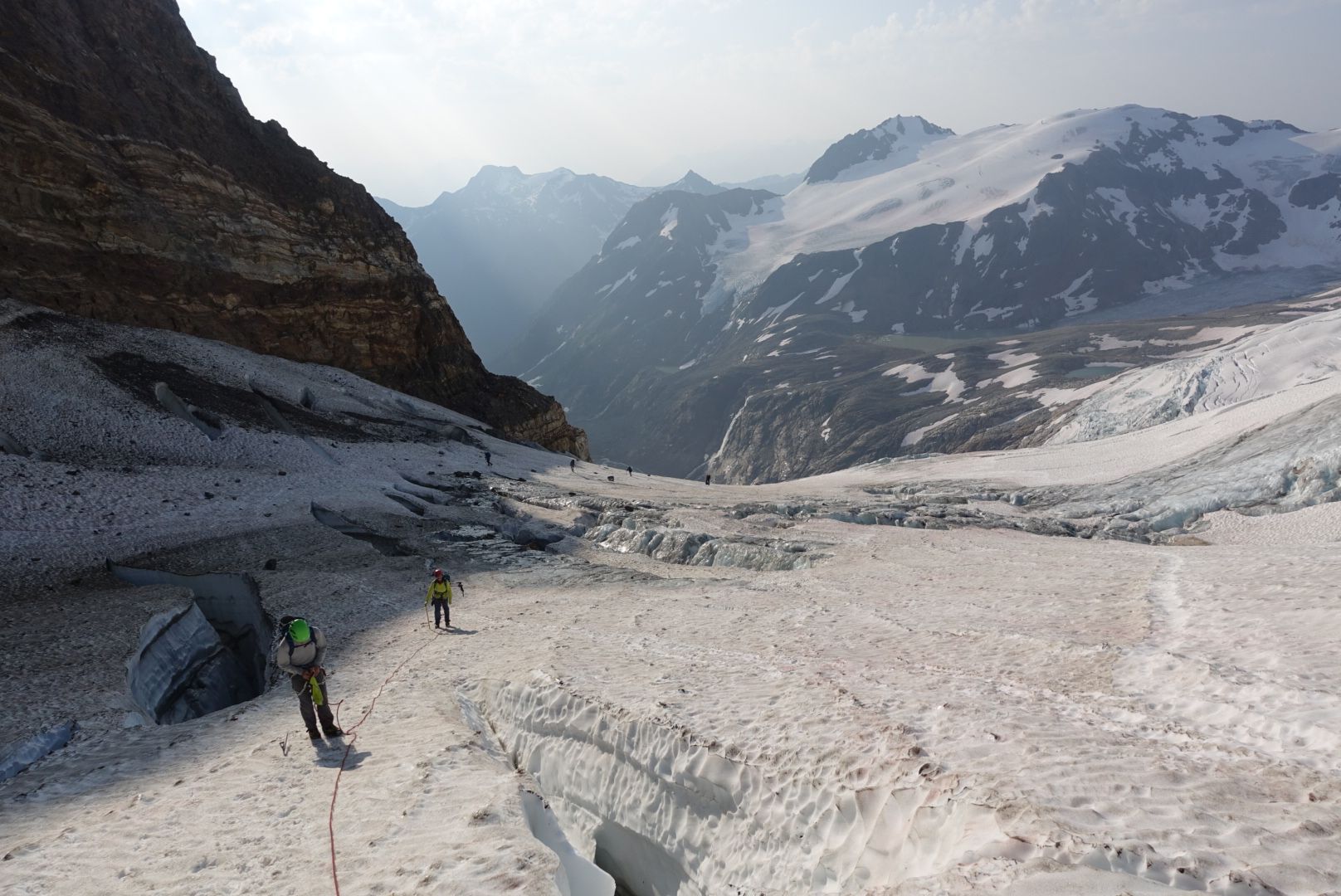 I'm attaching a few photos showing the glacier travel approaching Hallum Peak as well as the route from across the valley (from near the base of Magic Carpet Glacier).