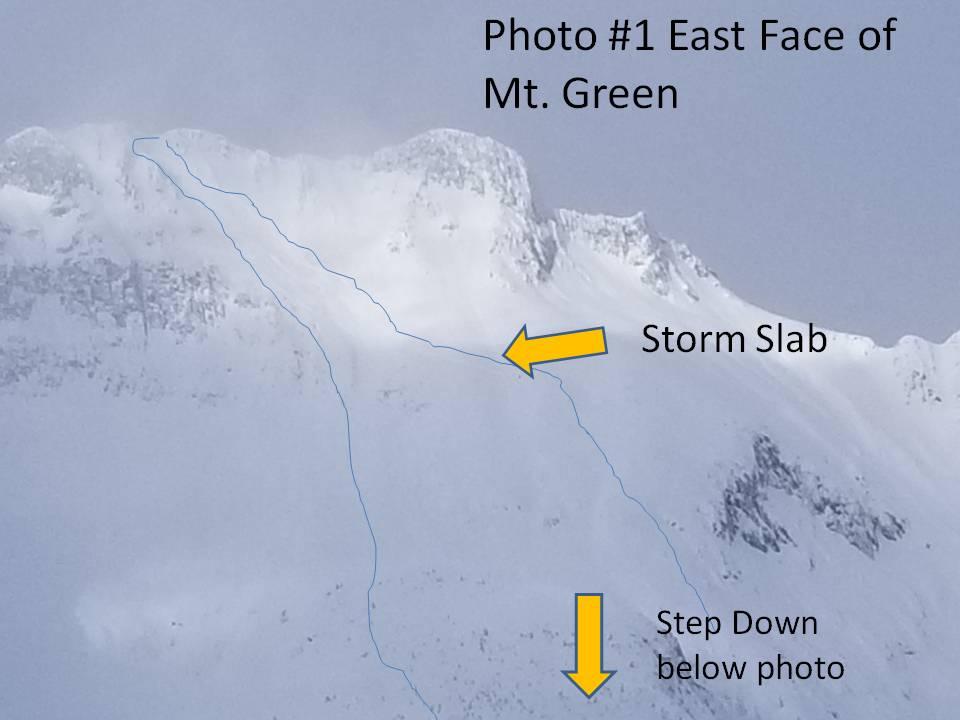 This avalanche released from the East side of the summit ridge of Mt. Green (photo 1) starting off as a storm depth slab and then stepping down @ 1800 to the Dec 1st crust/facet layer which added significantly to the mass of this avalanche.