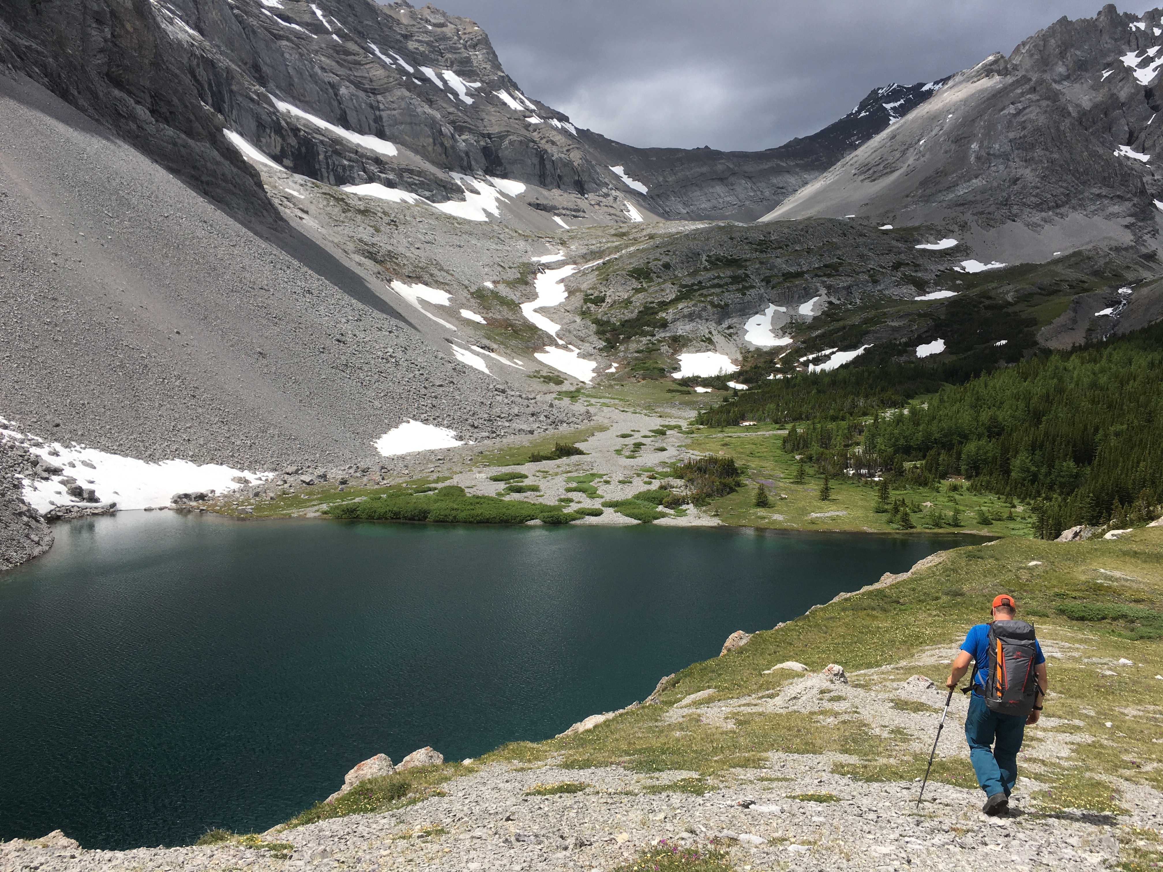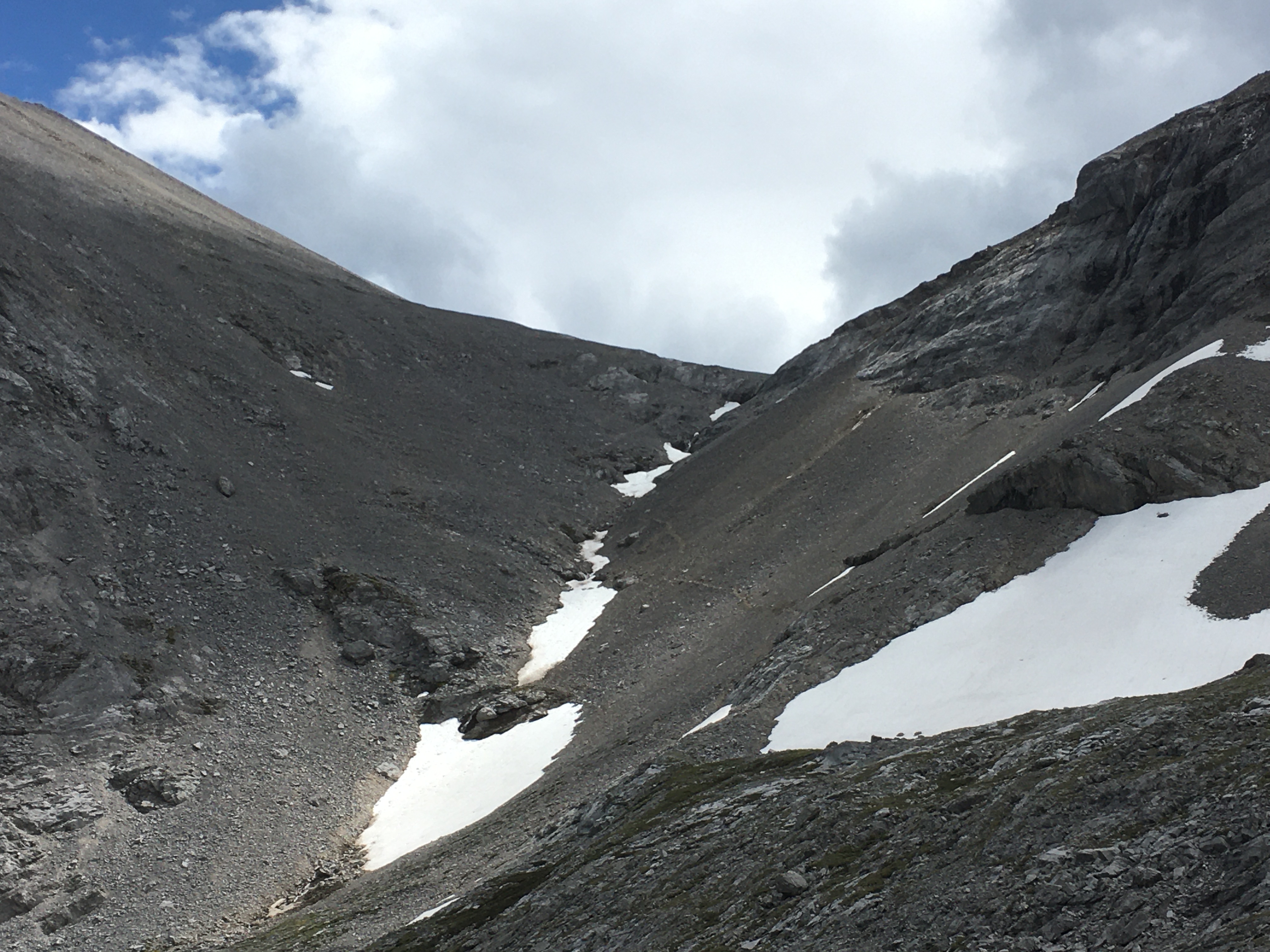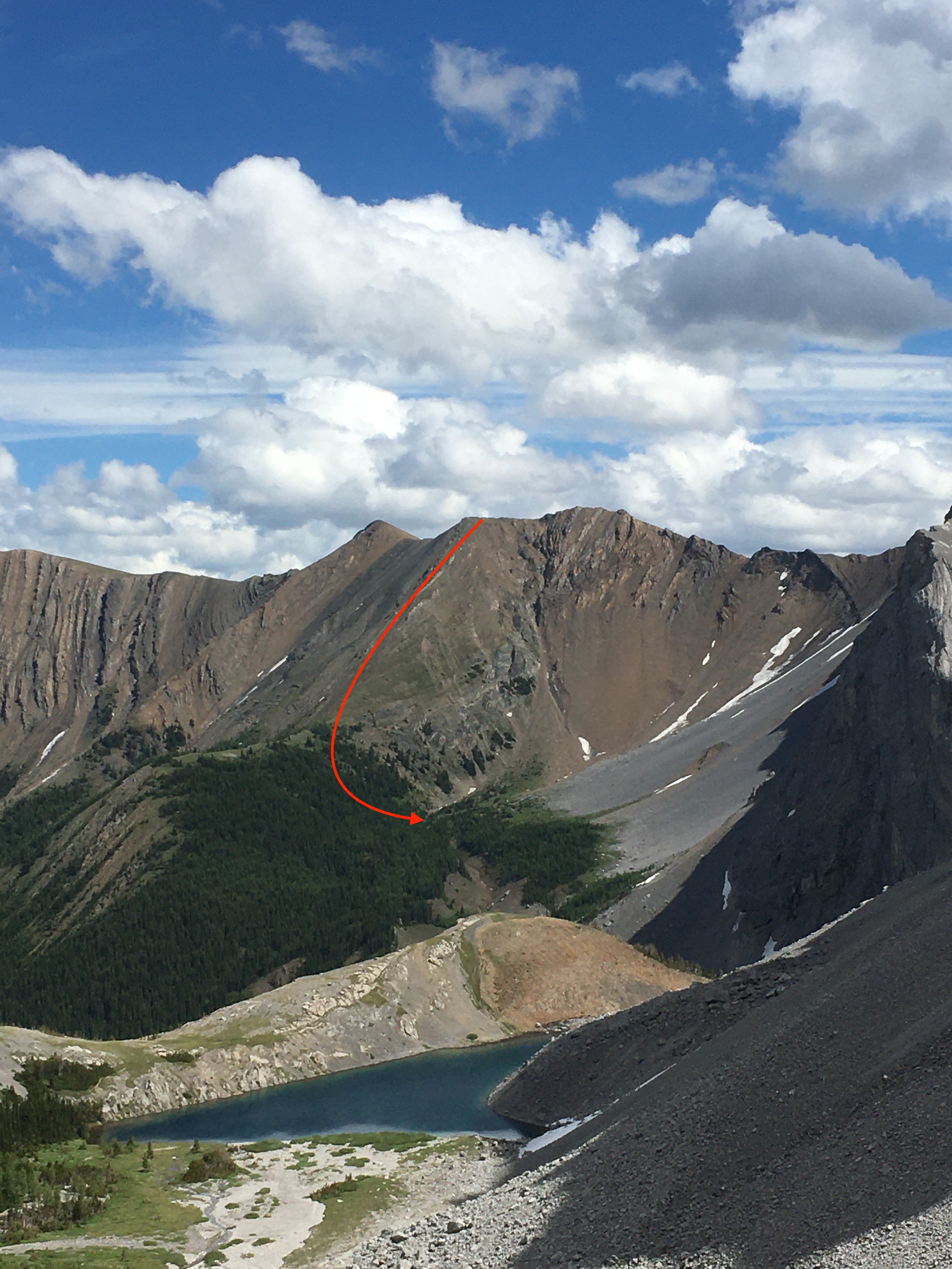 We went for a walk last week to explore some KCountry ridges in the Highwood Range. We started up and over Lineham Ridge into the Picklejar Lakes area and connected this further north to Mist Ridge and then up and onto Eagle Ridge (as named on the Highwood GemTrek map) and down into Burns Creek. From there we went up past Burns Lake and through a col to the south of Mt. Arethusa and down into Arethusa Cirque and back out to Hwy 40. This was an excellent (mostly) alpine walking route and during the whole 4 days we didn’t encounter any snow that we had to travel on, or that complicated things. We were unsure if the descent north off Eagle Ridge was possible while avoiding significant overhead hazard, but found a rib starting at 475068 that allowed us to descend into the valley without technical difficulty (see attached pic). There were other ways to descend off the ridge, depending on your appetite for scree and talus and overhead rockfall hazard. We were also unsure what the condition of the high col along Arethusa’s ridge would be on the NE side, but again weren’t forced to travel on snow to complete our route. There were some spectacular places to camp along the route, and strong off-trail navigation skills would be recommended for anyone heading out that way.