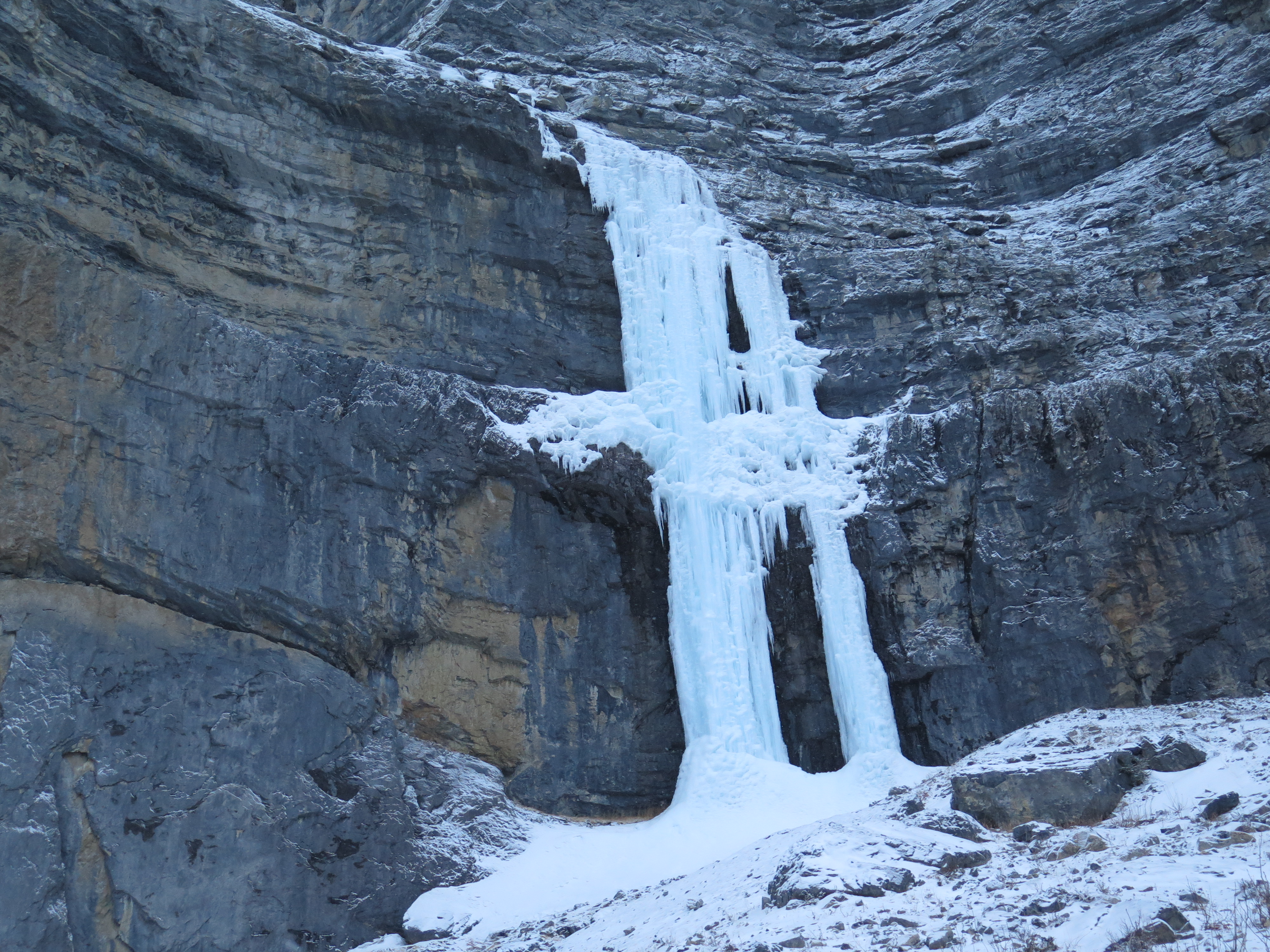 Yesterday, with cooler temperatures and overcast skies decided to check out Oh Le Tabernac on Mt Wilson. We found it to be in marginal condition, but were able to find a climbable line on the right side. Lots of hollow sounding ice where a delicate touch was useful, and I can't say I'd recommend it in the current conditions. Little to no snow on the approach. The climbs in the upper bowl looked in rough shape with two of them missing large chunks from the recent heat wave. Saw some minor rockfall starting as we were rapping down when the sun came out.
