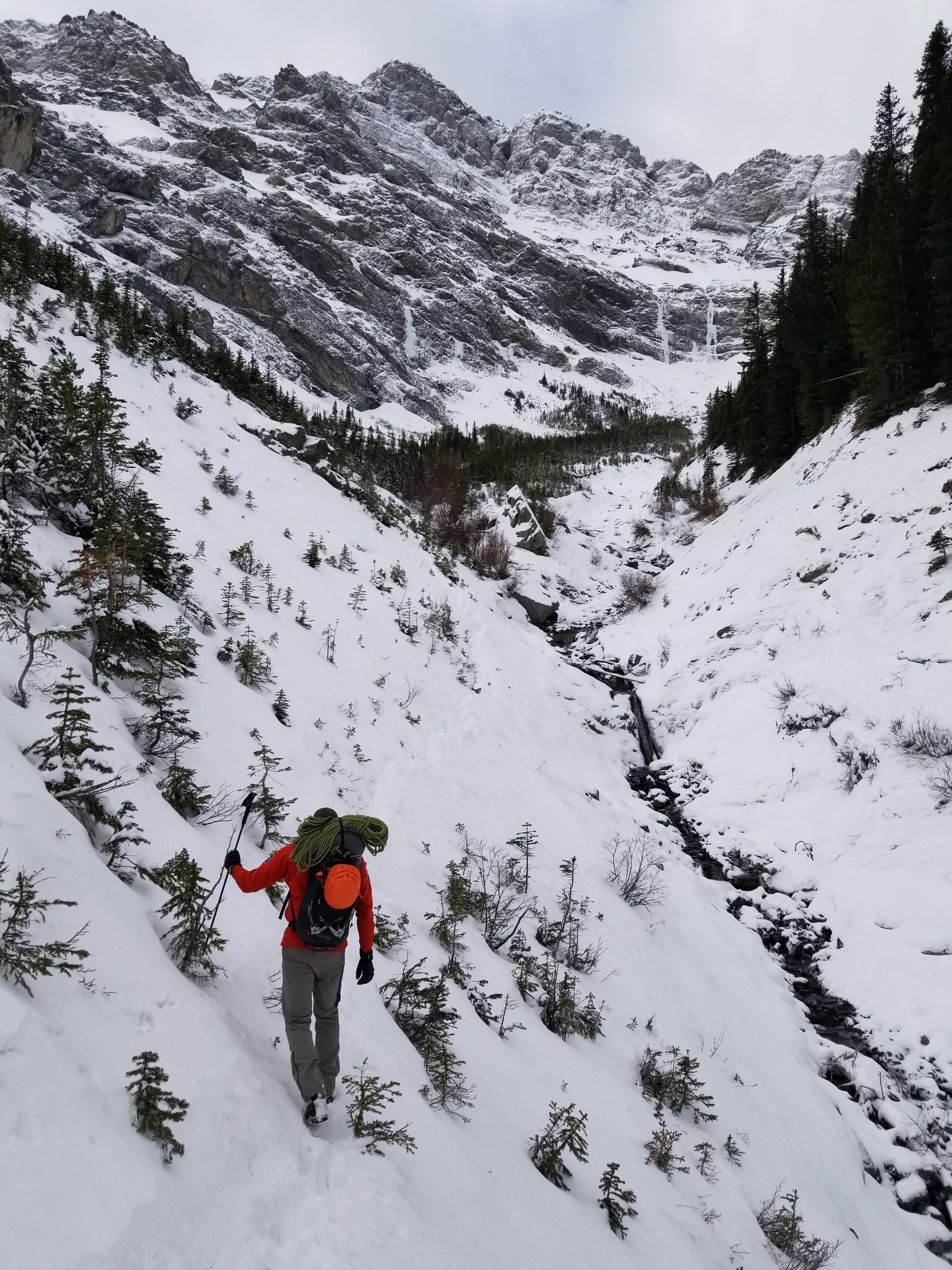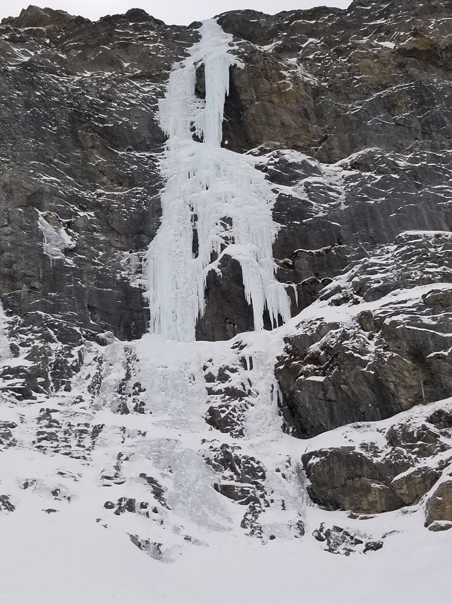 Although it was blowing all day, there was minimal wind loading going on and the surface snow remained dry and soft. There was no evidence of any recent avalanche activity. We assumed we could trigger an avalanche ourselves at higher elevations, but not where we were walking. We also concluded that while human triggering at higher elevations might be possible, we did not expect any natural avalanches from above to run over the waterfalls today.