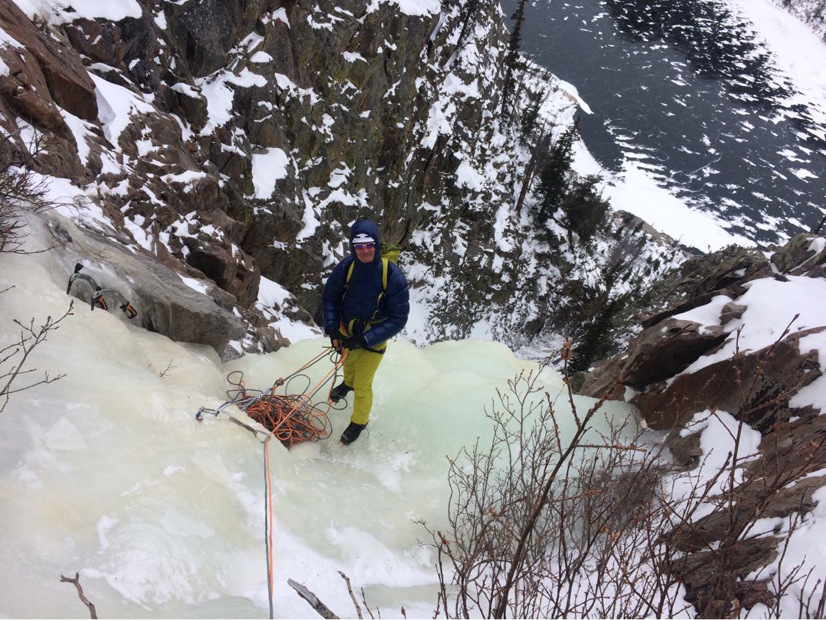 Trail is easily passable without snowshoes. Lake is frozen. Talus approach is heinous. 20cm of snow on rocks and brush. First two chimney pitches are thin and awkward. Just enough ice for 13cm screws with some hunting. Climbed the upper central fat flow. Running water and growing. Rappeled on zero threads and fixed tree anchors.