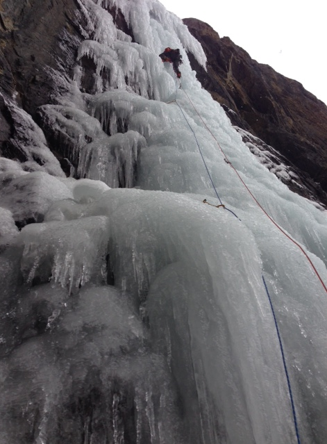 We added two new ring bolt anchors. One anchor on the climbers left hand side below the crux pitch. This previously had a old corroded hanger and a single newer expansion bolt about 4 feet apart. The second new anchor was placed at the top of the crux pitch on the climbers right hand side. With two 60 meter ropes we could rappel from the top of the crux pitch to the base of the main ice flow (base of Unicorn) in two rappels (ROPE STRETCHERS!) See attached photo, the red dots indicate new anchor locations (NOT A CURRENT CONDITIONS PHOTO).