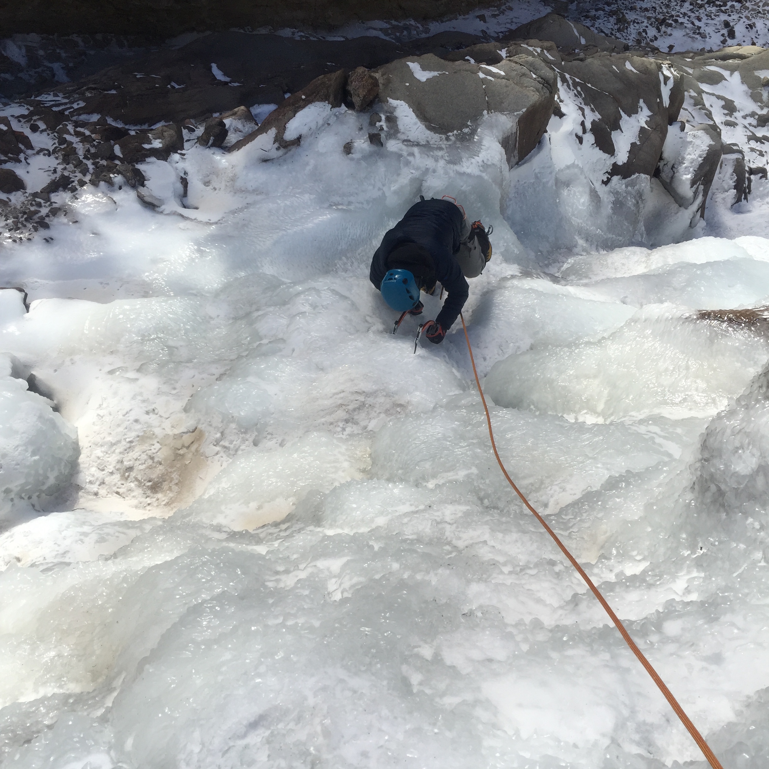 As of 1:00pm on 12/3, the approach to Silverplume was frozen solid - crampons made the smoothest and quickest access to the base of the mainflow.