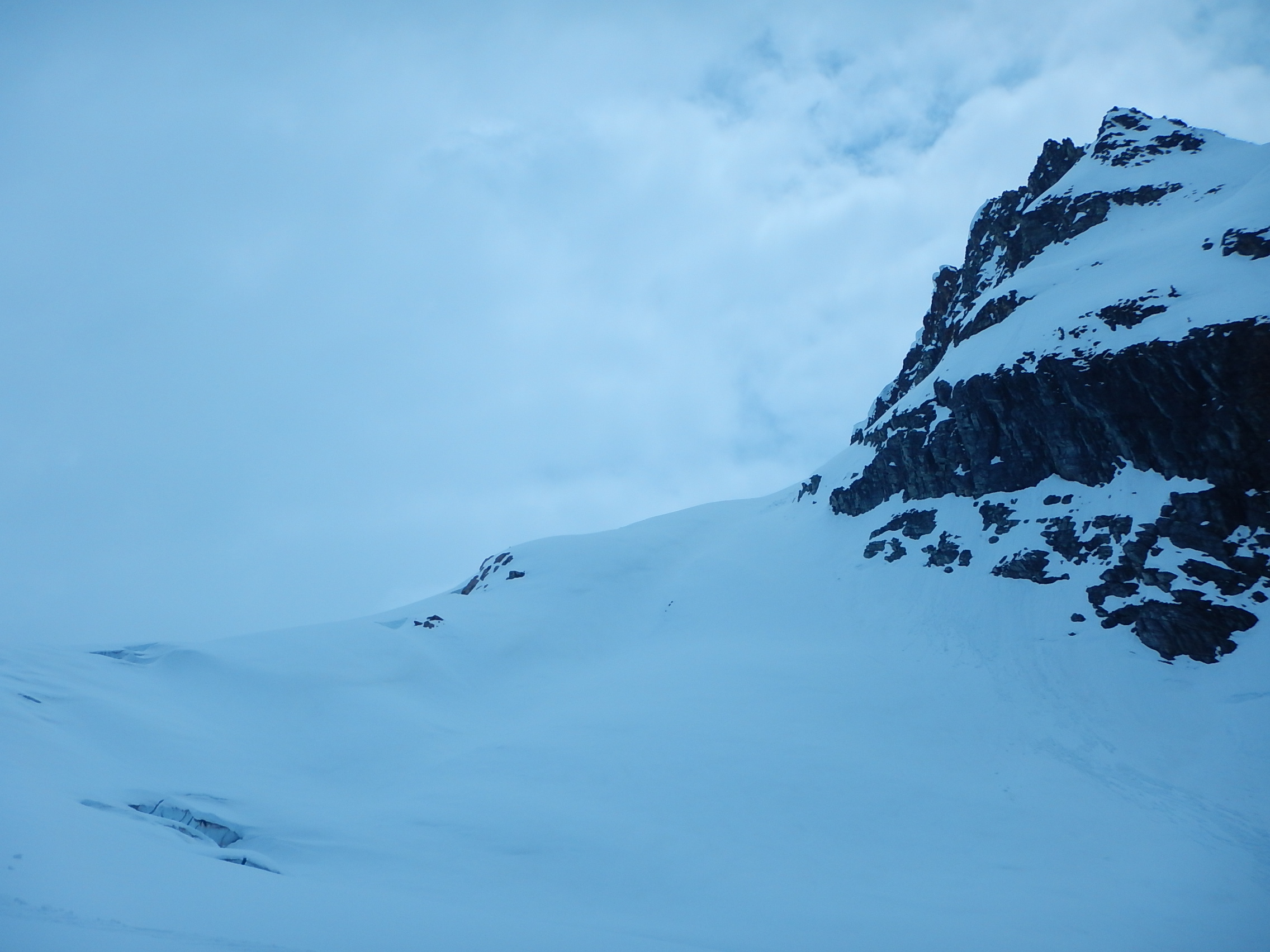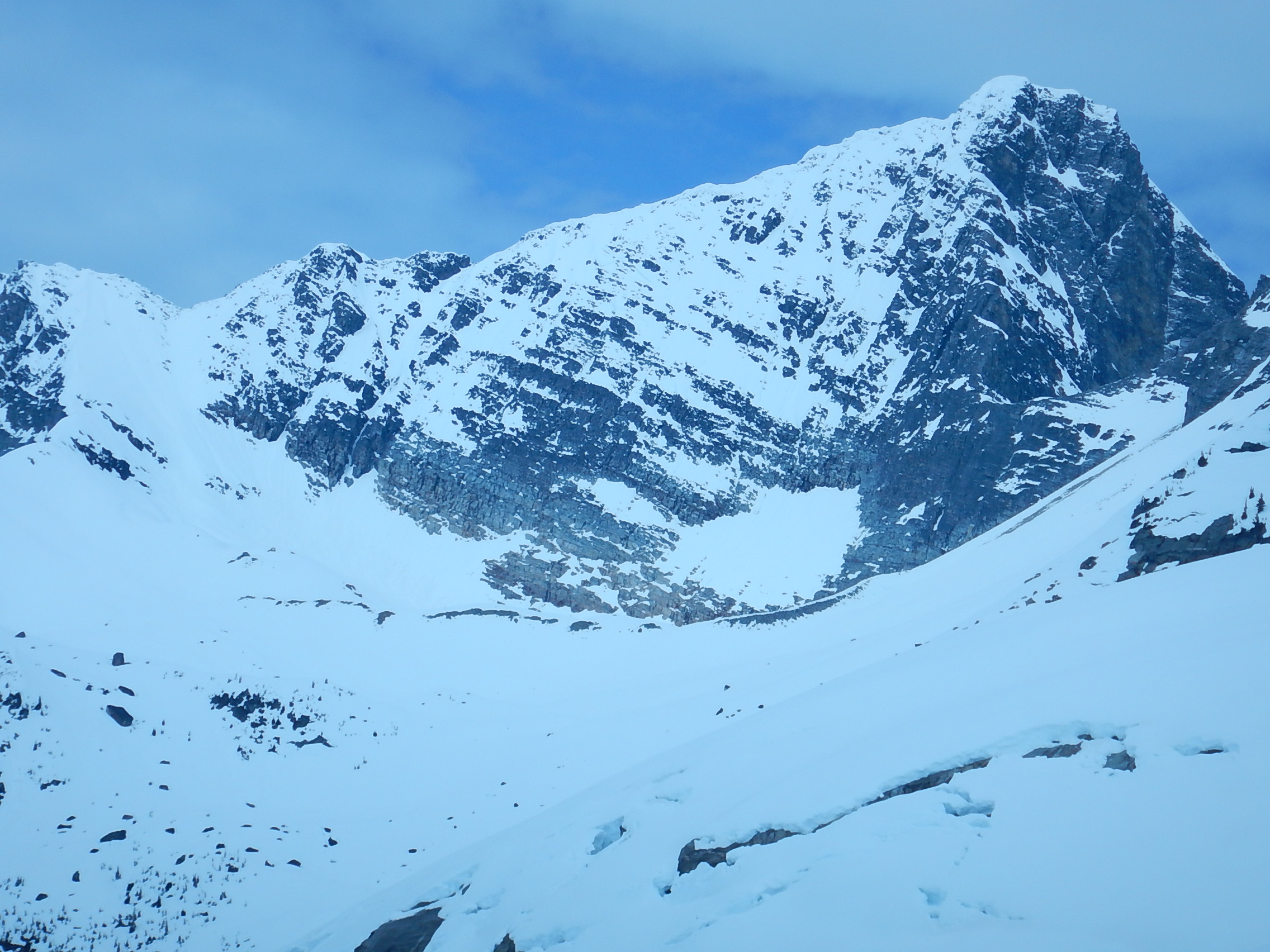 On many large steep slopes, 2200m and below, there were glide cracks and lots of crinkling visible - these slopes are unpredictable for sudden failure. The descent/approach up to the toe of the Illicillewaet does not look like a very attractive place to travel through right now, unless there was a strong overnight freeze.
