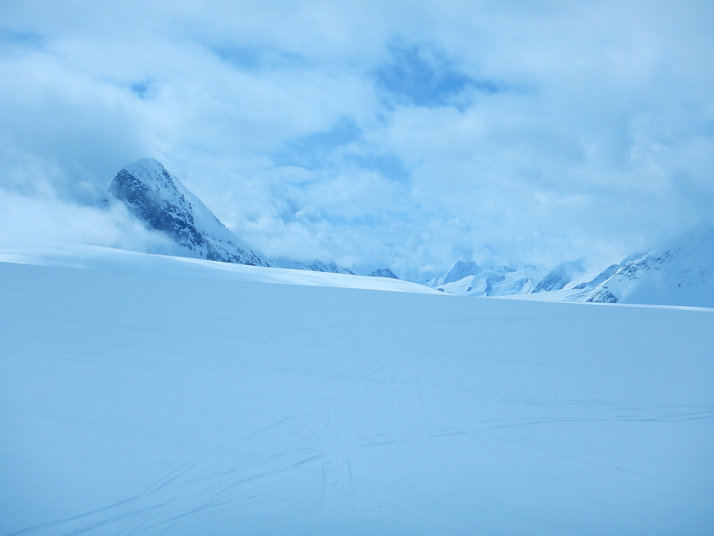 During a mass balance glacier monitoring field trip, we were able to get snow depths from the higher glacier to the toe. At 2500m there was 5 to 6 metres and gradually decreasing to 250cm at the toe of the glacier. Travel conditions were 0 ski-pen in the early morning and by mid AM the crust started to break down with 5 to 10cm ski-pen. At 2200m the snow became isothermal and many sags were visible but few open crevasses. Some areas on the lower toe before the steep roll over we probed 80cm down to glacier ice.
