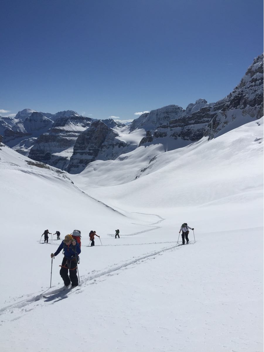 Our group of 8 skied up the Chickadee Valley today. We started early to beat the solar effect and heat. There was evidence of avalanche activity from March 16th as we skied up the valley, but -7C temps kept the slopes locked in for the morning.