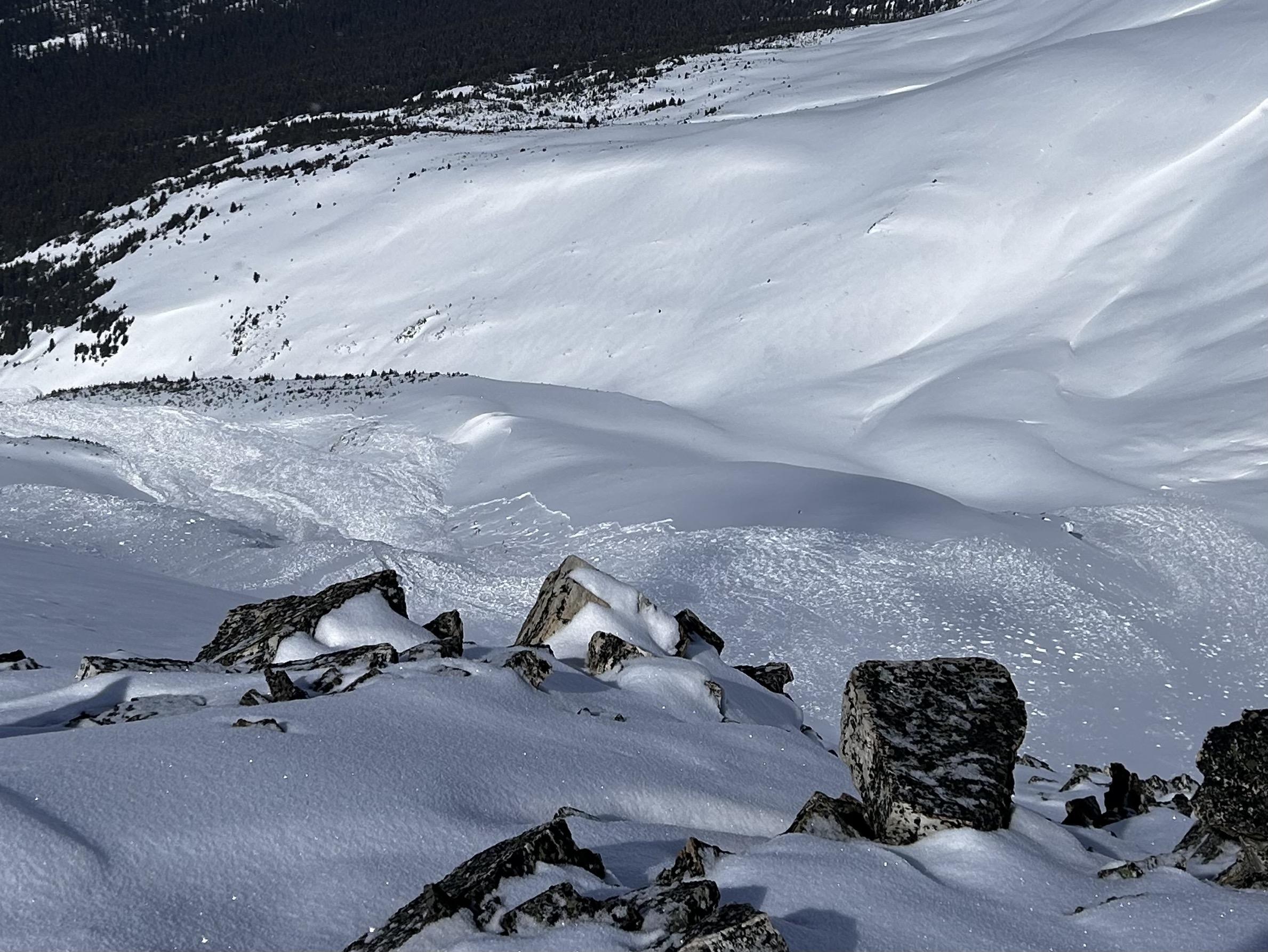 Attached is a photo looking down on a large avalanche (size 3) on Observation Peak. It failed on the deep persistent layer, probably during the big avalanche cycle almost 2 weeks ago. This is similar terrain and snowpack to the terrible accident which occurred yesterday near Lake Louise. This layer has not gone away, and the late March/early April crust problem is not going away either. For both of these problems the first "sign of instability" you may notice is when the slope is avalanching all around you. The same warm, sunny weather that makes us relax and think all is good in the world is a big part of the problem right now as it is also helping cause the instability.