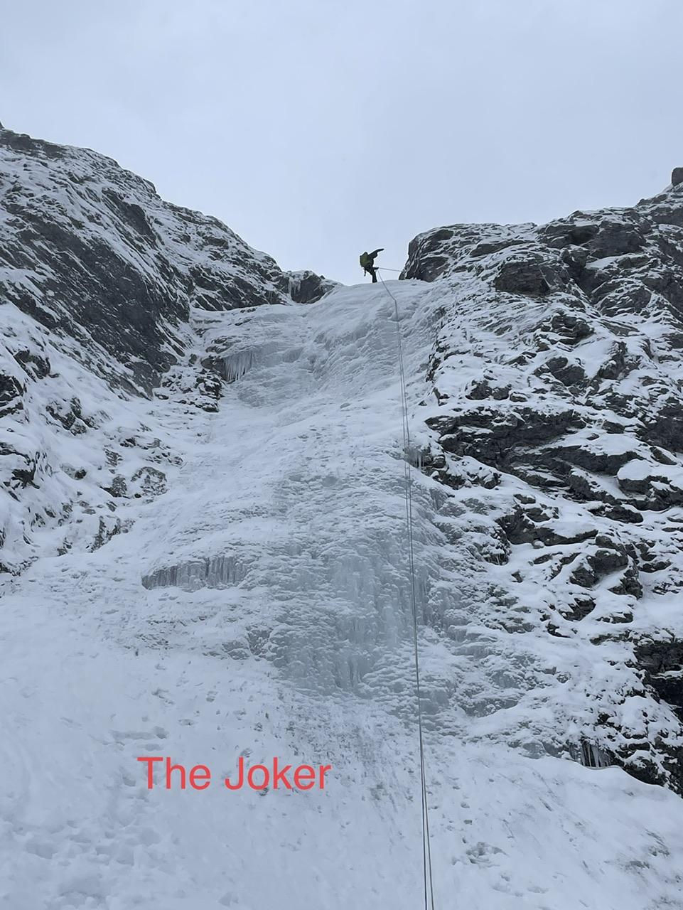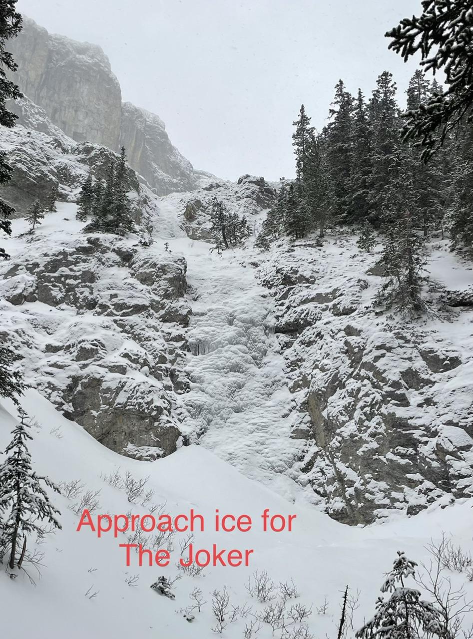 Guided The Joker yesterday in the south Ghost. The climber’s left approach ice was in though thin and hollow in spots. The Joker itself was in good condition, took 10-16cm ice screws, but was hollow and thin in spots too. The most challenging point of the day was figuring out where to best traverse into the base of The Joker because unsupportive snow was hiding lots of down sloping rock slabs which is quite tricky to travel over. Good route selection here is important to avoid a tumble.