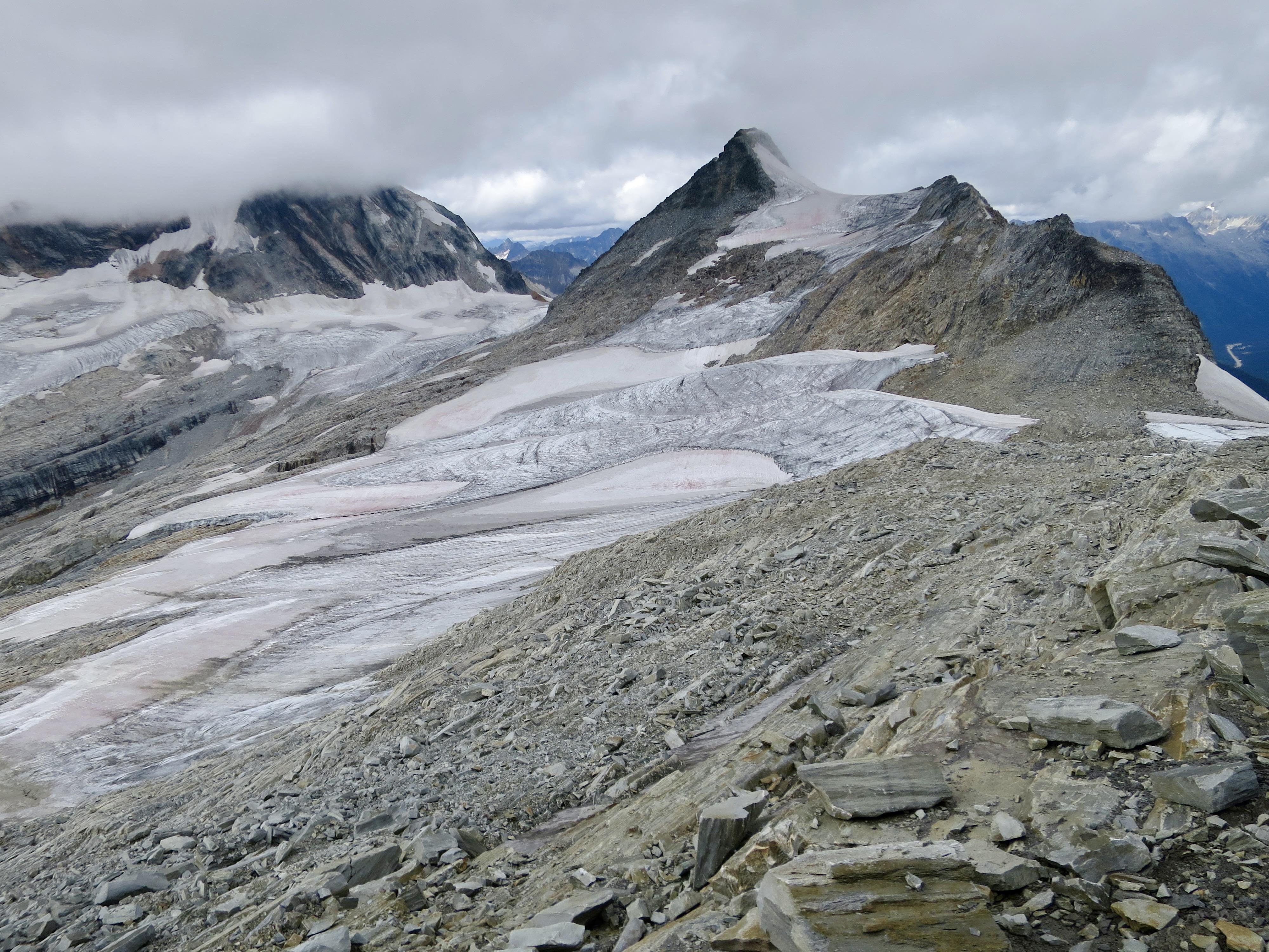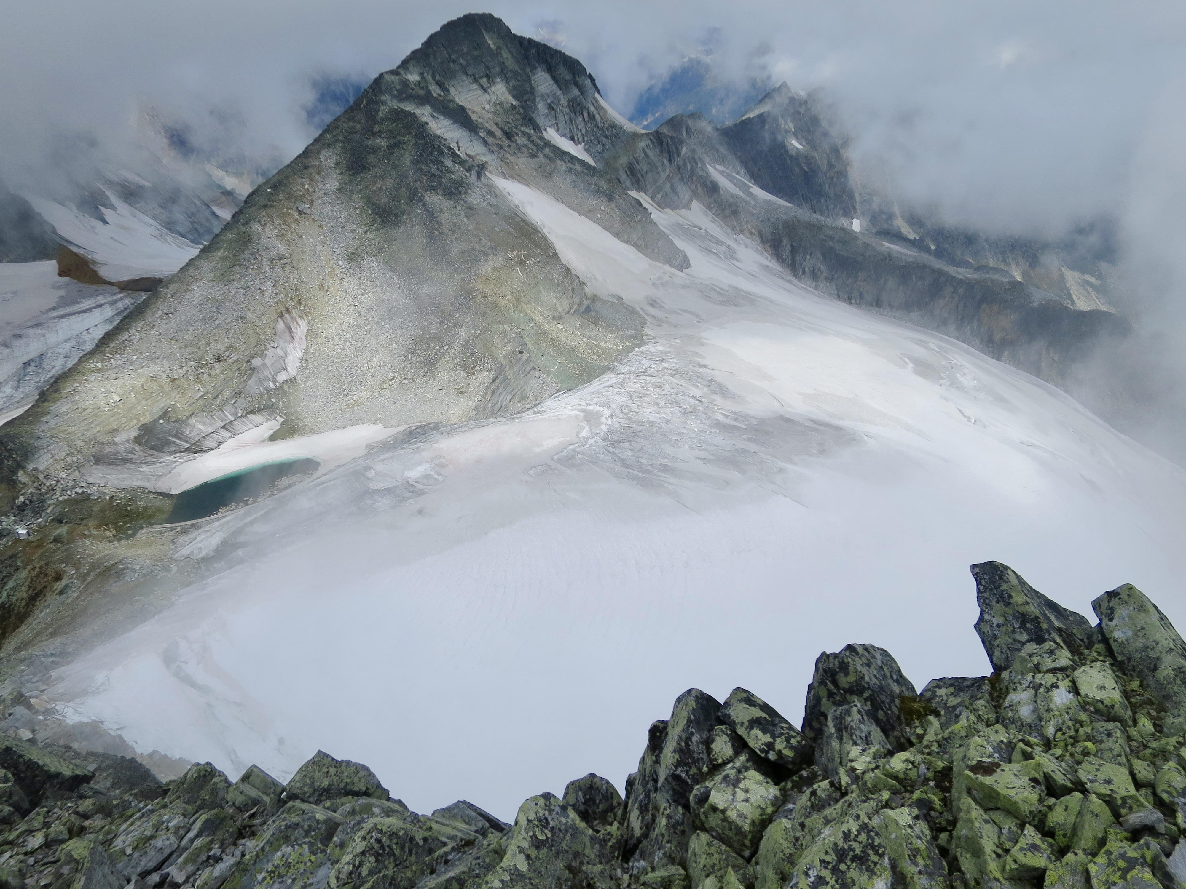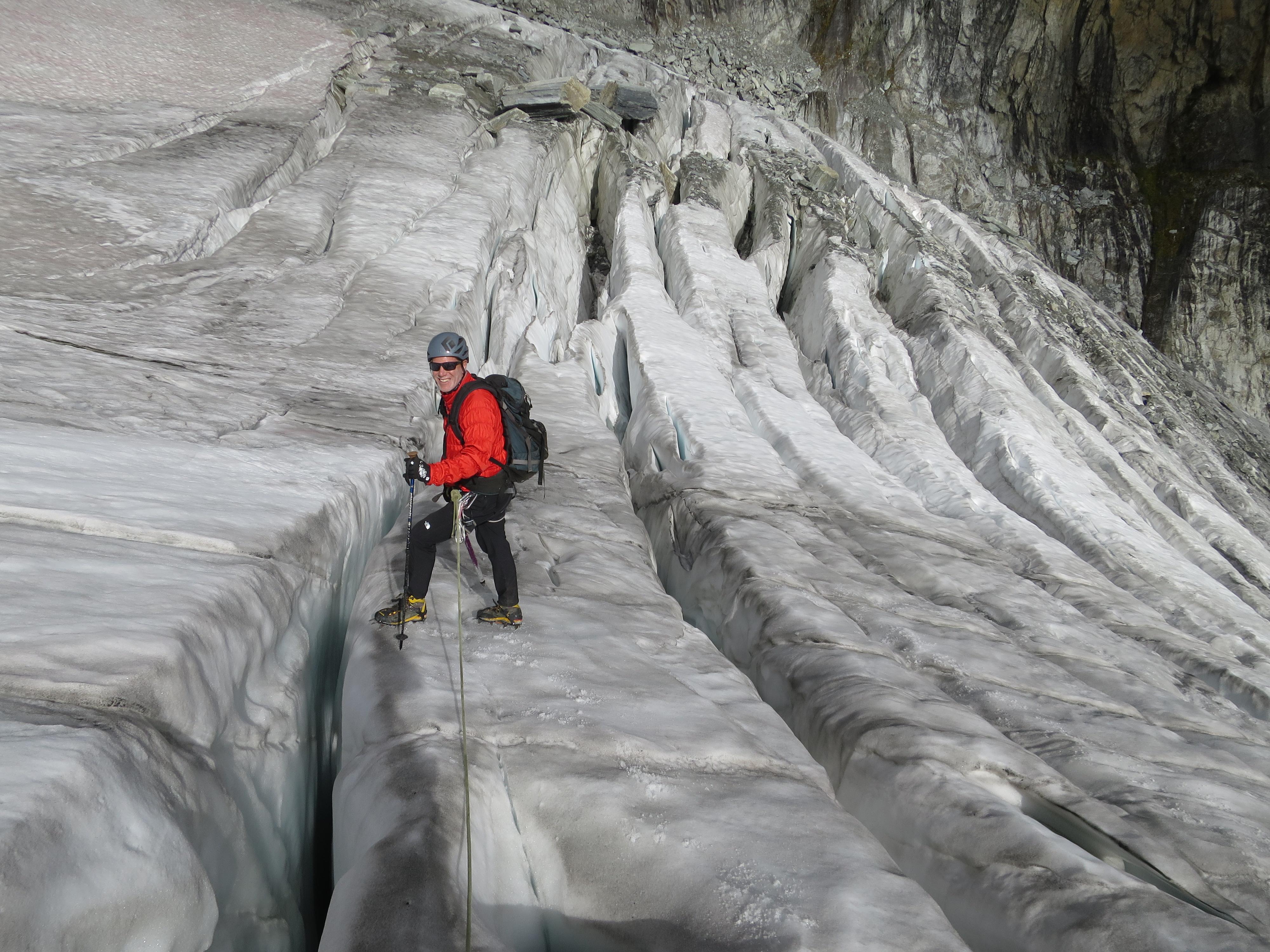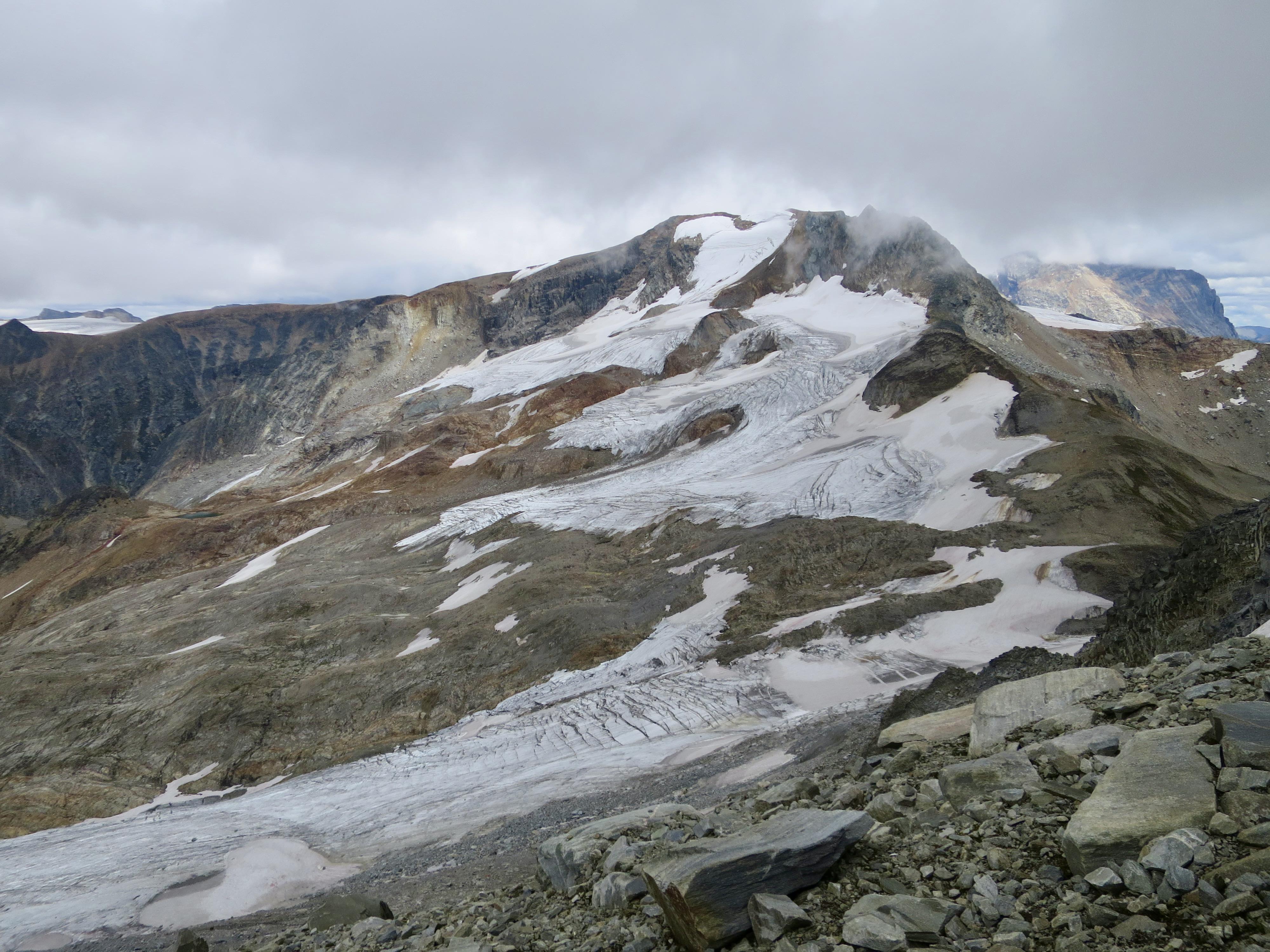 Neil and I traversed Mt Jupiter today, approaching from the Asulkan valley and Sapphire Col, descending via Asulkan Pass. The rock was a bit damp in places, requiring some care. The glacier was dry up to the bench at around 2350m, and also had some dry sections above including Sapphire Col. The lower glacier was quite a maze of crevasses; we had to climb in and out of a couple. The upper glacier had some crevasses with big dark caverns and ice bridges ice bridges less than a metre thick. It was sometimes difficult to tell if we were walking on ice or snow plugs or something in between.