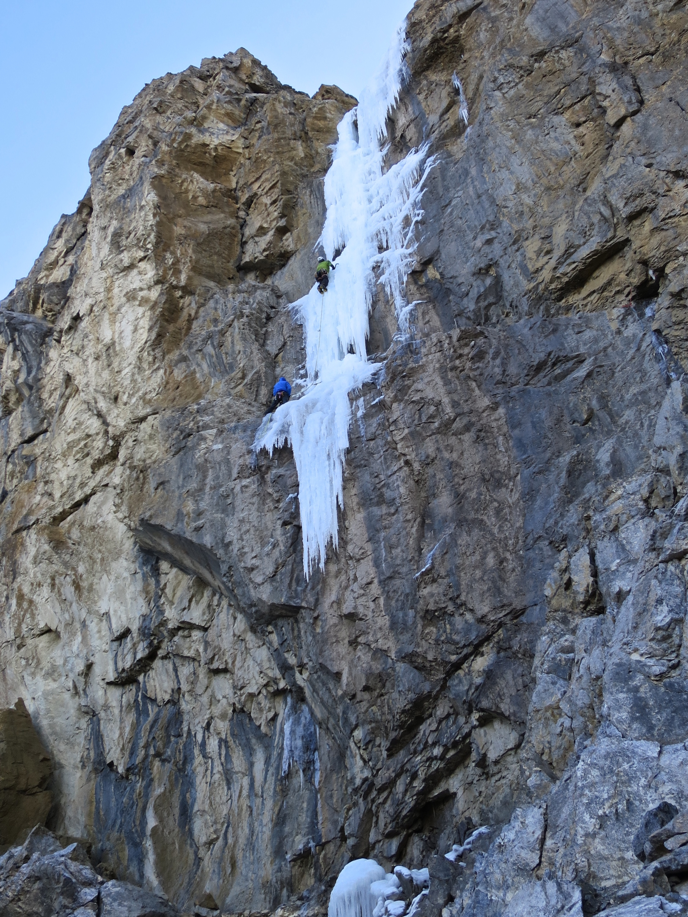 There was no ice on the mixed crux, but there seemed to be more fixed gear than I remember and it protected well. The ice on the final pitch was in good shape, although a bit brittle.