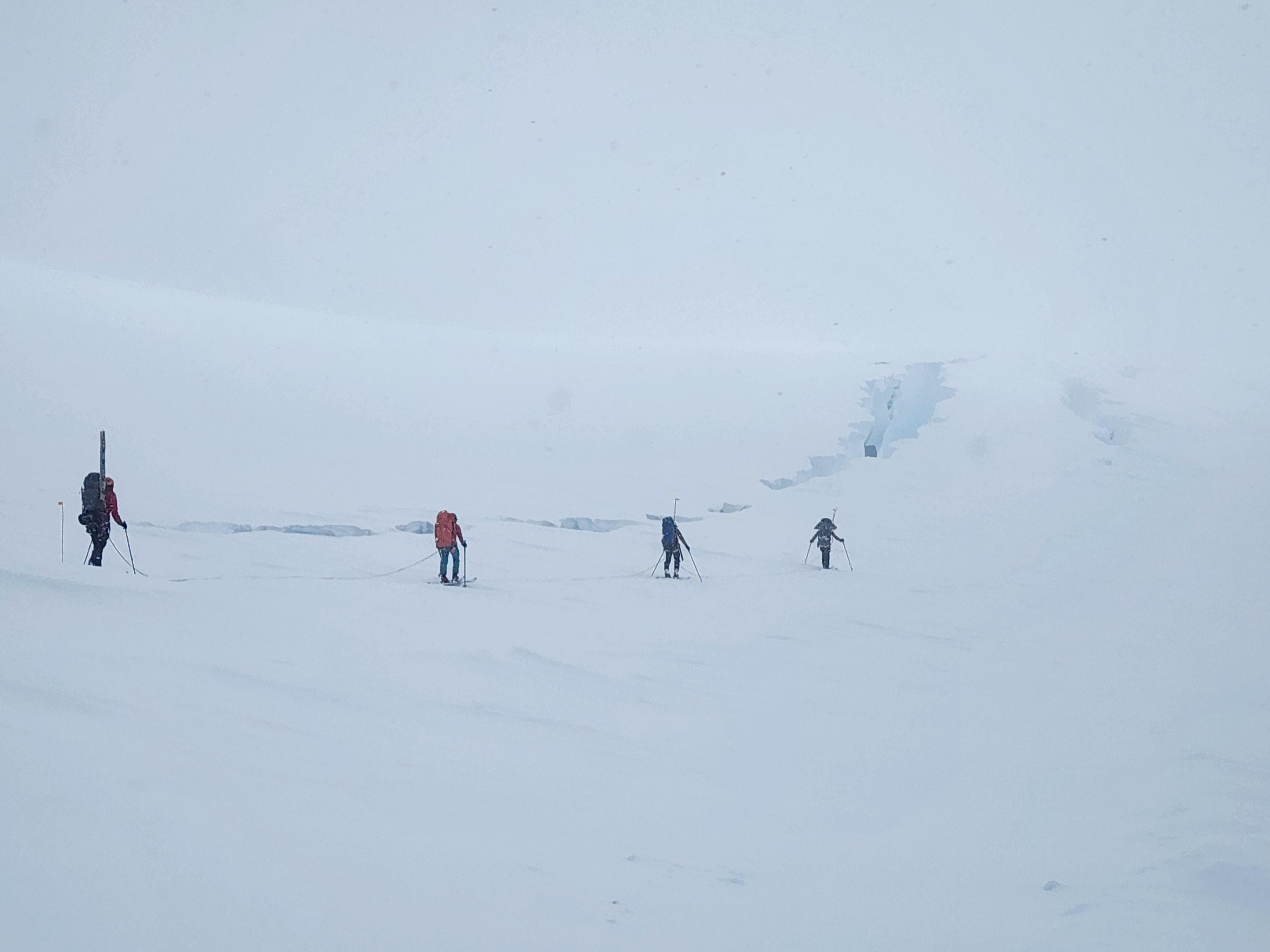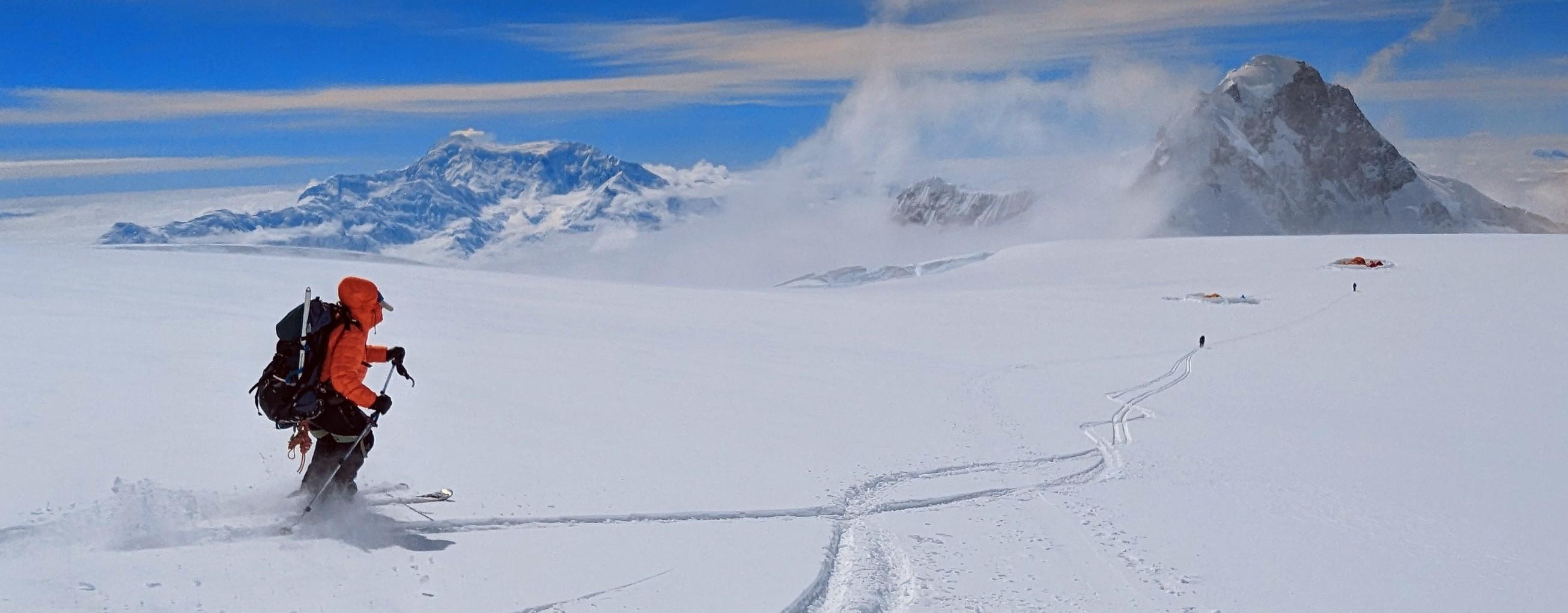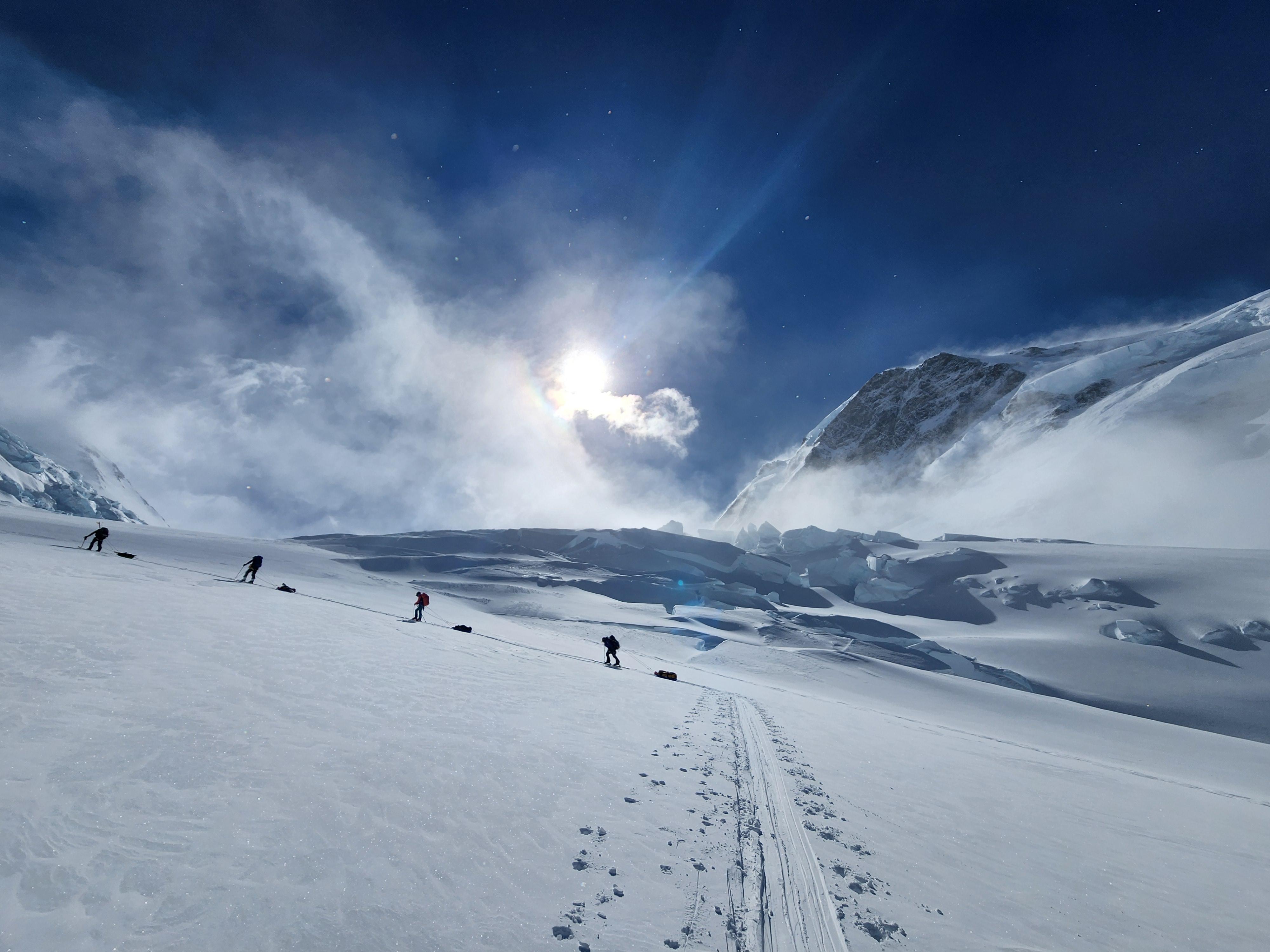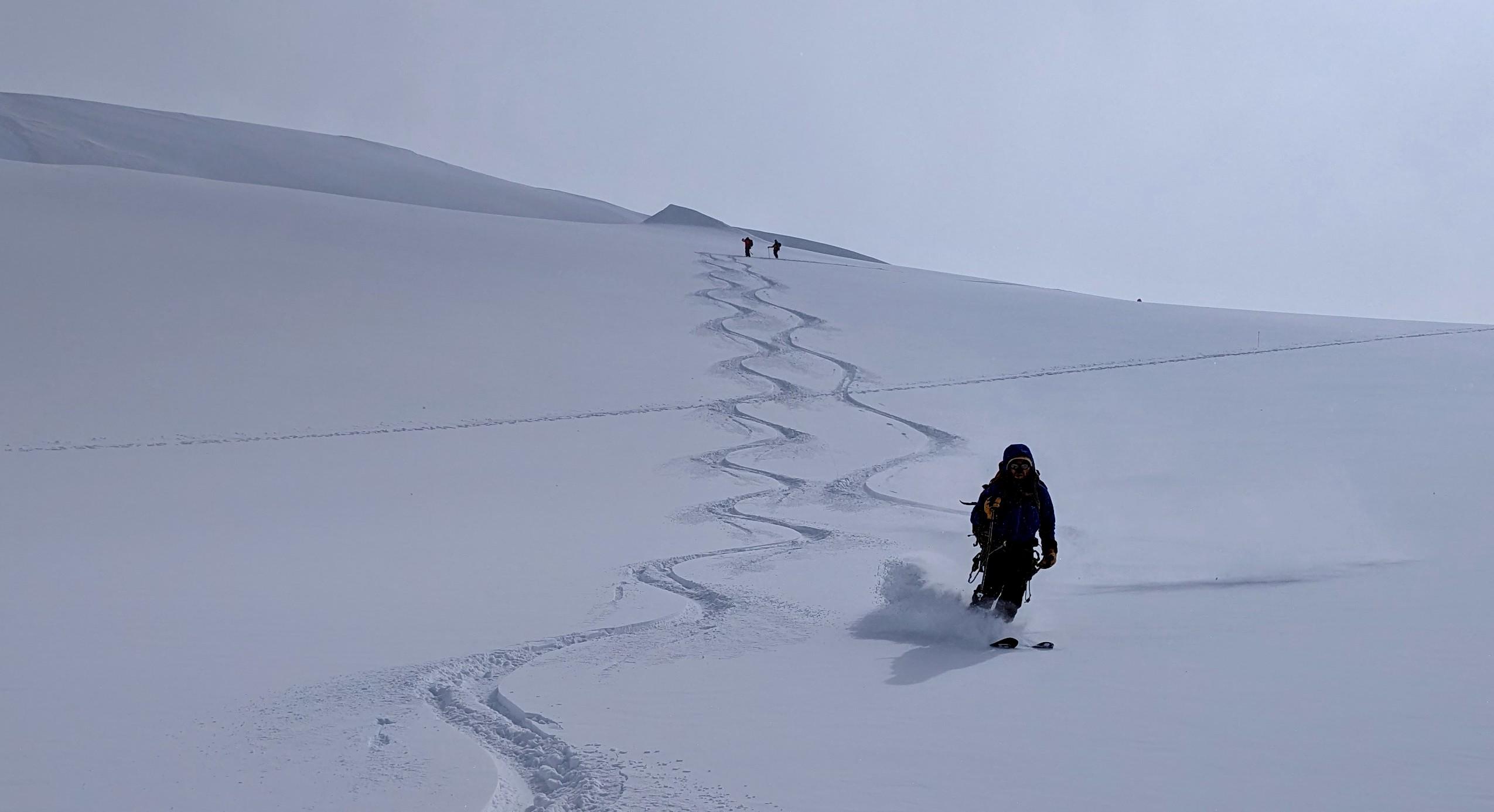 Traveling conditions, snow coverage and crevasses were generally excellent this year. Snowpack depth on glaciers was greater than 250cm and increased with elevation. Thinner snowpack areas were observed in some wind exposed locations. The crevasses and snow bridges above the King Col headwall (4200m) felt spicy but intuitive and more manageable then in previous years. Similarly, the crevasses and tension areas immediately below the Football Field (around 4800m) were well covered and easy to navigate this year. That said, a long open crevasse below the Queen Peak icefall (4550m) was tricky to navigate this year. A series of intermittent bridges, varying in thickness, had to be negotiated there. It will be interesting to see how this one evolves over the next few years. There appears to be other more challenging options around the East side of this crevasse which may become useful in the future.