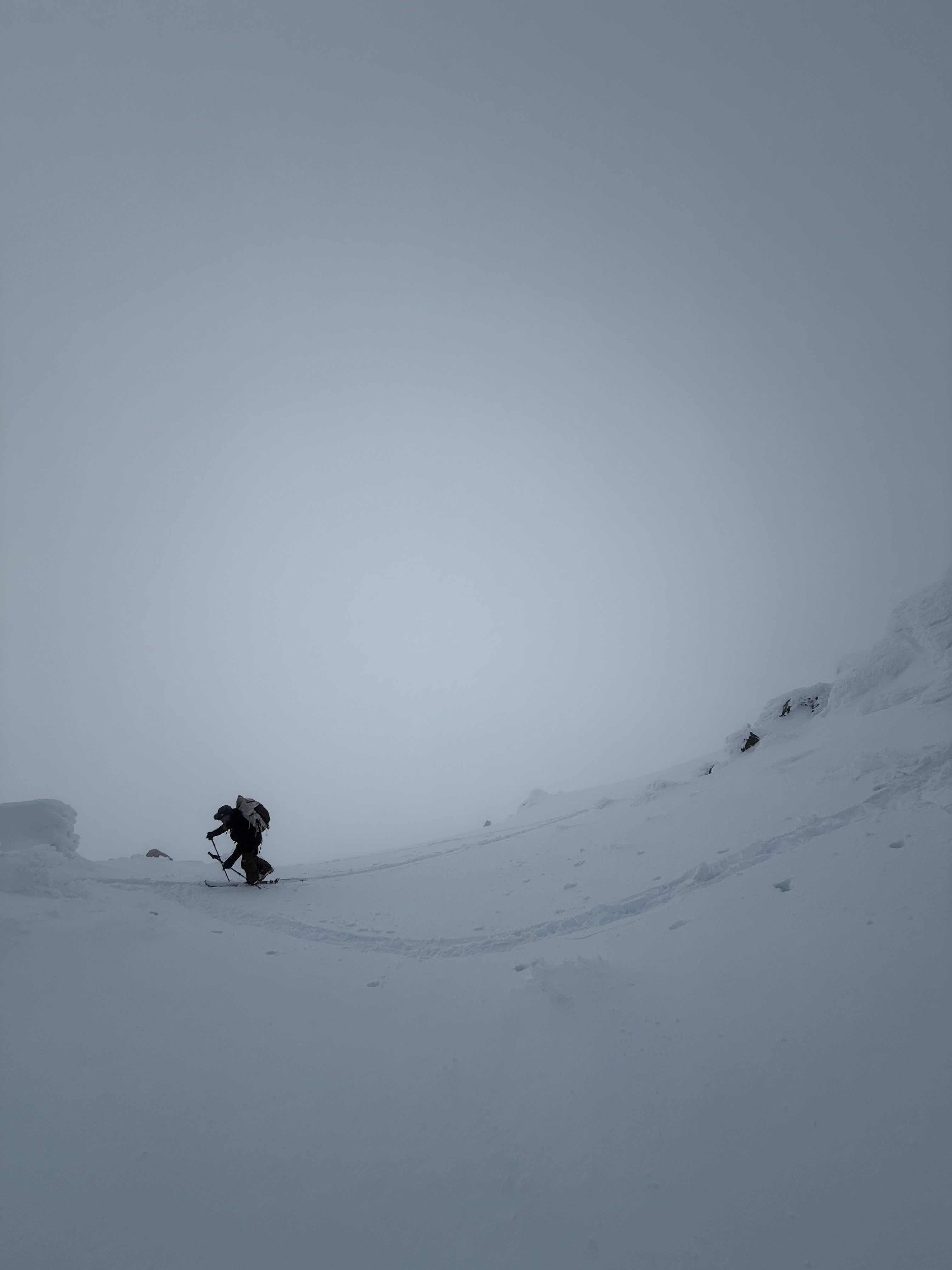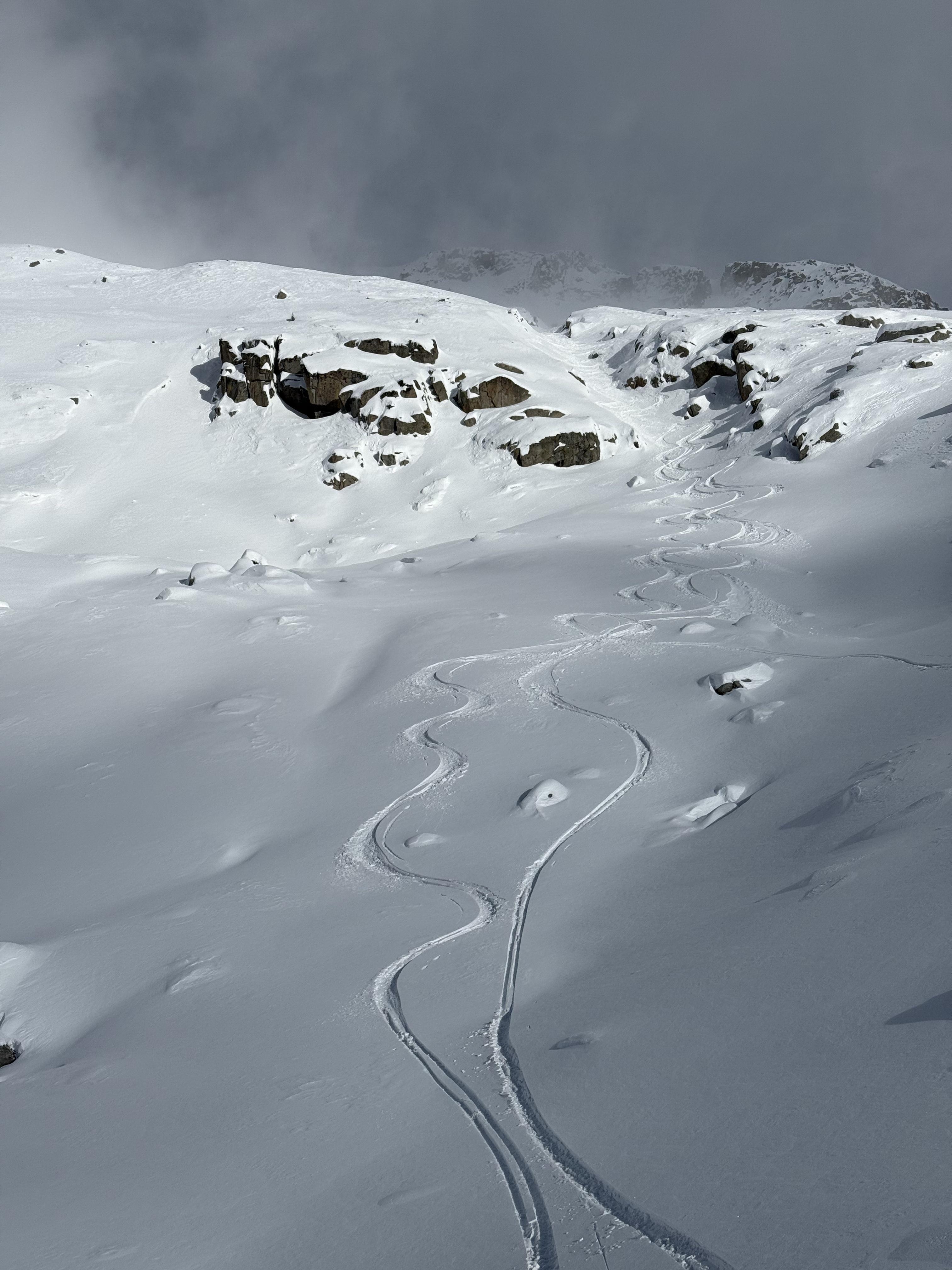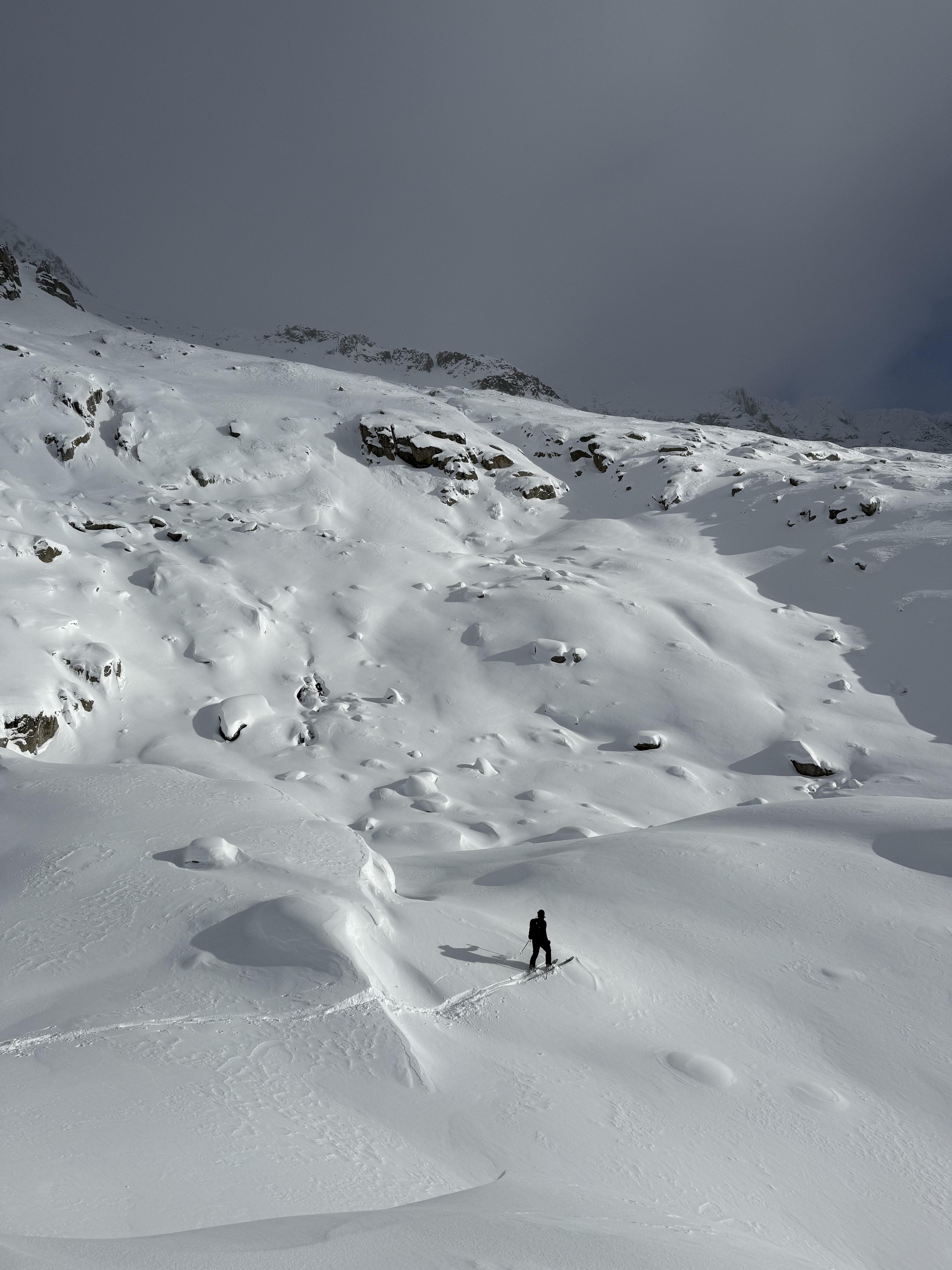 SNOWPACK: 4cm new snow overnight. At treeline and above there was evidence of recent westerly wind effect, creating a variety of surfaces: exposed sections of the Nov 21 crust, a soft 10cm windslab, and deeper drifts in the troughs. On average, the Nov 21 crust is down 40-70cm in the alpine, with pencil to knife hardness in the 2000-2400m range, and ~1cm thick and breaking down as we approached ridge top at 2700m. Below that is a crust laminate complex of ~30cm. Average of 1m snowpack above 2000m.