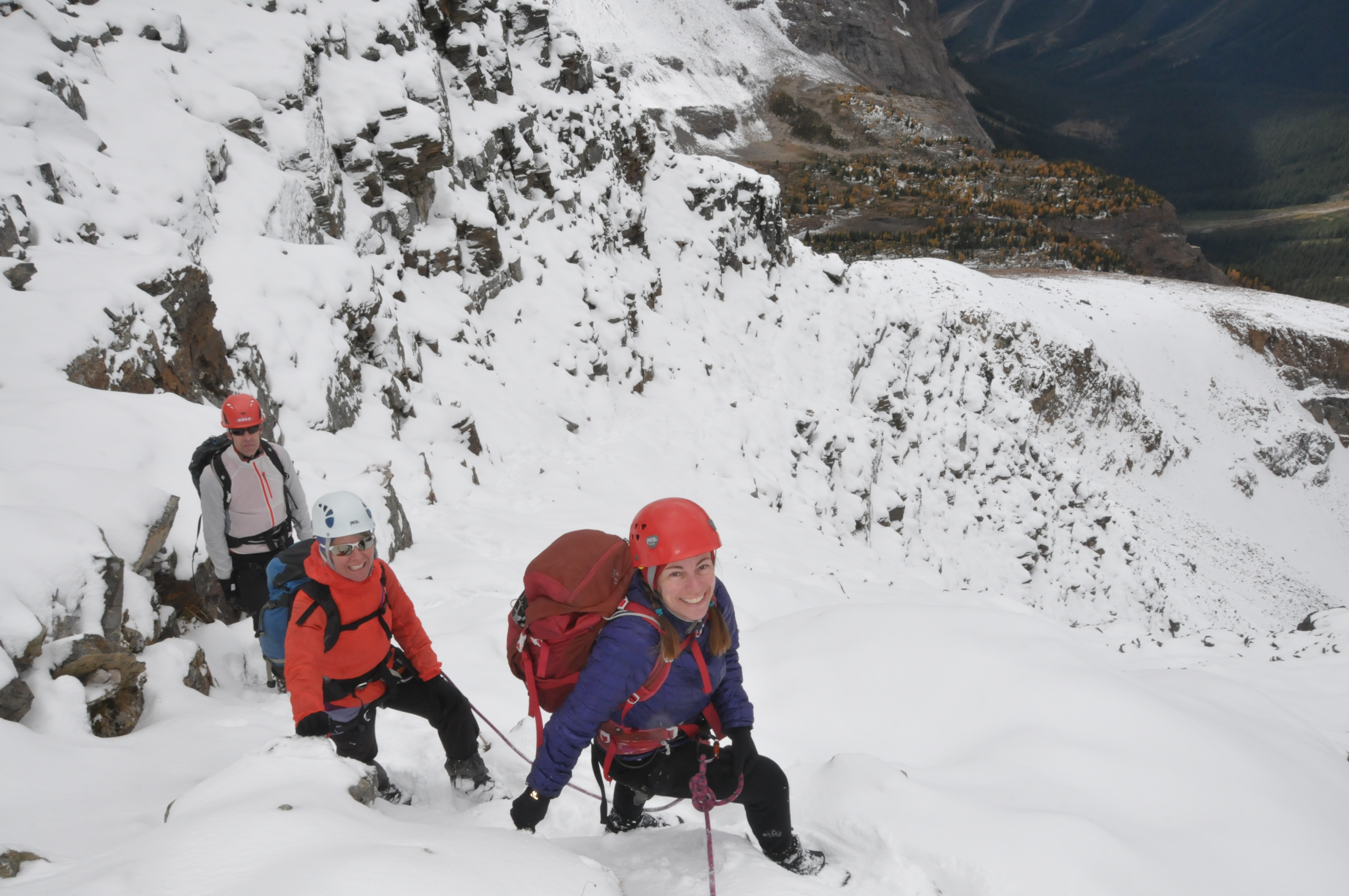 We spent September 23-25 at Lake O'Hara. The snowline sits at around 2200m, but in the past couple of days it may have melted back. We hiked in the Oesa Lake, Opabin Lake and McArthur Lake areas, and we climbed Mount Shaffer on Saturday September 24th. We found up to 20cm of snow on Mount Shaffer that made for good steps, and we didn't use crampons. The larches are in fine form!