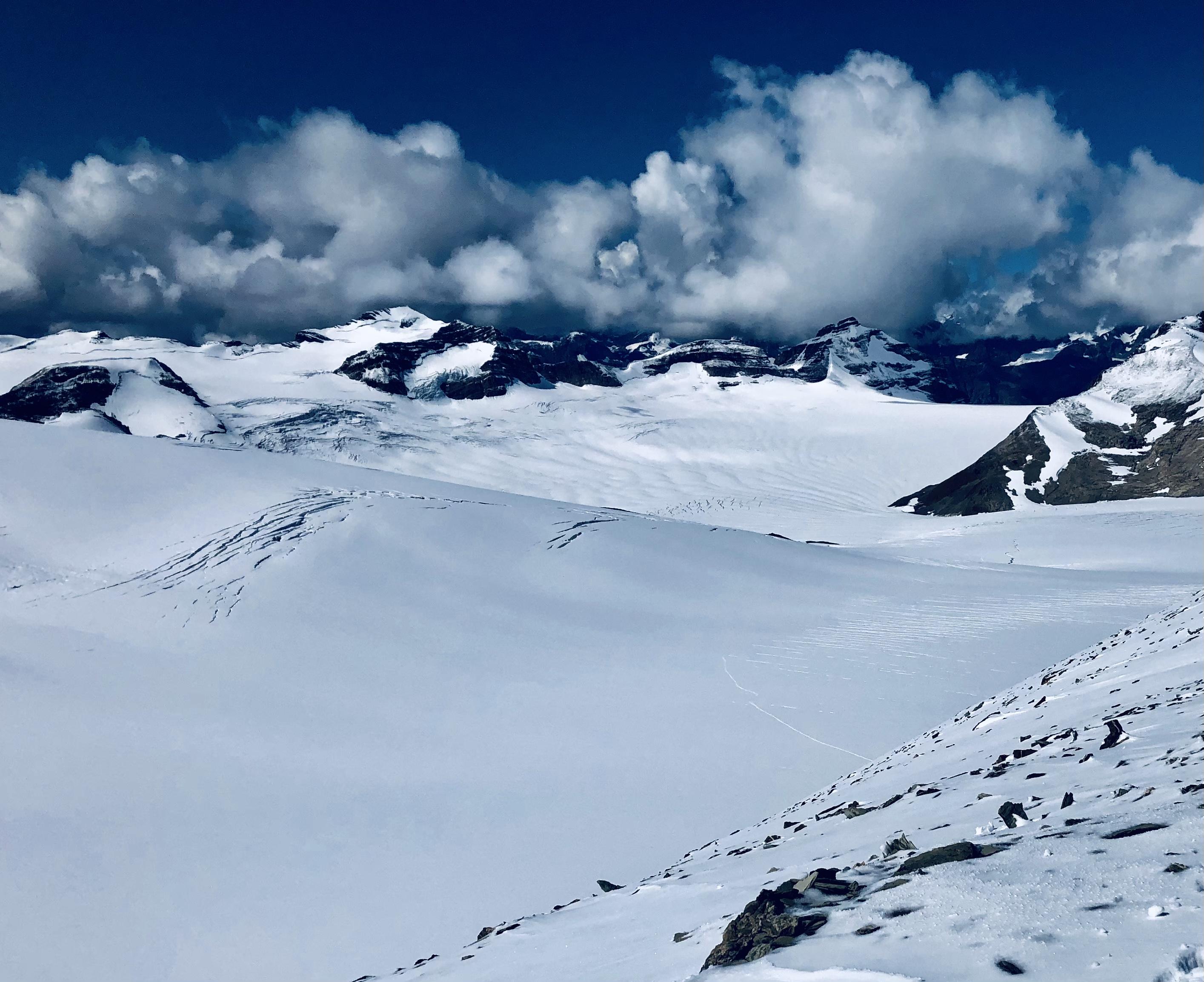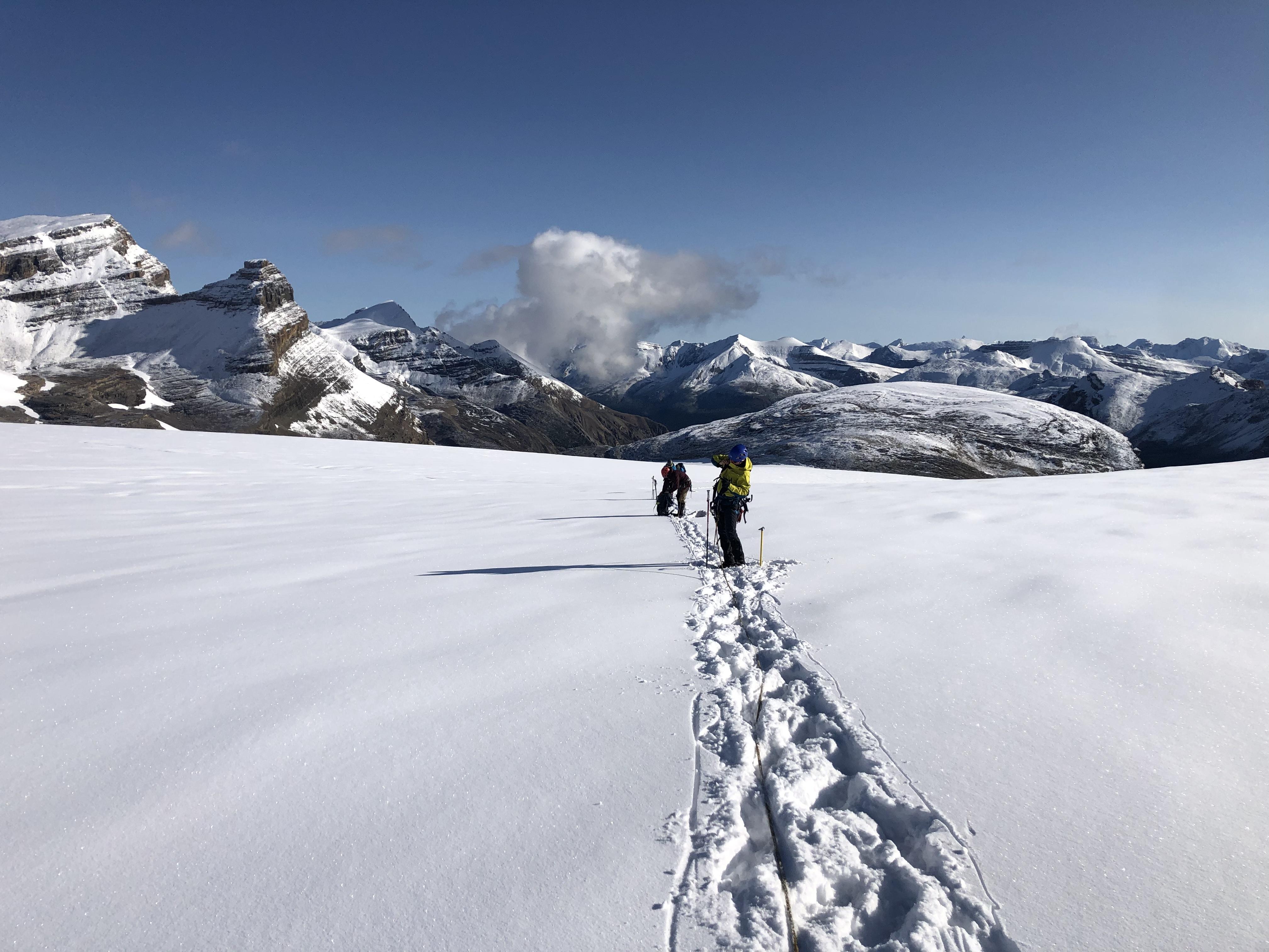 The snowfall from last weekend left up to 40cm at higher elevation that fell with very little wind. There was a thin wind slab at 2800m that was enough to hide crevasses. Continuous Probing and lots of people on a rope was essential to safe passage. Places of note are from the toe of the Bow Glacier on the steep break over and right above the onion skin all the way to directly below the Olive/St. Nicolas col. This area is blocked by impassable broken glacier.