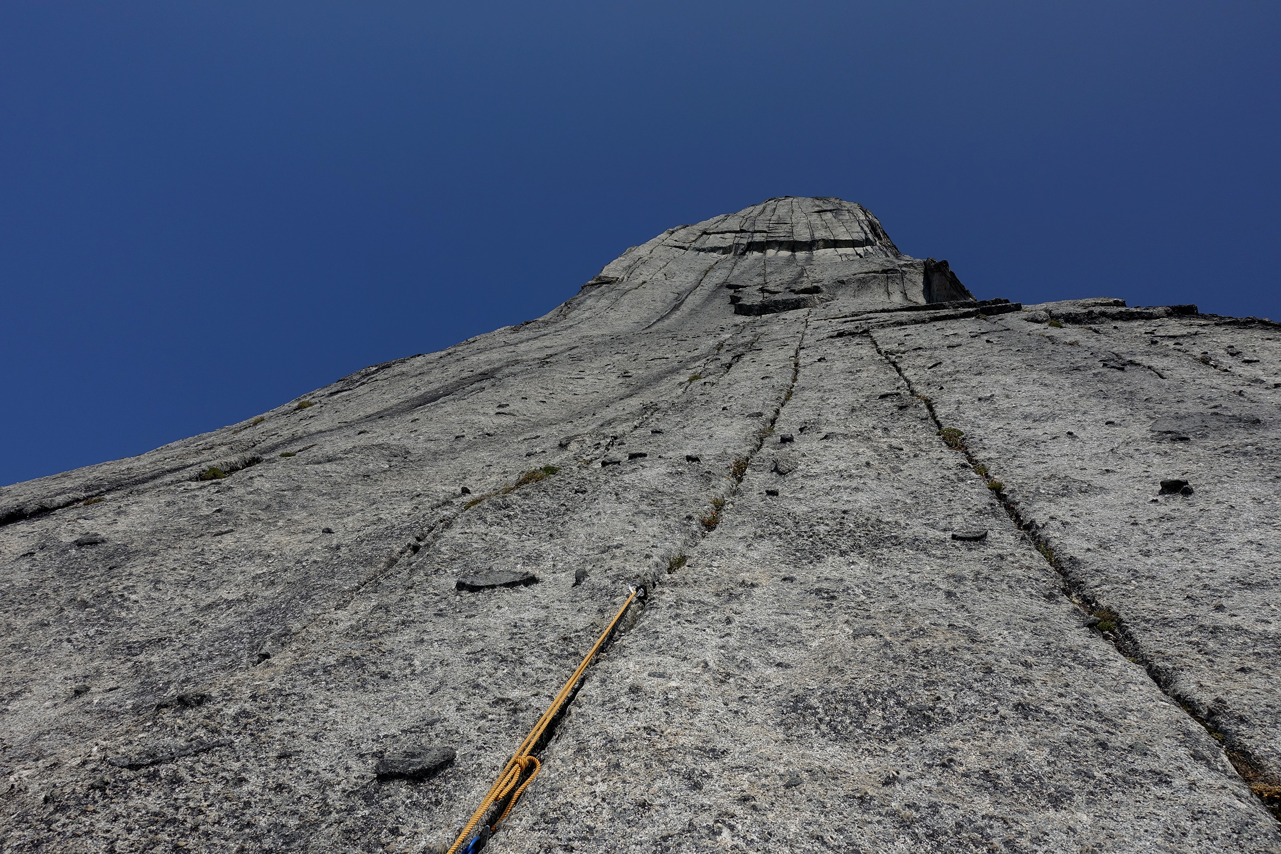 The climbing route was in good shape despite the first few pitches being a little wet. By the time we rappelled back down everything was completely dry. The pitch 10 bivouac ledge was dry and comfortable with a party of 4. The headwall was dry and in great shape despite some of the thinner initial cracks being a little dirty. The rappel route was straightforward and easy to locate however, some of the aging slings will need upkeep. Some of the rappels had potentially loose flakes and required good rope management.