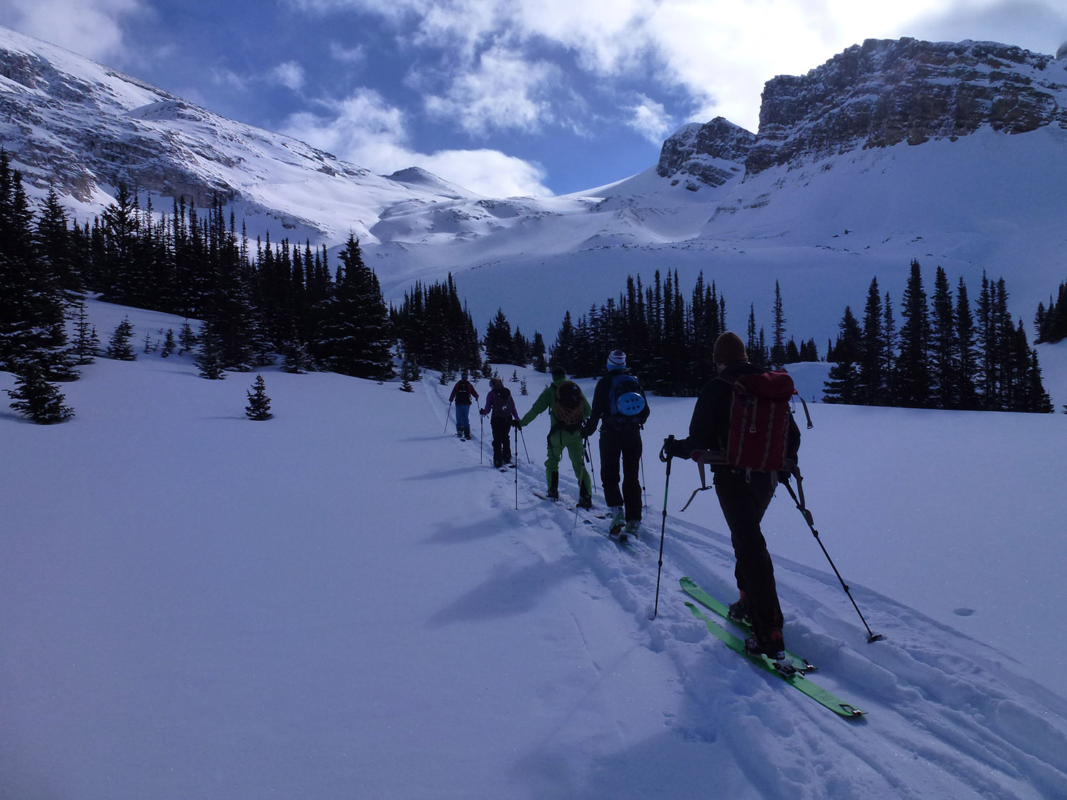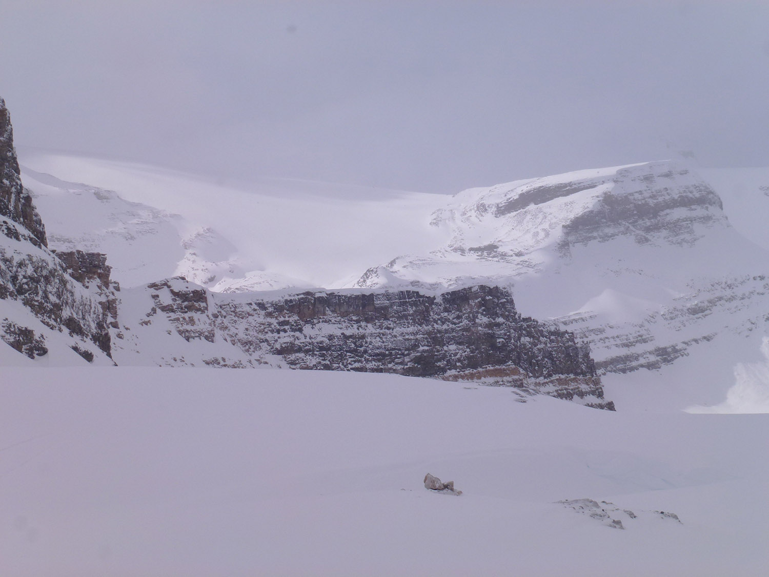 Today we skied the north facing glacier on Little Crowfoot Peak in the Bow hut area. We skied supported alpine and treeline terrain to 38 degrees. We had scattered skies in AM evolving to mainly overcast in PM with cooler temperatures ranging from -12.0C to -6.0C. Winds were light to moderate out of the South and there was evidence of yesterdays wind transport at ridge top. Ski quality was consistently good to excellent despite recent winds. Traveling conditions were also excellent and ski penetration was in the 10-15cm range. We measured over 230cm of settled snow on the glacier, the snowpack here felt firm, supportive and evenly distributed. We observed numerous passive whumpfs in shallow snowpack areas (moraines) between treeline and the toe of the glacier. We saw no other signs of instability and no new avalanches. Our main concerns were steeper shallow snowpack areas and recent wind slabs; the later concern was absent in this area today.