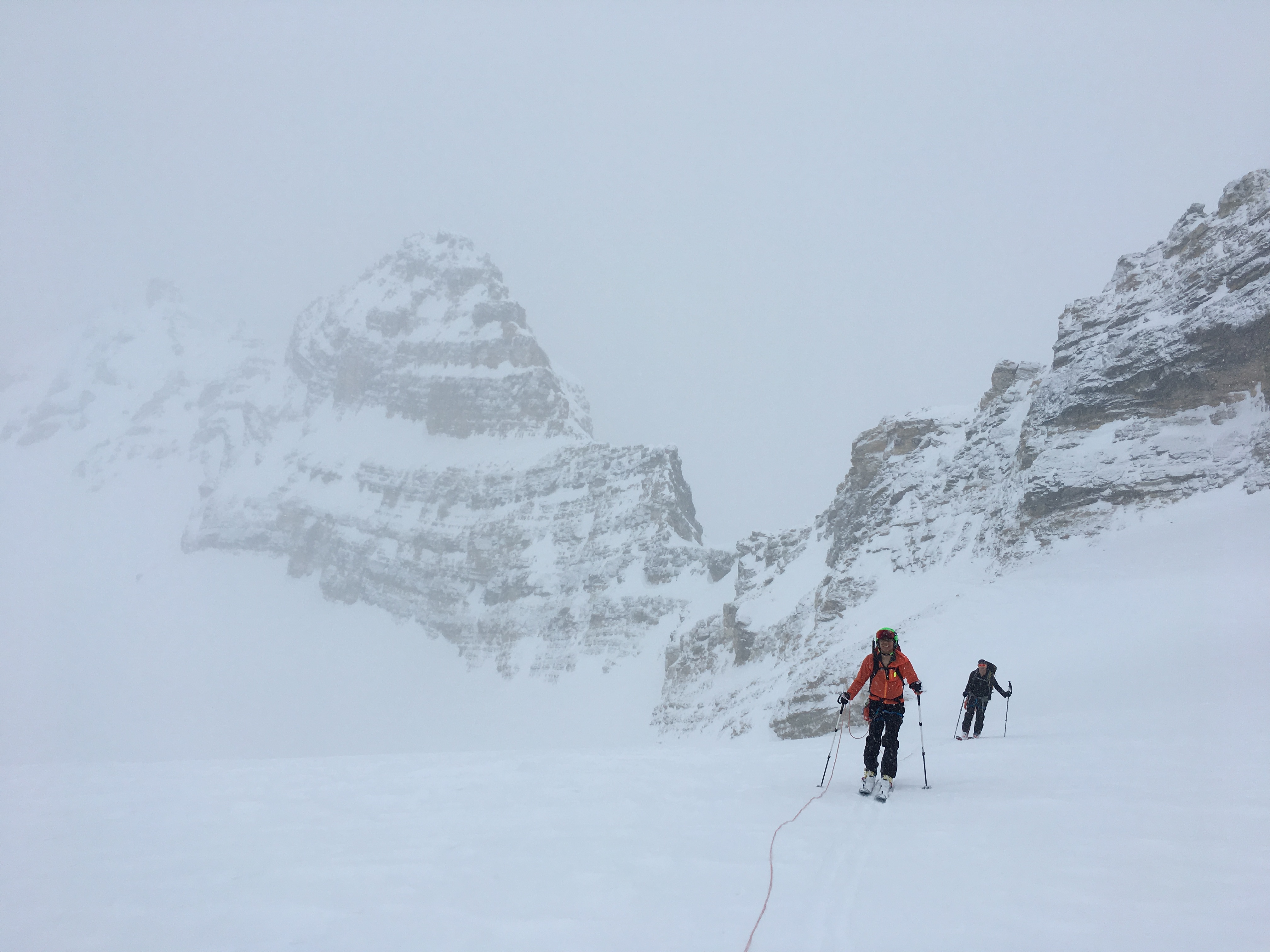 Despite the white, we toured up to Kiwetinok Pass and around the Kerr peaks. We were able to reach the President-VP col and the base of McArthur's north ridge. Glacier coverage was excellent and skiing very good especially above 2300 metres. On 8 April, there was 20 cm of storm snow at 2900 metres.