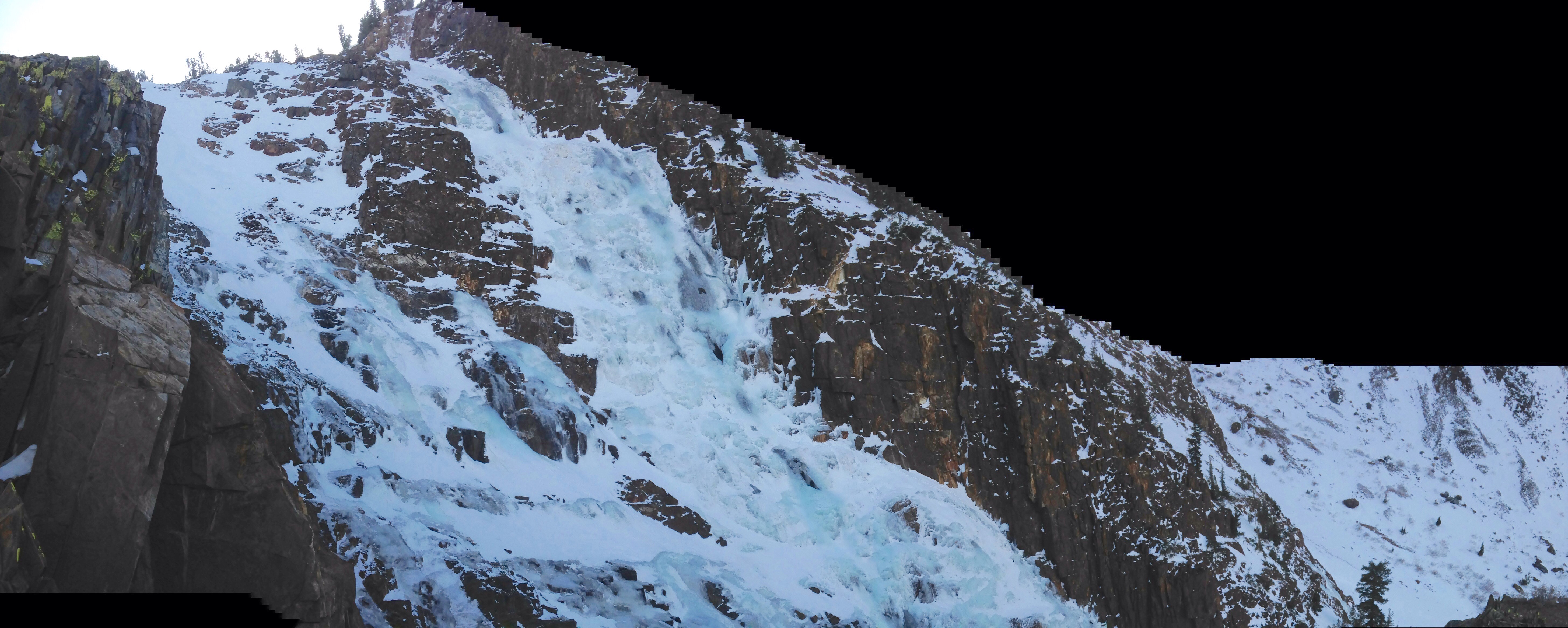 Route has mostly good ice with some hollow sections and thin ice over running water. Most of the truly funky stuff was avoidable by staying along the right margin and then crossing over the open water at the beginning of the 3rd pitch.