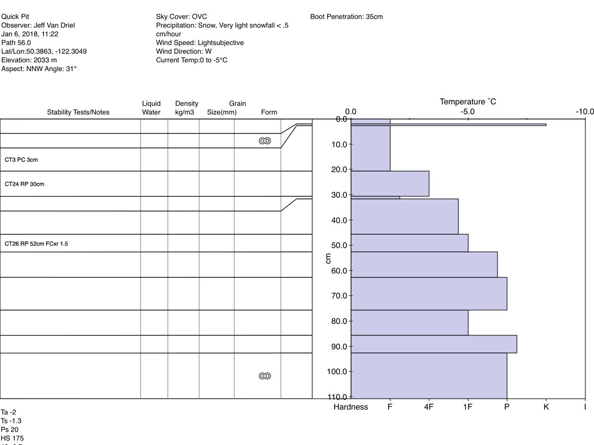 Test pit on a 31 degree NNW aspect at 2030m with a snowpack depth of 175cm, produced a CTE PC down 3cm just below the surface crust, CTH RP down 30cm at a density change, CTH RP down 52cm on the 171214 interface on a mix of rounds and facets 1.5mm.