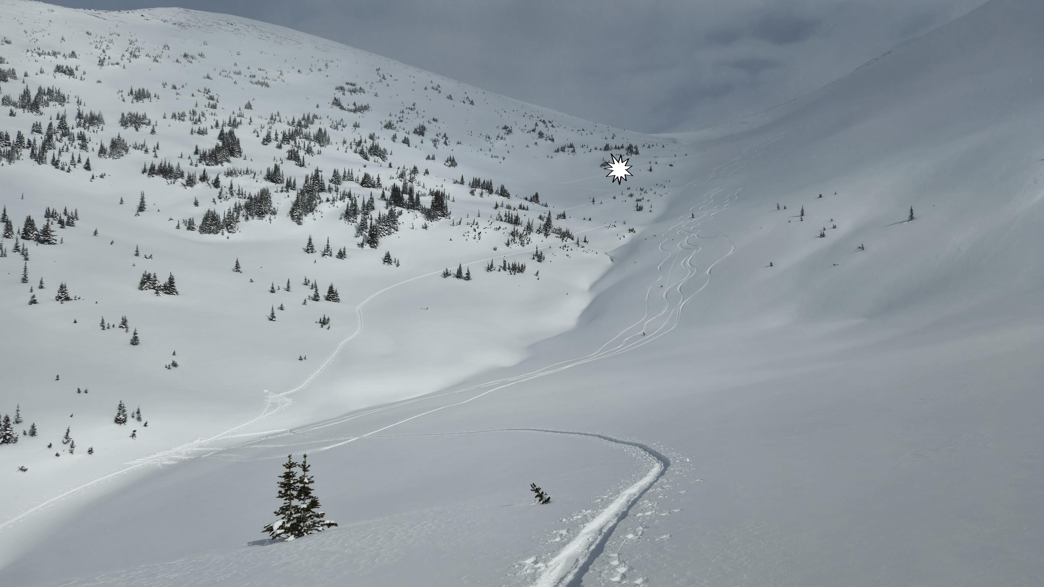 We saw no new natural avalanches; however, we had several whumphs over the course of 2 days. Most of them were in shallow, rocky terrain indicating a "thin to thick" scenario. As a result, we stayed away from rocky ALP features and stuck to more supported terrain in the ALP. We also had a whumph at TL, likely due to an isolated spot of buried SH. Of significant note was a major shooting crack on Sunday that propagated over 20m wide on a S-facing, wind-exposed, shallow, lower ALP feature (see star on photo). What was surprising was the 1cm thick crust on the surface with dry, low-density snow underneath. This just shows how sensitive that buried weak (FC) layer can be and how we need to continue to exercise diligence right now even if there are no obvious signs of instability.