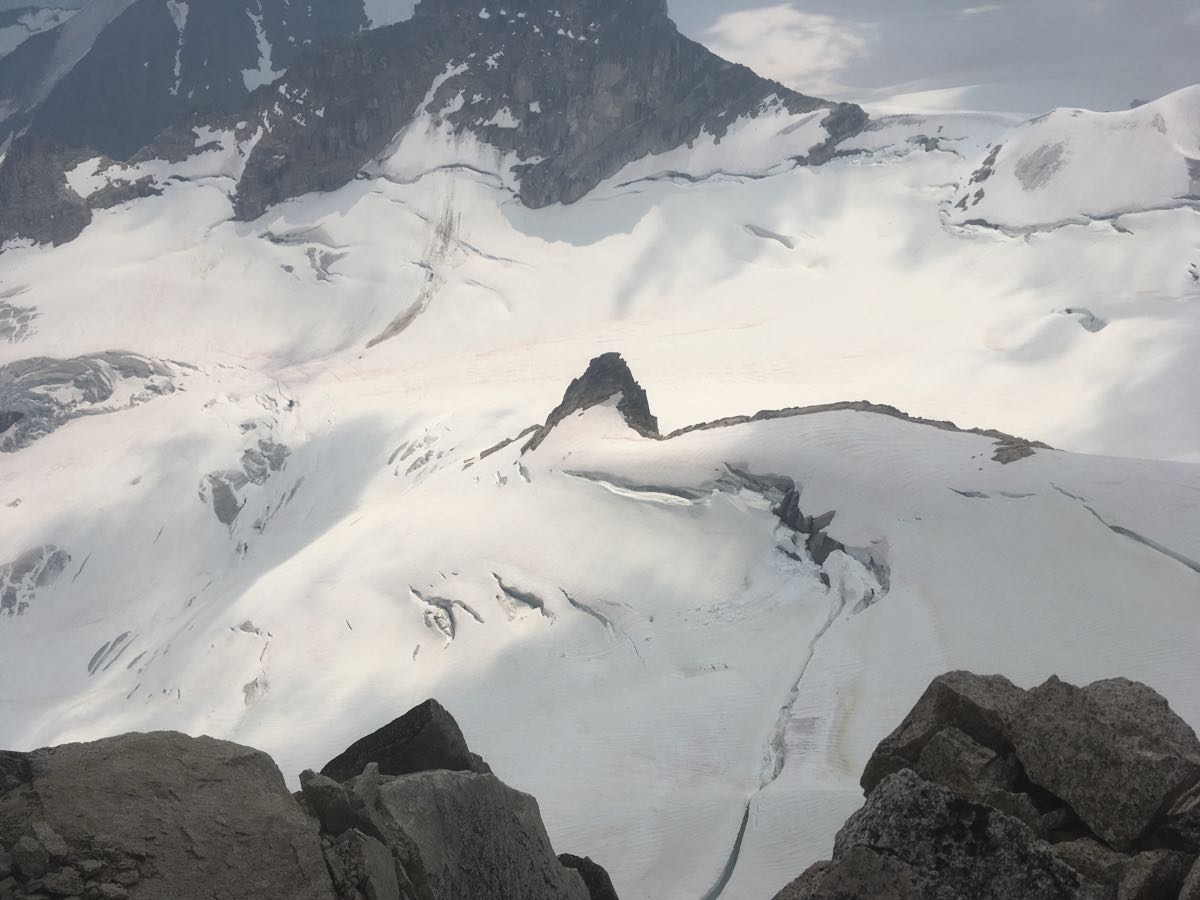 In addition, the bugaboo glacier’s crevasses are opening up quite a bit (see pic). We chose to swing far skiers right near the rock buttress to navigate the highest crack when descending from pigeon.