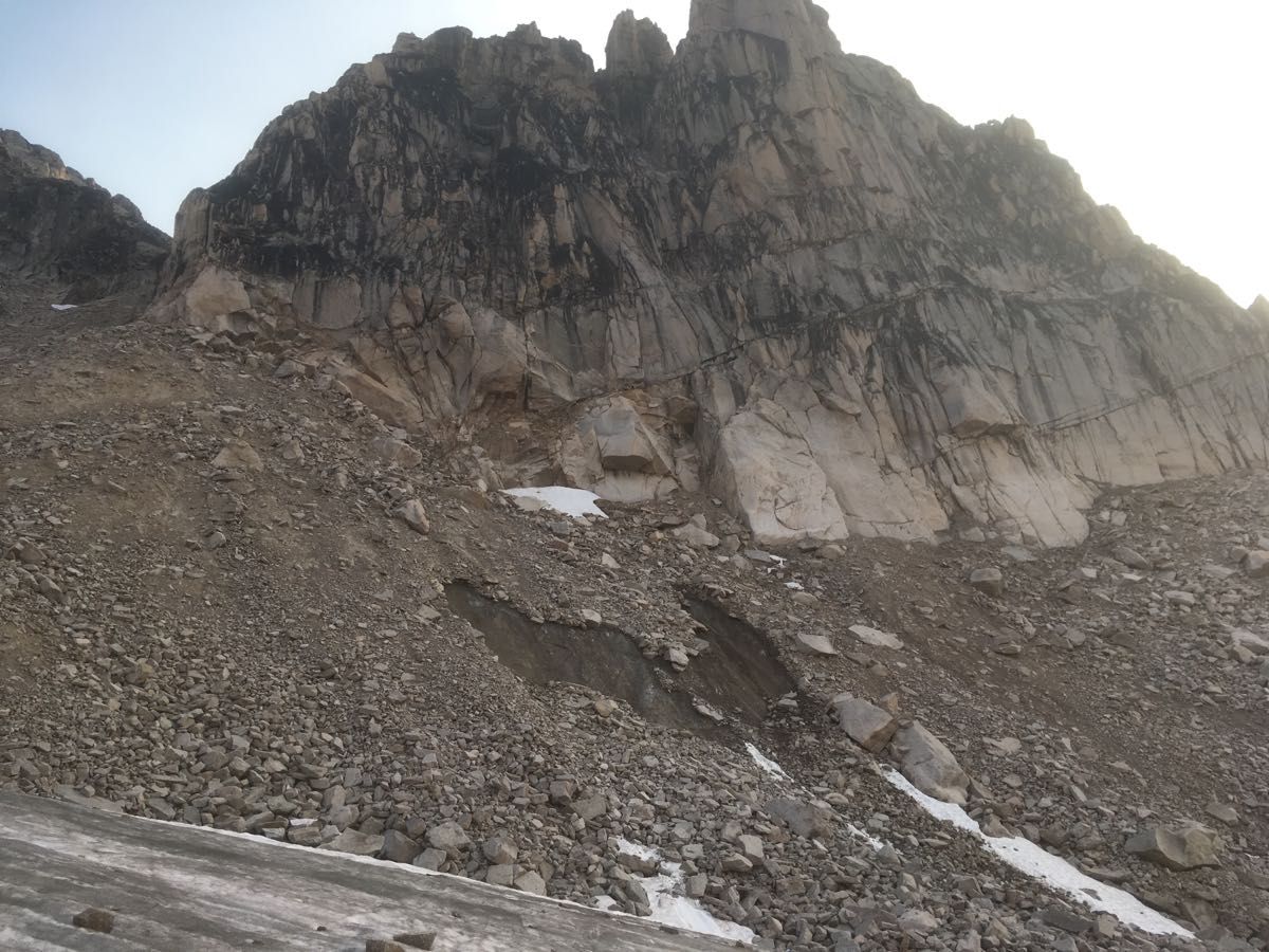 Finally, the snow has almost all but disappeared off the lower east facing l slopes on the ears between descent. The talus cone on the approach to the crescent towers have formed “glide” like failures exposing ice and causing frequent rock fall in that area (see photo)
