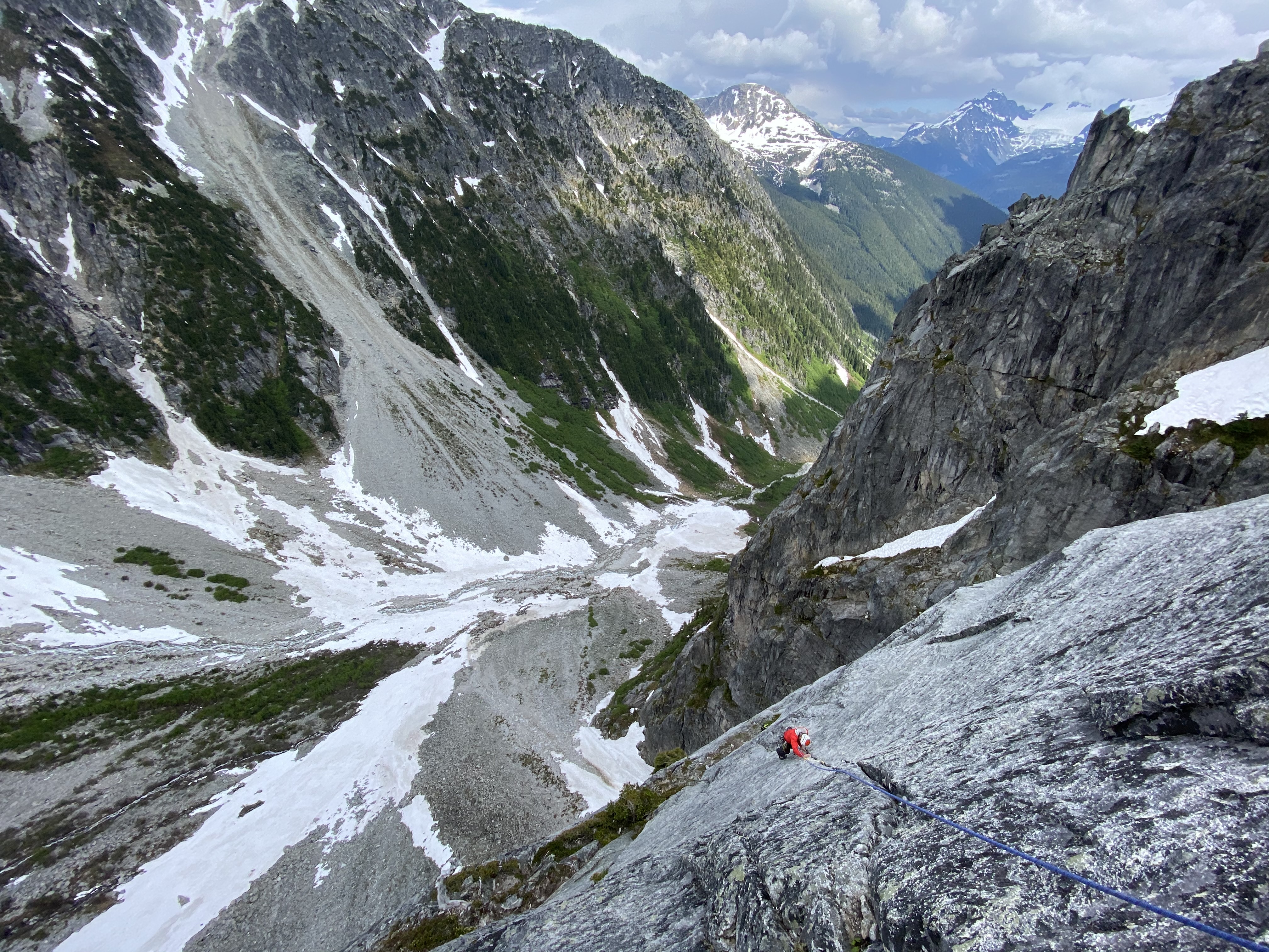 The route itself is dry and in great shape with no snow to be found on the belay at the base of the climb or any of the ledges along the route. There were large patches of snow on other buttresses in the area though so rockfall hazard was still a concern on the approach.
