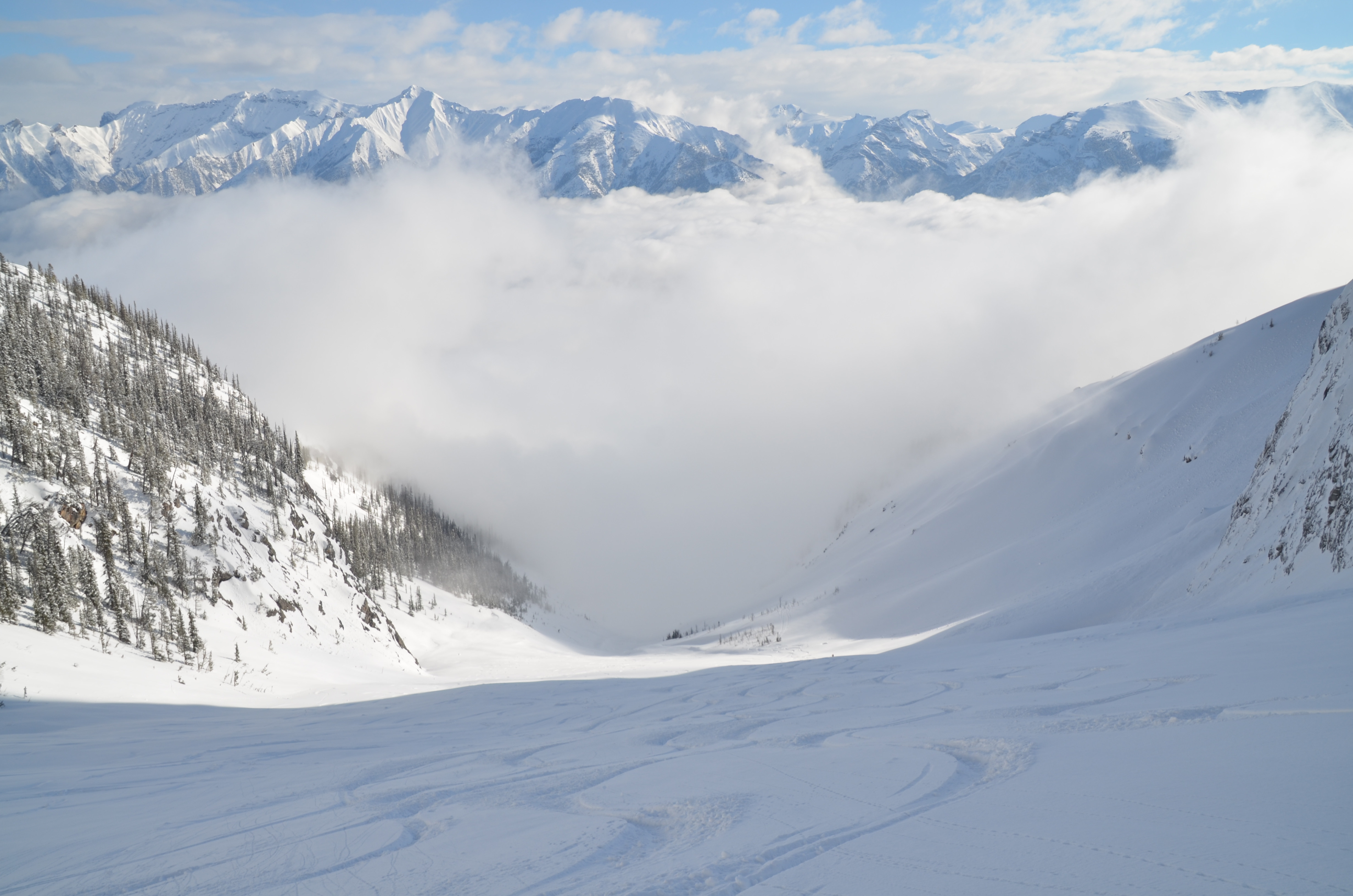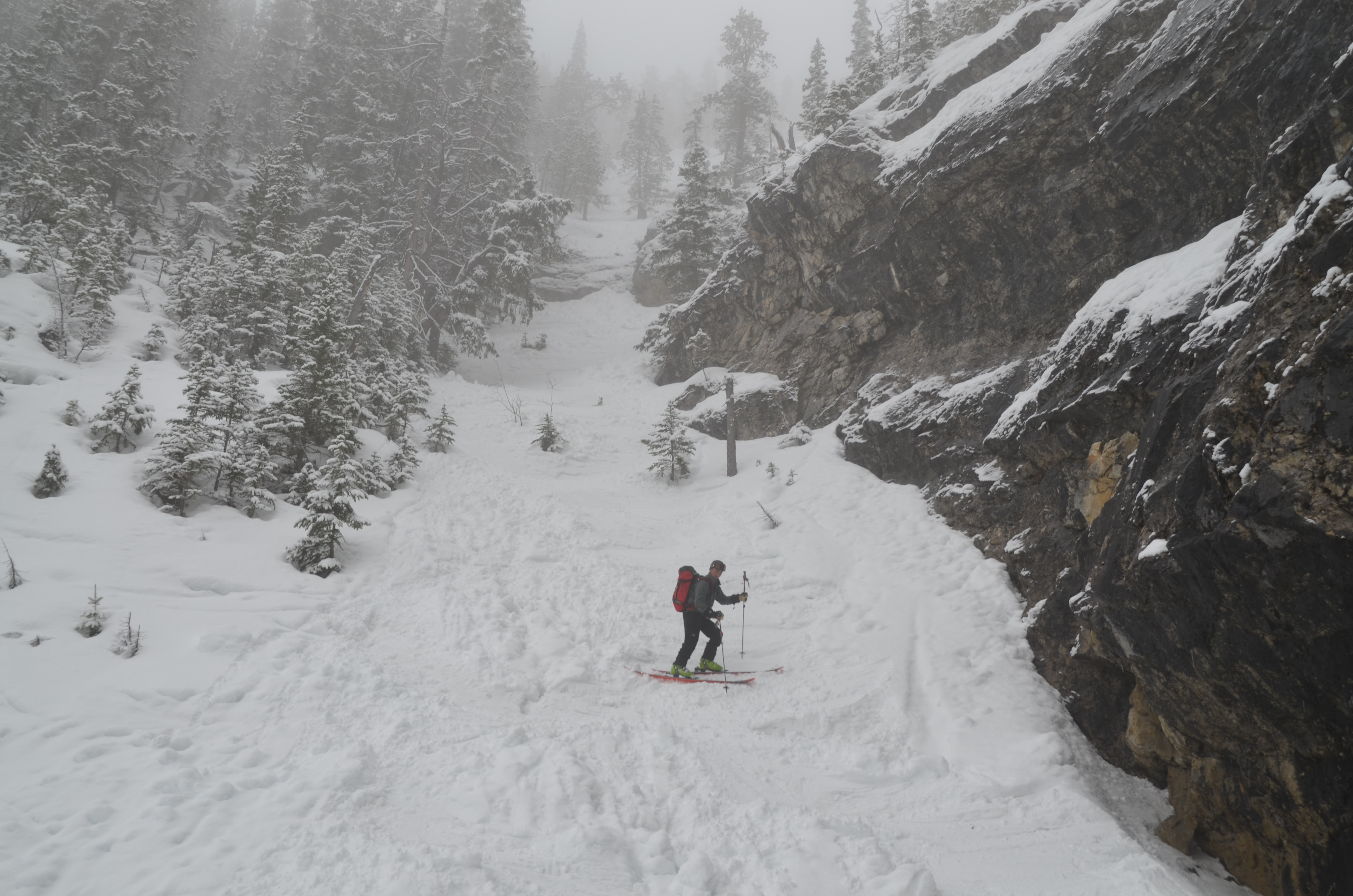 Coverage is good until the gully narrows. First cliff is easily avoided on the skier's right (we partly walked this section). The shorter, lower two cliff steps in the creek we avoided by walking down the forest skiers left to intercept the Highline Trail.