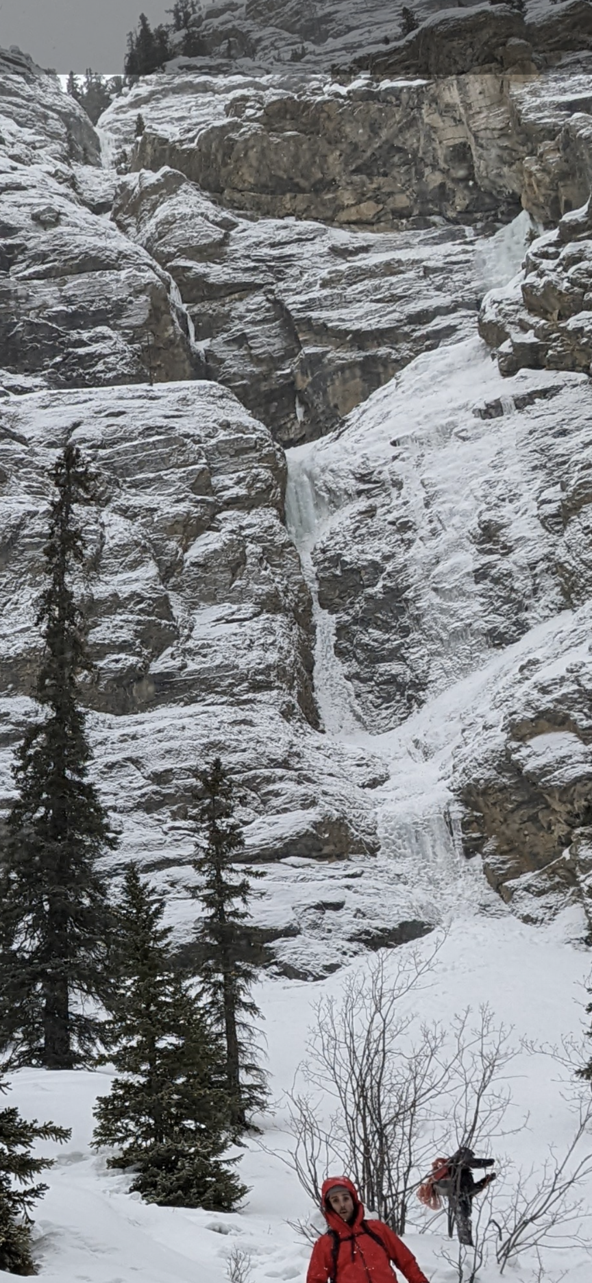 Plan B was The Weeping Wall but on arriving in the parking we noticed that the ice on the Uber classic Mixed Master was still looking fat. So we traded a two hour approach for a ten minute approach and climbed 7 quality pitches, the last of which is often unformed and this year requires a gentle touch being only 15 centimeters wide in spots.
