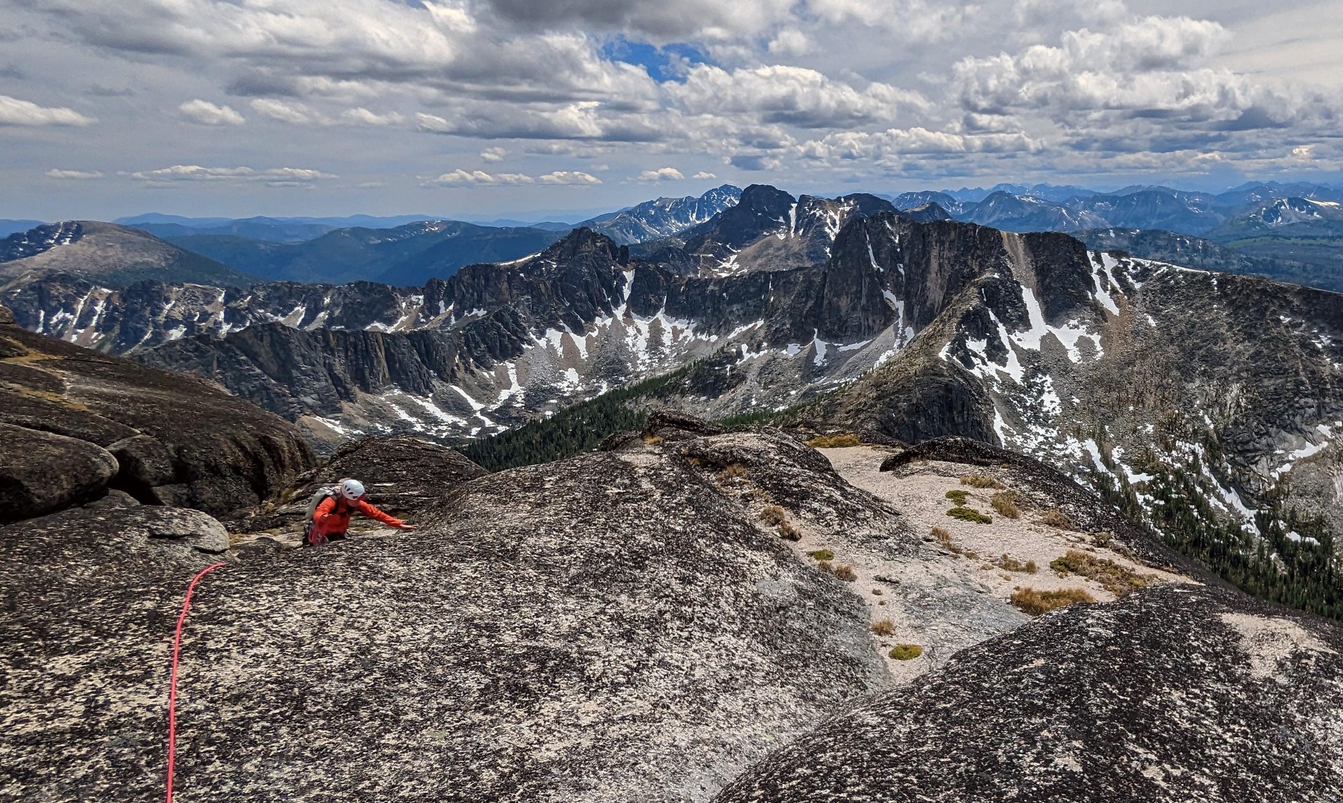 Snow coverage in the area is more reminiscent of late July. There's hardly any snow left, just lingering patches on high north facing terrain. We didn't bring or need crampons and ice axe. This may be needed if accessing the route from Goat Lake on the North side. The MMG traverse was in great dry condition and all anchors encountered were in good shape.