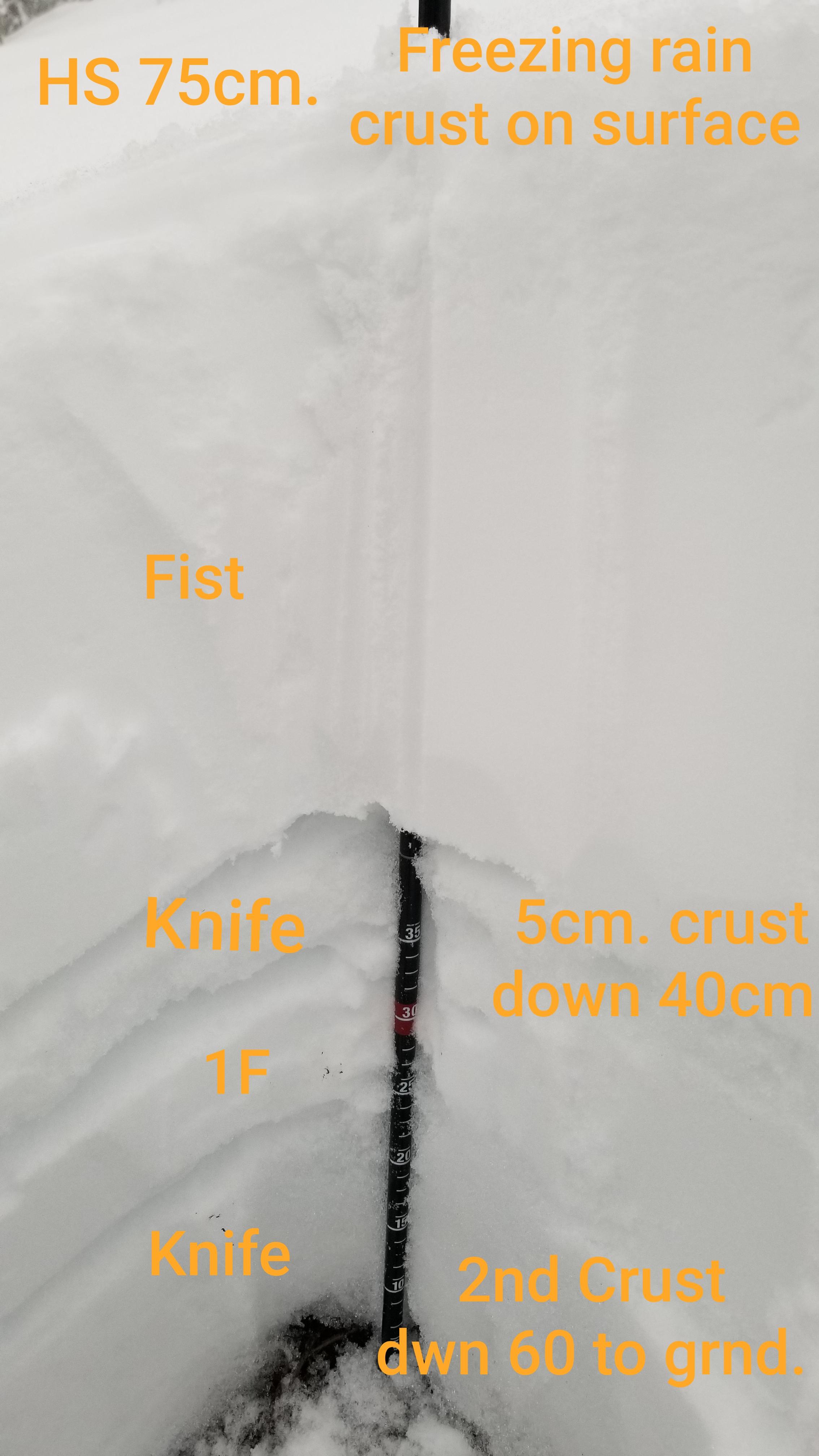 See attached photo of quick profile I did on an open slope smooth at 1750m. - no results from 3 compression tests - the upper storm snow appeared well bonded to crust down 35-40cm from the surface (see attached photo).