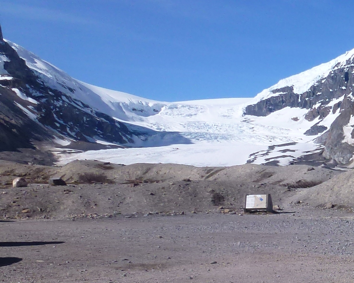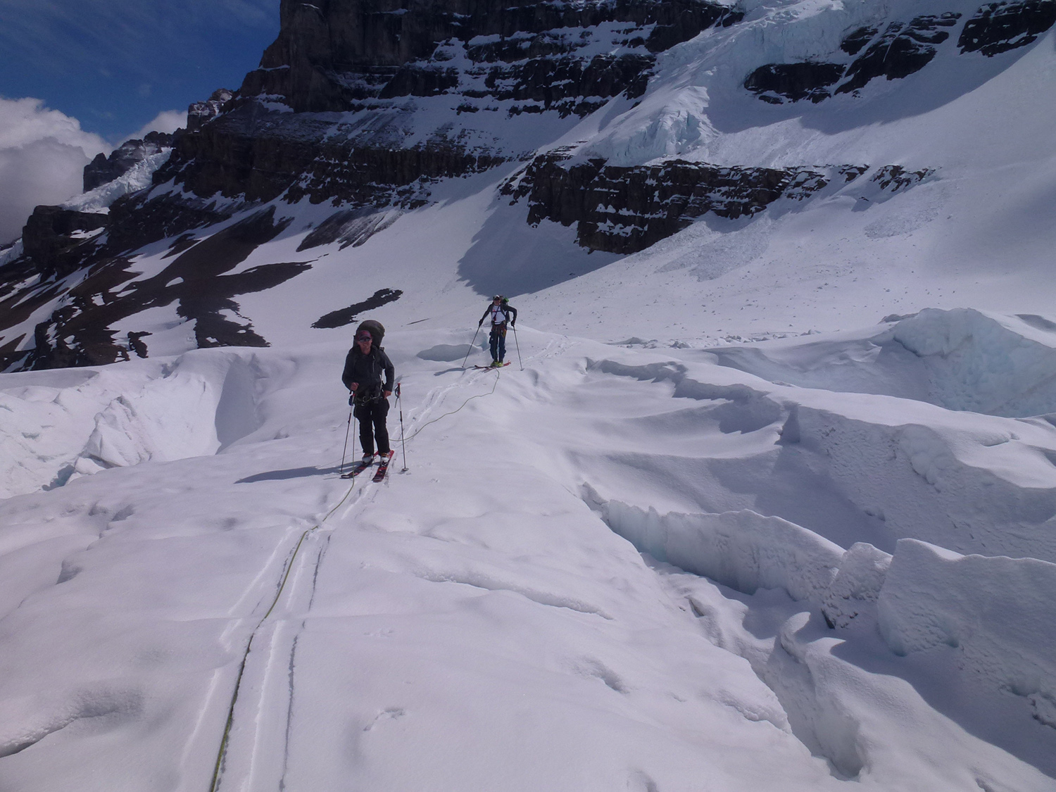 The snow coverage was thin on the lower Athabasca Glacier, deep spots were in the 70cm range and many bare ice areas were starting to show. We had to walk from the parking area to the toe of the Glacier before putting skis on. We ascended the first icefall on the right side, the second via a snow ramp ¾ of the way across the left side and the third via the usual snow slope. As expected snowpack depth increased with elevation; we measure 150cm at the base of the third icefall and upwards of 300cm on the Columbia icefields.