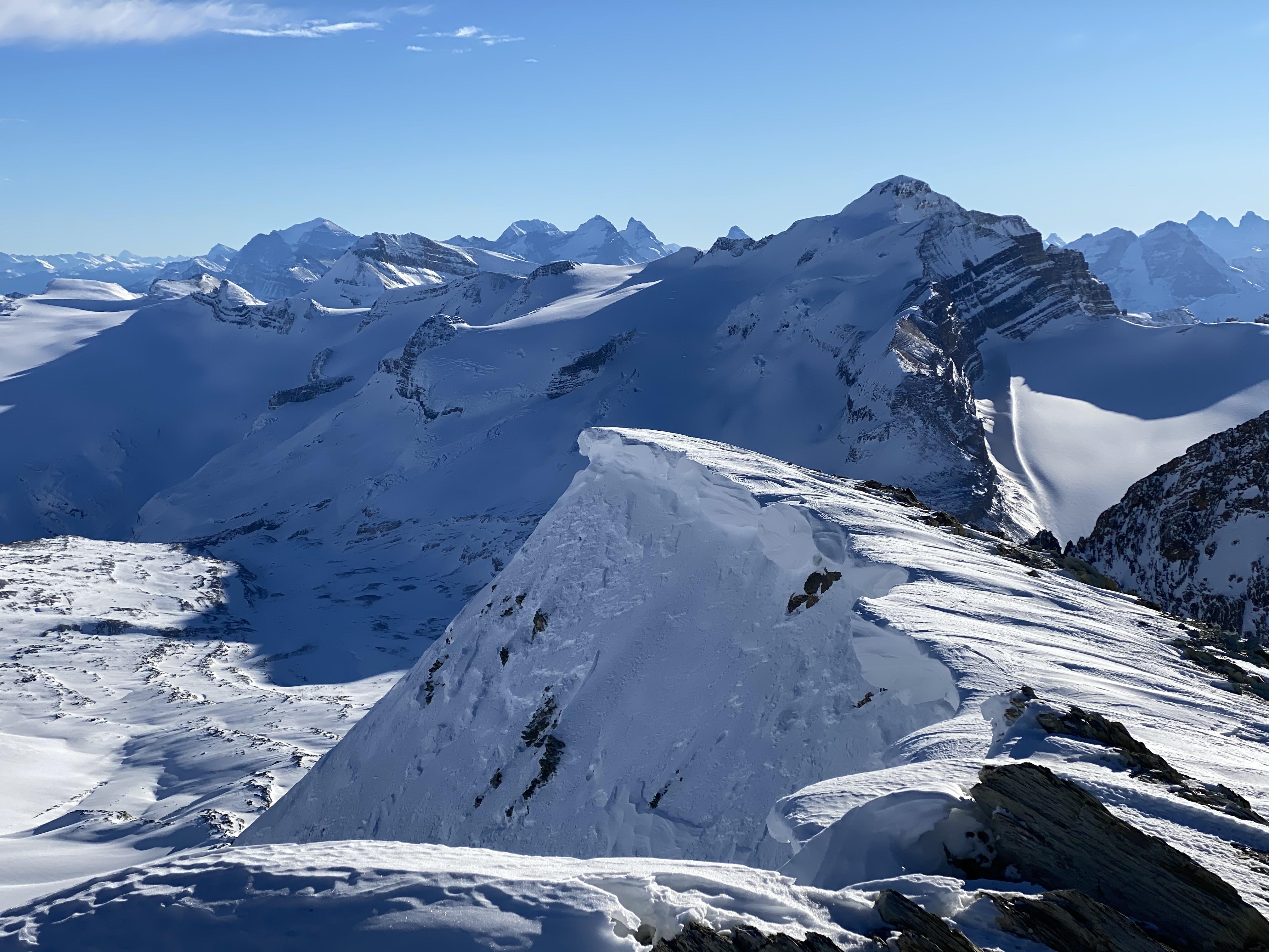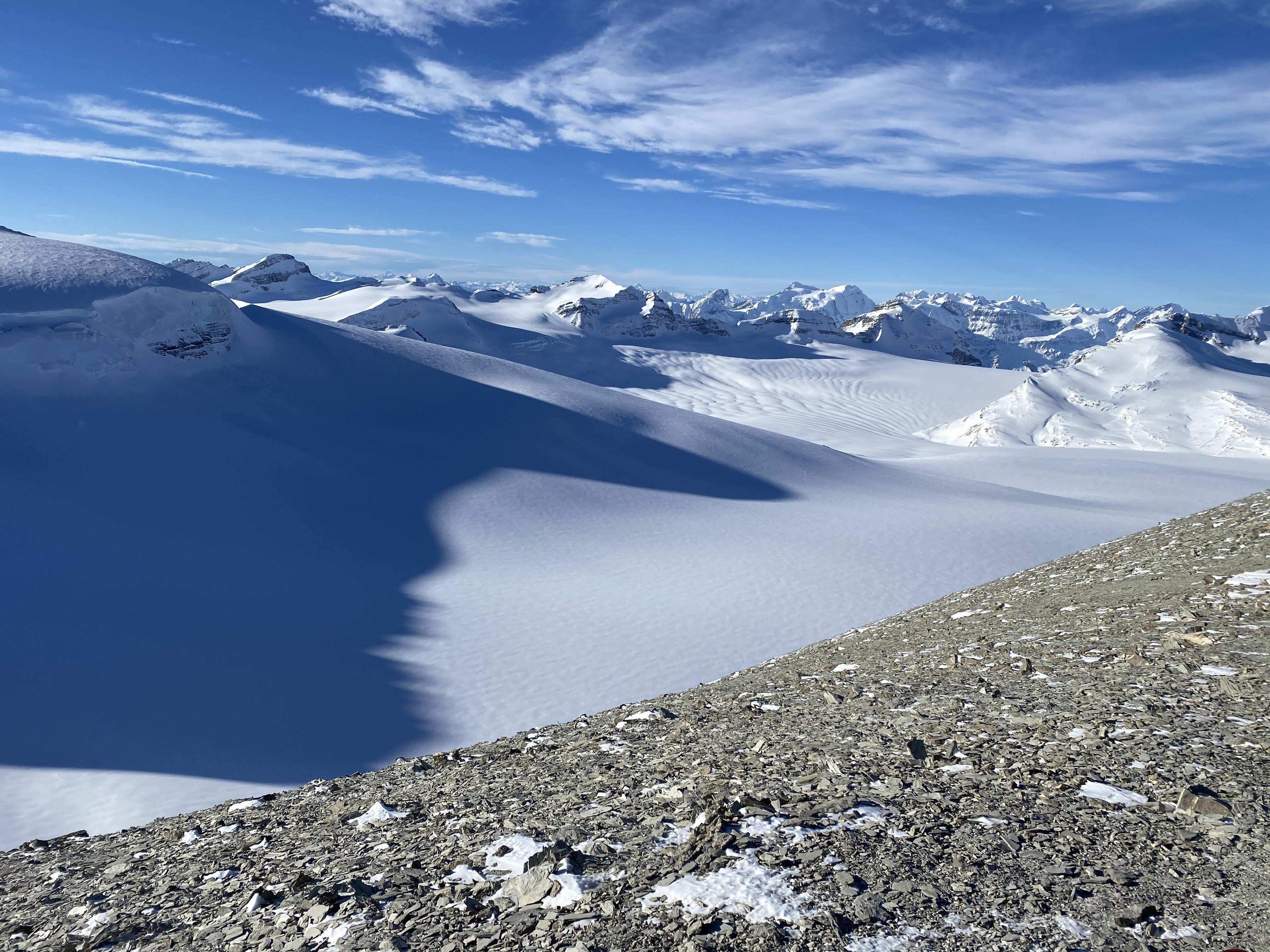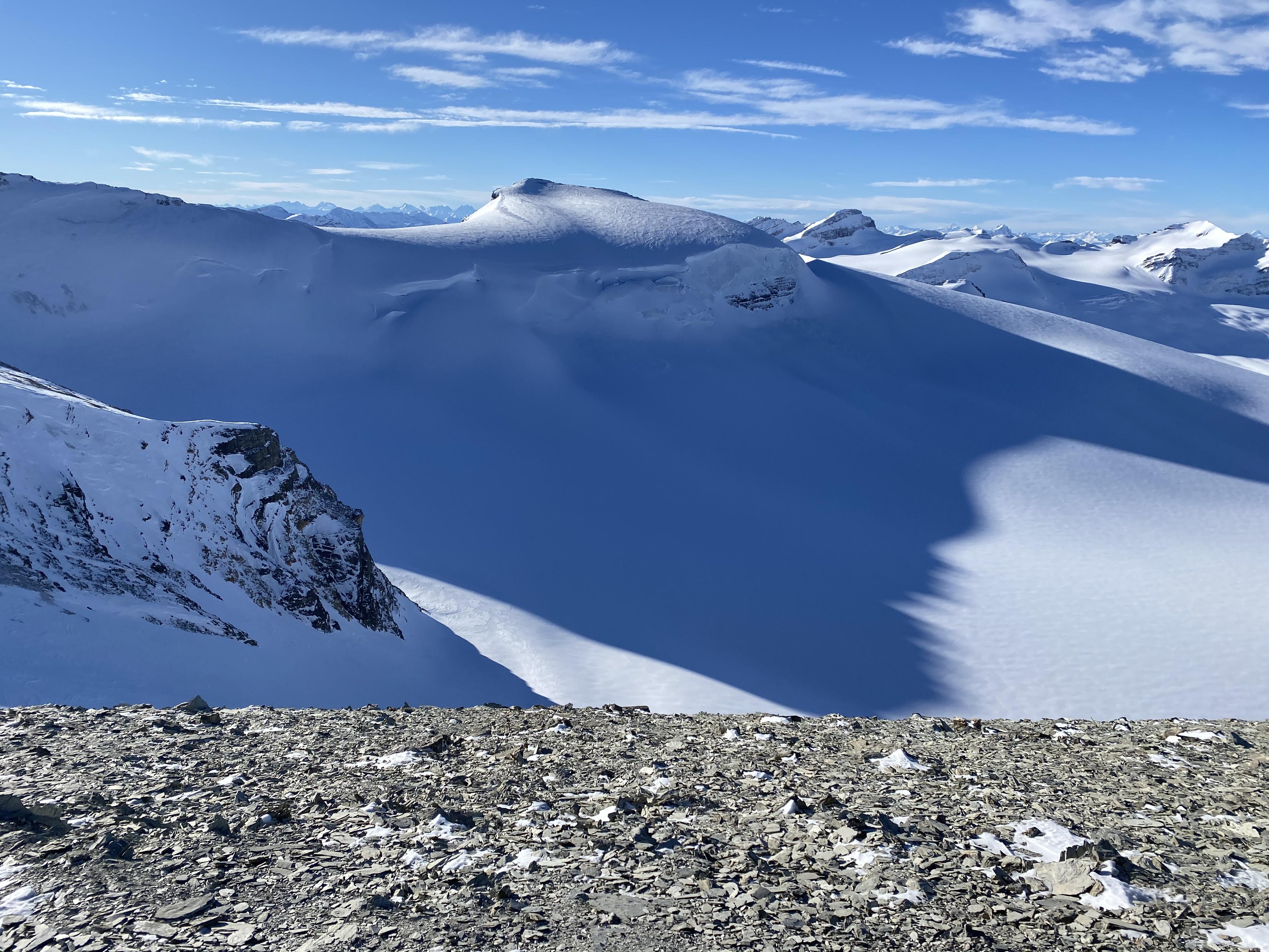 A quiet day on the Wapta, with one group of three seen during the day, at the St. Nic - Olive col as we descended. Another guide was in the Crowfoot Glacier area, and said the ski quality was pretty good.