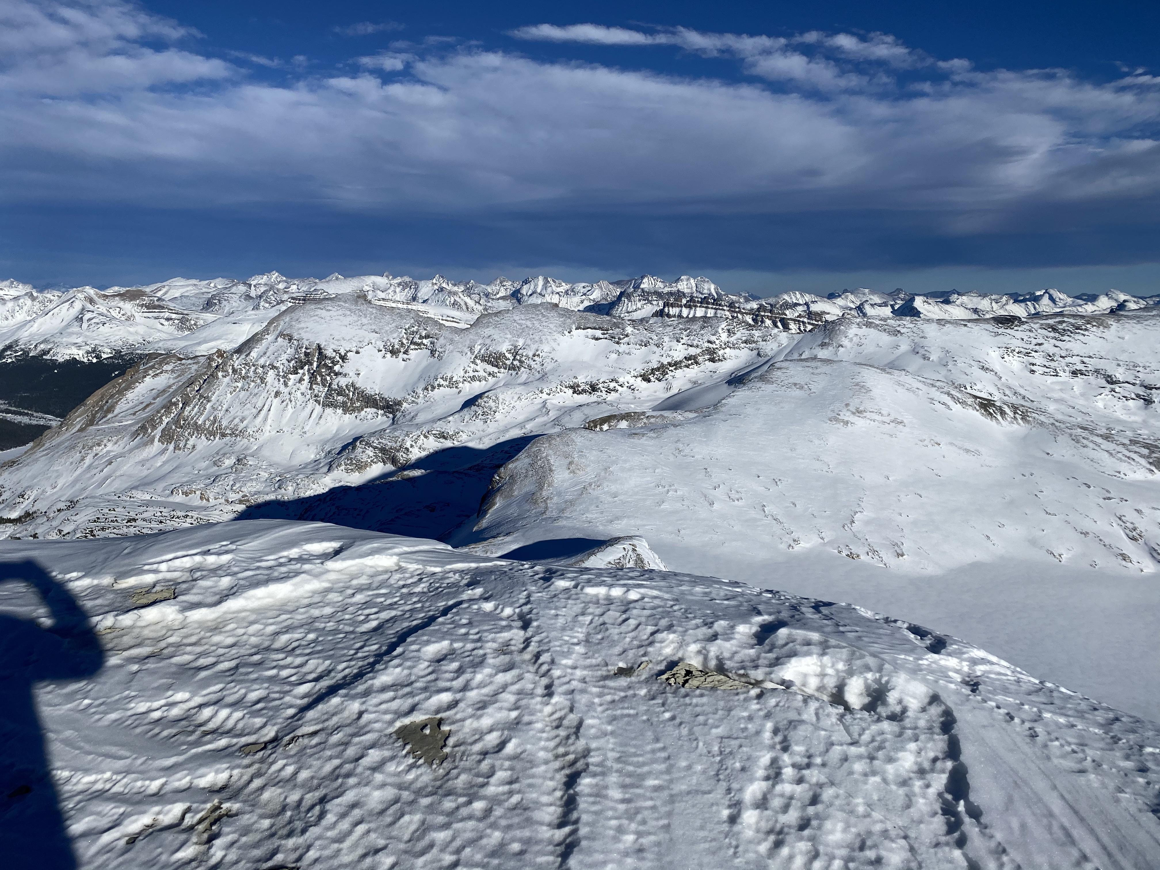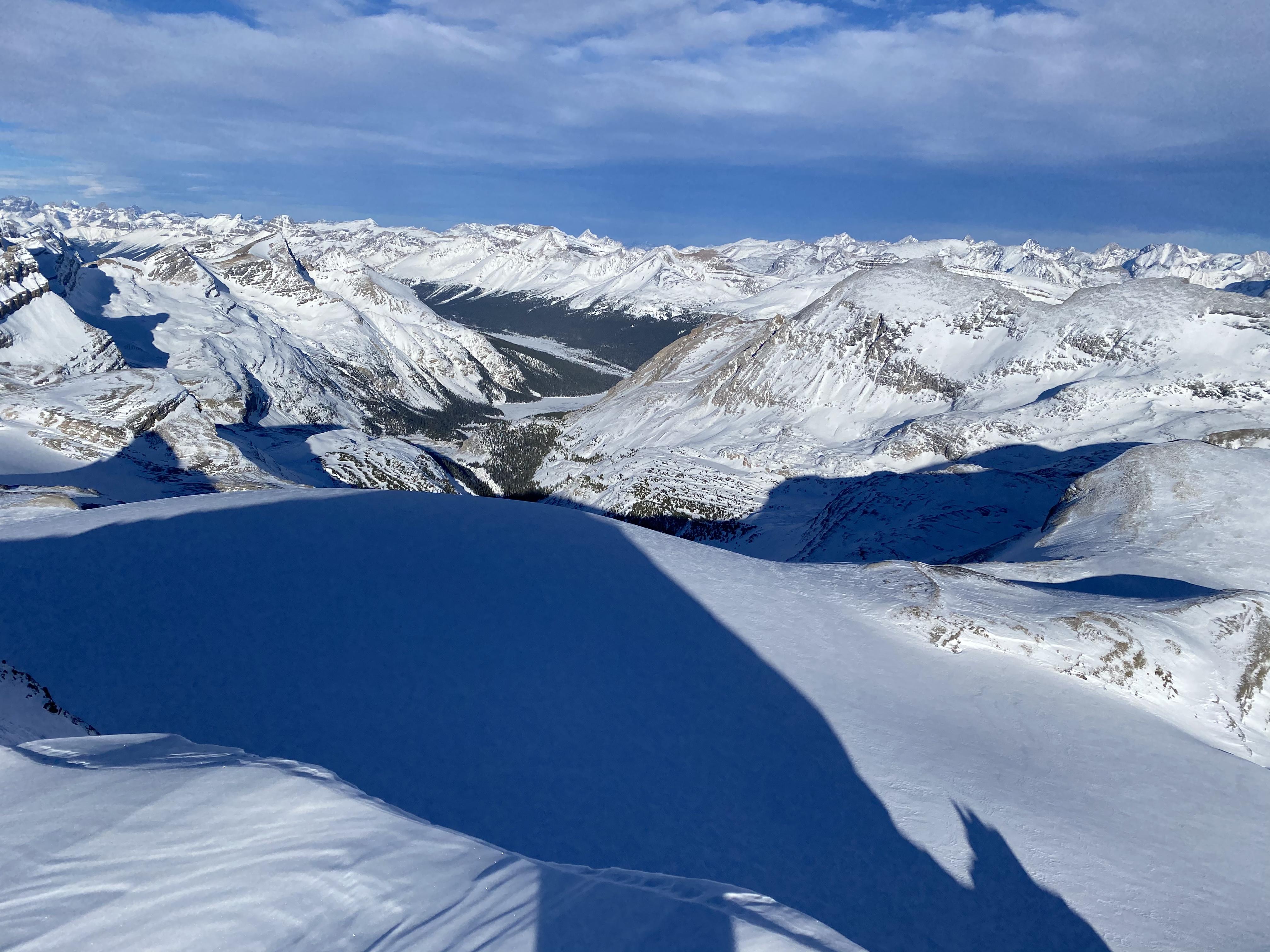 Windward alpine slopes (SW facing) are looking very bare. The skiing was supportive with variable quality, and excellent turns on the glacier above Bow Hut.