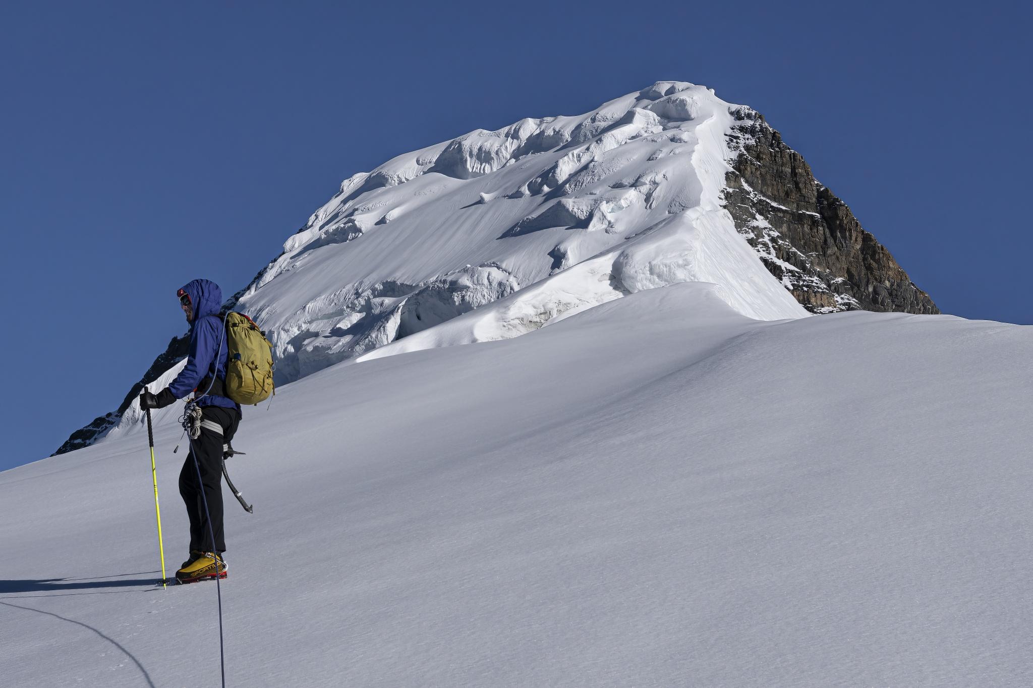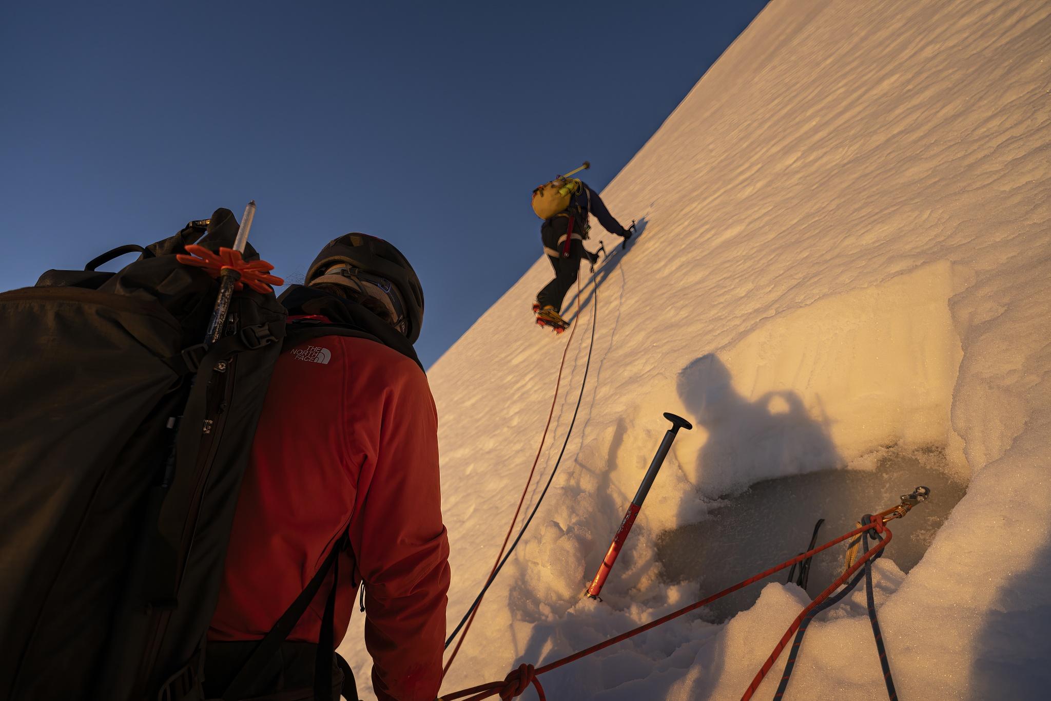 On the way back we down climbed the first 70m of the Kain Face to find some ice then 4 to 5 rappels to the base. Bergschrund was easy to rappel but some digging is needed to reach good ice above it.