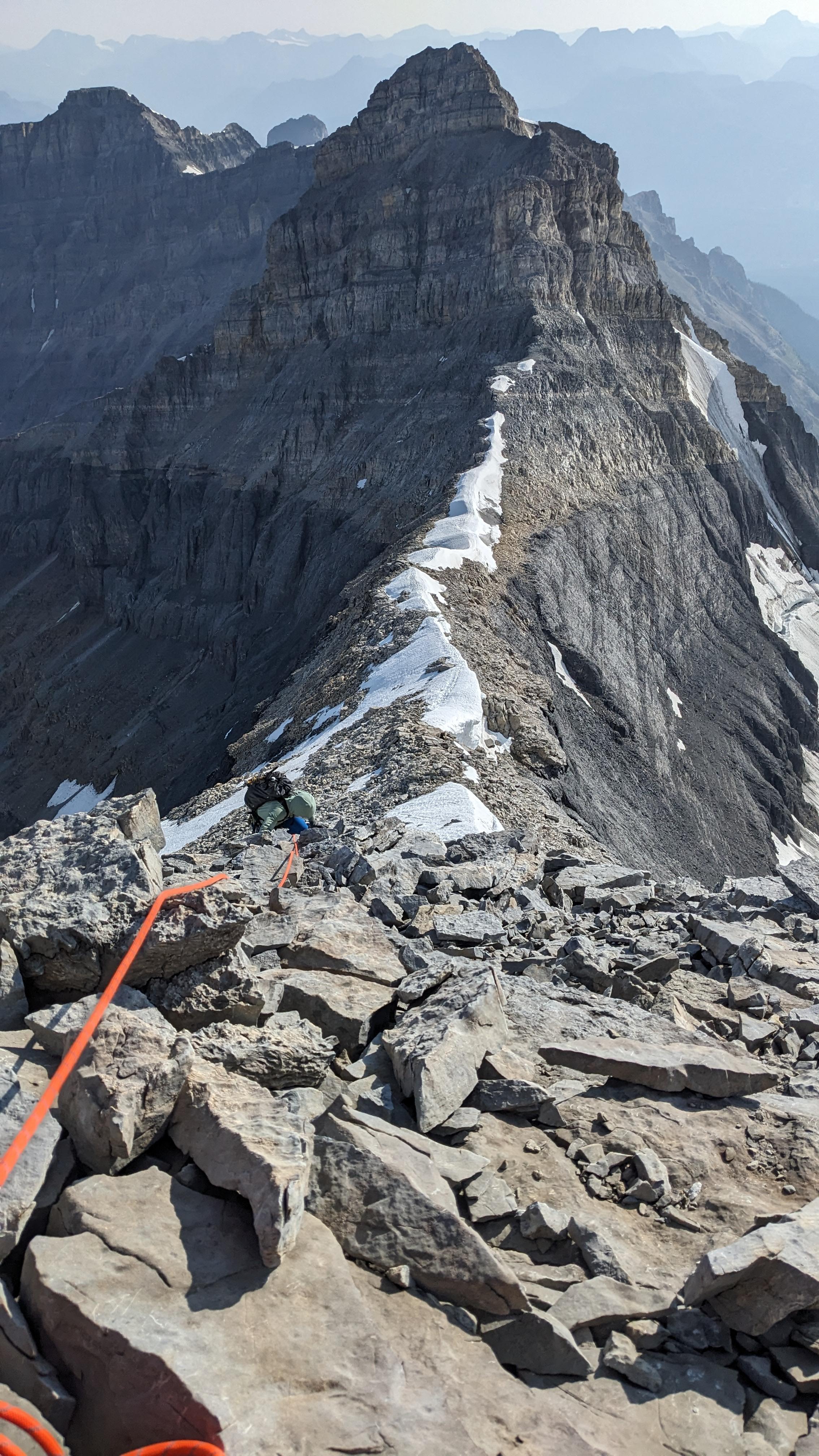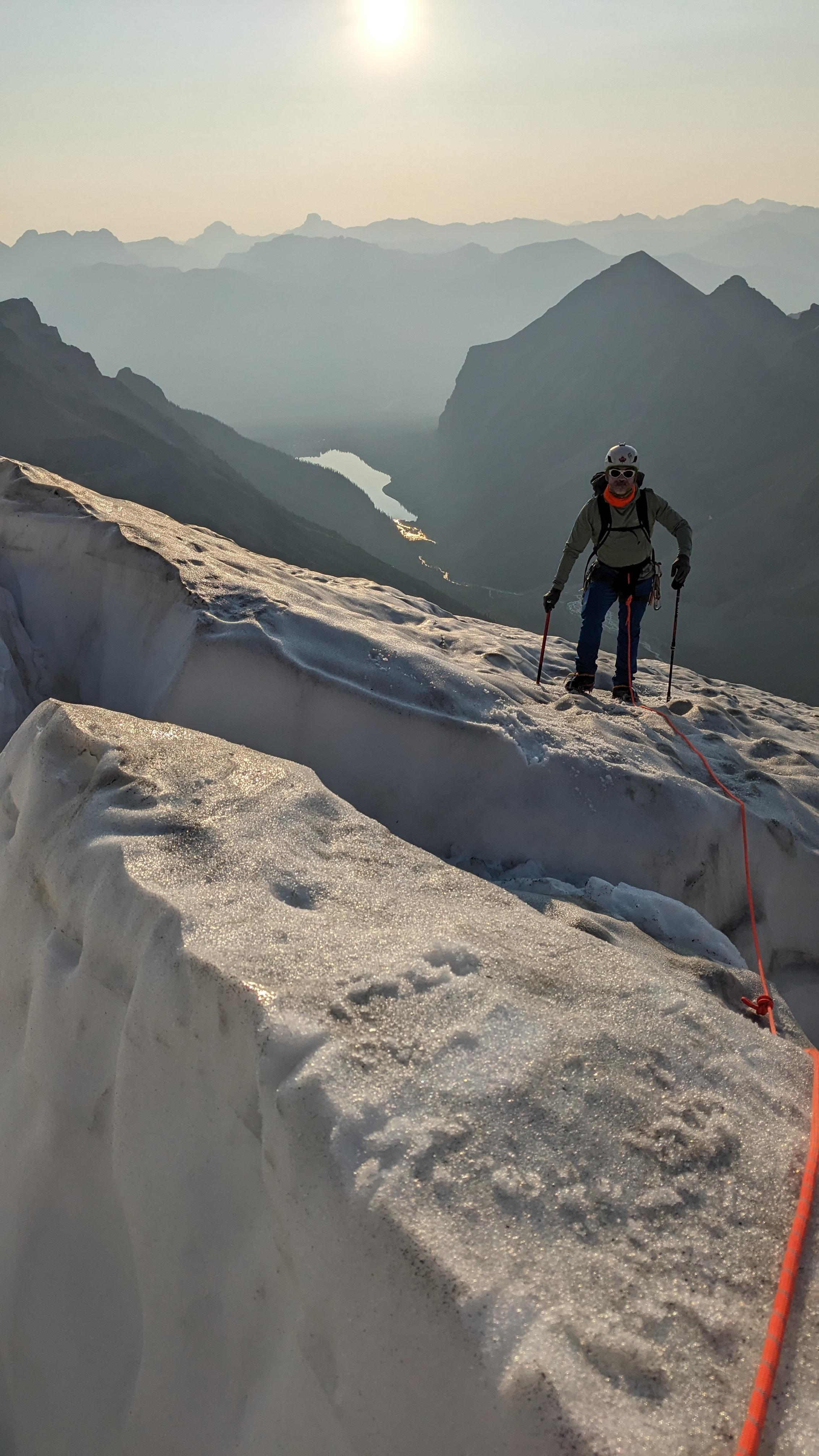 We summited Mount Victoria North Summit from a camp below the glacier on July 9th and found good overall conditions with a few large crevasses opening up.