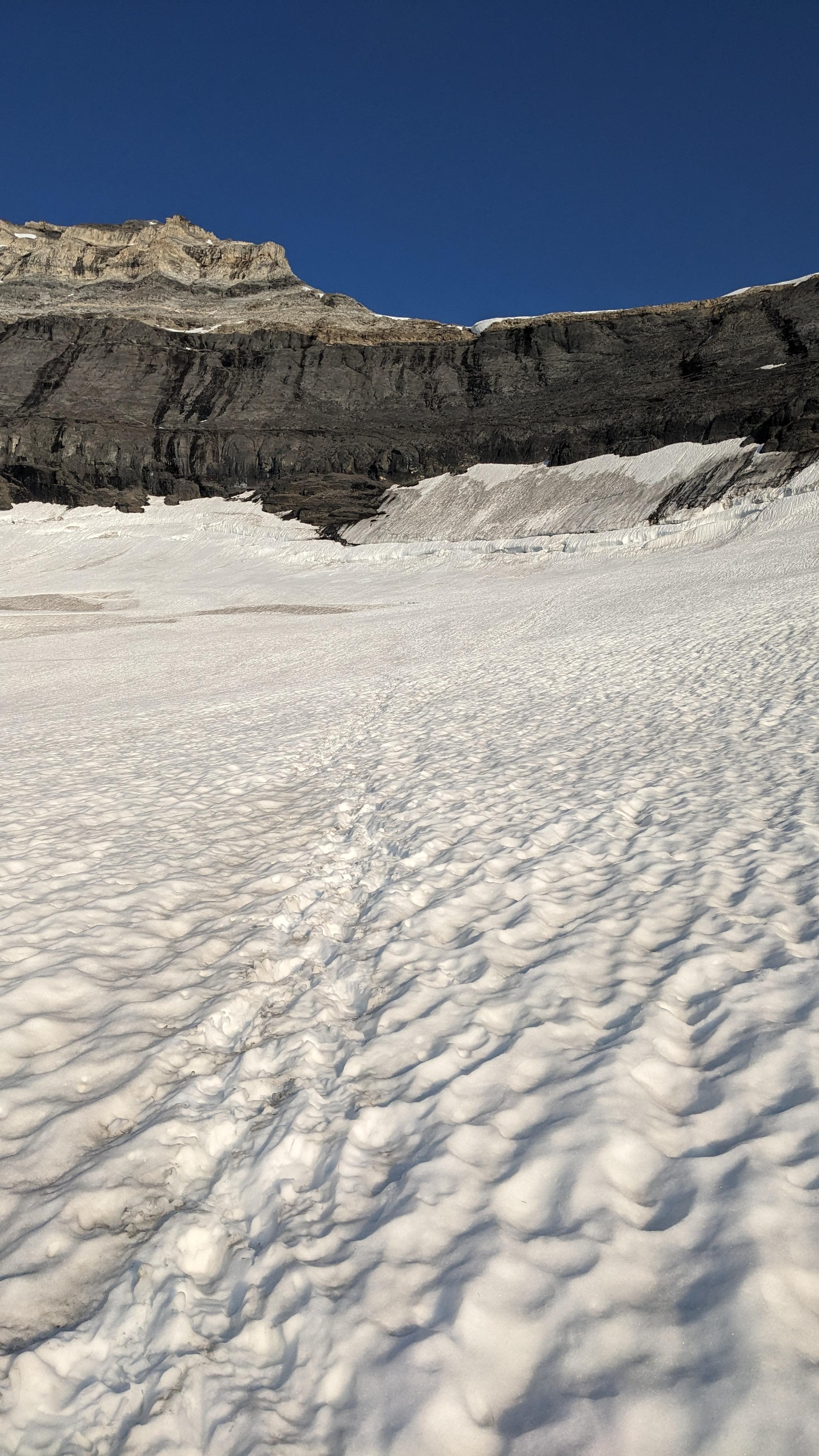 The day before 4 parties reportedly turned back, with one party telling us they witnessed large amounts of rockfall from Mount Collier strafing the "high line", while one team summited. Choosing the central glacier line so as to stay away from Collier we found easy climbing through largely bridged crevasses in the lower falls. The upper glacier bench had a couple of very large crevasses that are opening yet leaving just enough for passage.