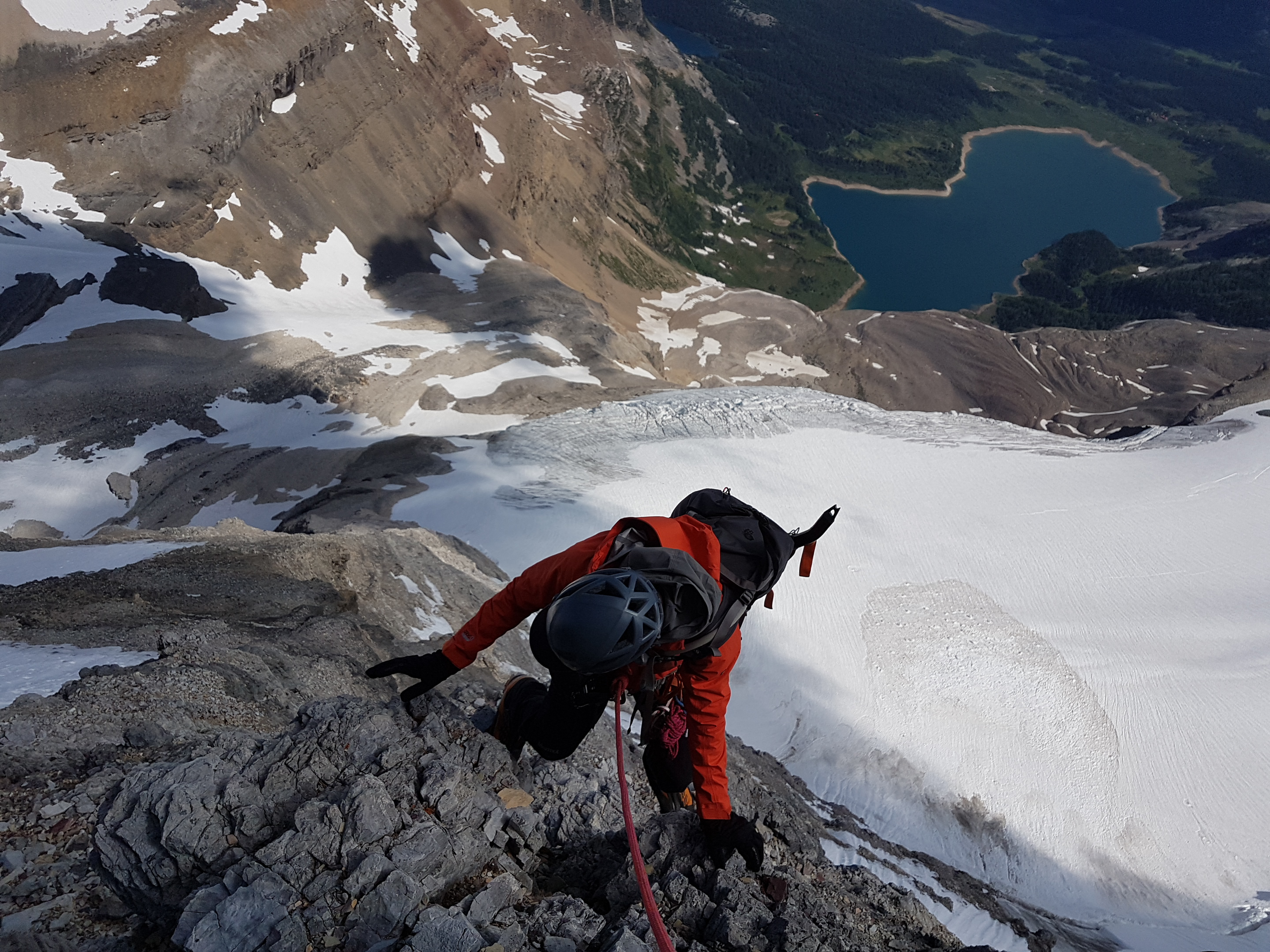 I just got home from an ascent of Mt. Assiniboine's classic North Ridge route With Yamnuska Mountain Adventures. We approached from the Assiniboine Lodge via the Gmoser Highway and stayed at the Hind Hut to facilitate an early start for the route. The Gmoser highway was in good shape although there are still some lingering some snow patches which required the use of crampons to cross safely. The North ridge route was in excellent dry condition on July 20th and we were able to ascend the route without using our crampons. We were treated to clear air and a great view of the smoke and fires burning just to the North.