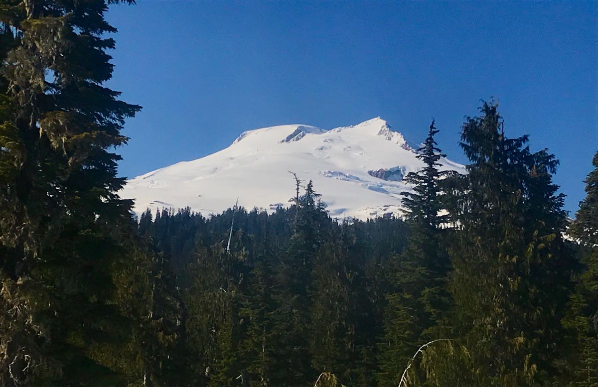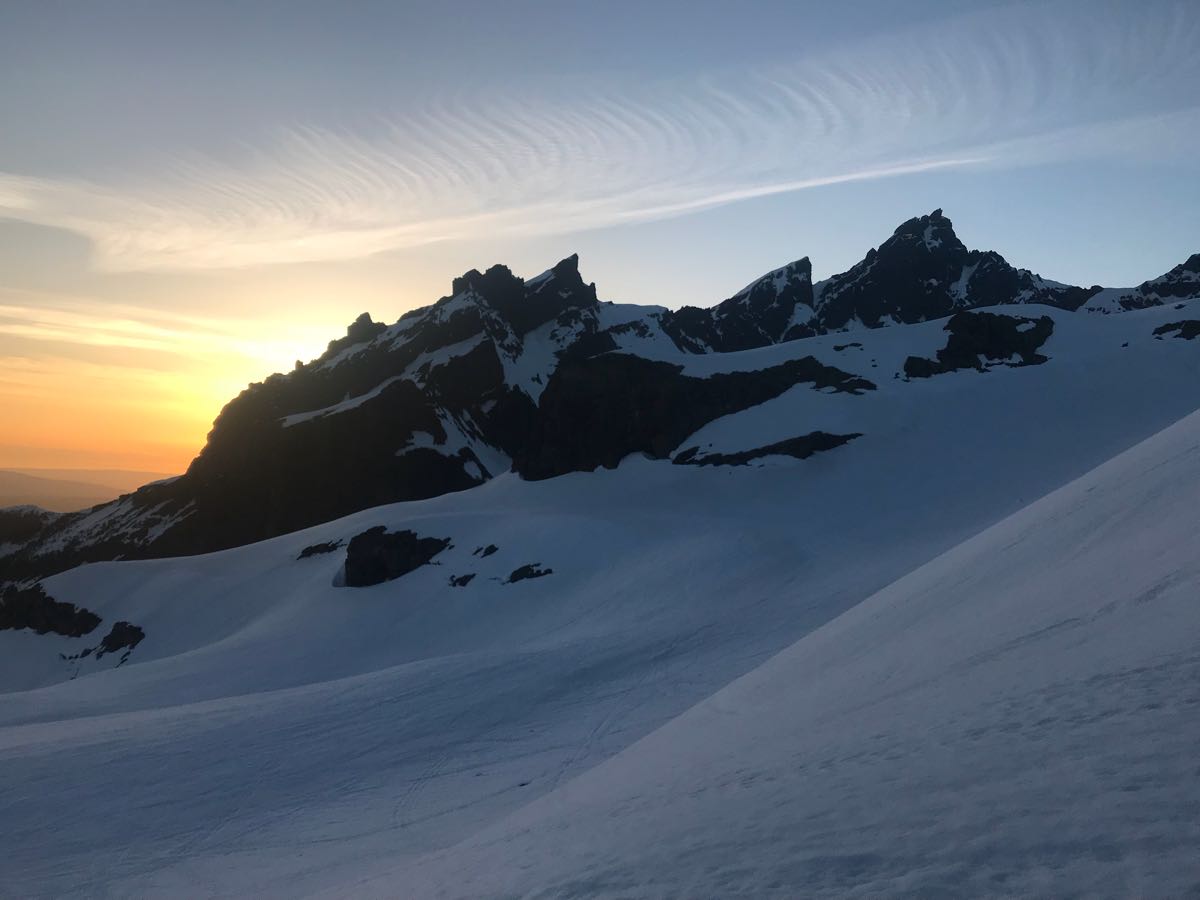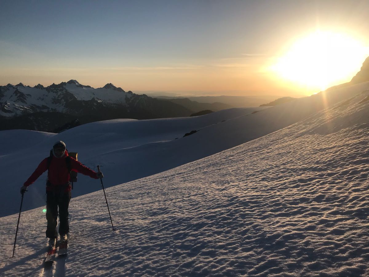 Spent Thursday evening and Friday morning on Mt. Baker’s South Side. Road to the Park Butte’s trailhead is in good condition, snow is stopping vehicles about a mile from the TH. Snow on the ascent is continuous from the car, we only had to remove skis once to cross a bridge. Our late day timing bought us some much needed shade on the trail up to Sandy Camp and the Portal Camp at 6600ft. Snow on the lower mountain is isothermal slush but was starting to crust at around 7pm below the glacier and travel was ok. We took the more direct ‘early season route’ to Sandy Camp and then climbed the ridge above to the Portal, skirting the glacier the whole way. Navigating was easy, just follow the 100 or so snowmobile tracks up the creek. The creek IS opening up in places so be careful skiing down this section.