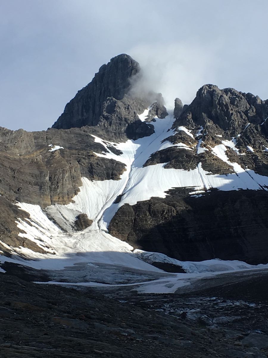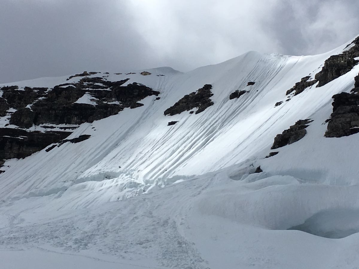 Aug 11 we started from a heli drop at 2900m at the base of the NE ridge. Excellent conditions along the ridge of centre peak up and down to the col. No overnight freeze on Aug 12 so we stuck to the NE ridge for an ascent of the main peak. Conditions on the ridge were ok. As we approached the main summit we traversed just below the exposed corniced ridge on the SE side using pickets and ice screws where we could find them. Not wanting to retrace our path along the ridge, we descended the SE face. The snow was soft but still carrying well at 1000am. We dug down 30 to 100cm on this face to the alpine ice for pro. 2x 20m raps off v-threads got us over the schrund. From 12pm on we witnessed small loose-wet snow avalanches on this face. We waited for cloud cover and cooler temps before descending the south couloir, which was in excellent condition. Good heal plunging all the way to the flat glacier with an easy hop across the schrund. Ascent conditions would be excellent on this face with a descent overnight freeze.