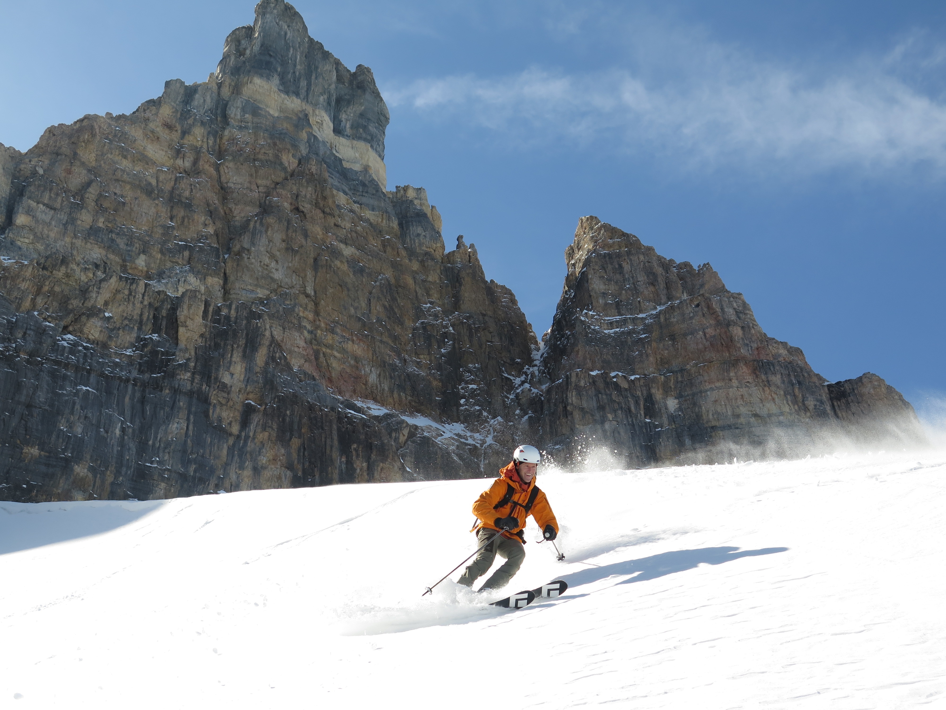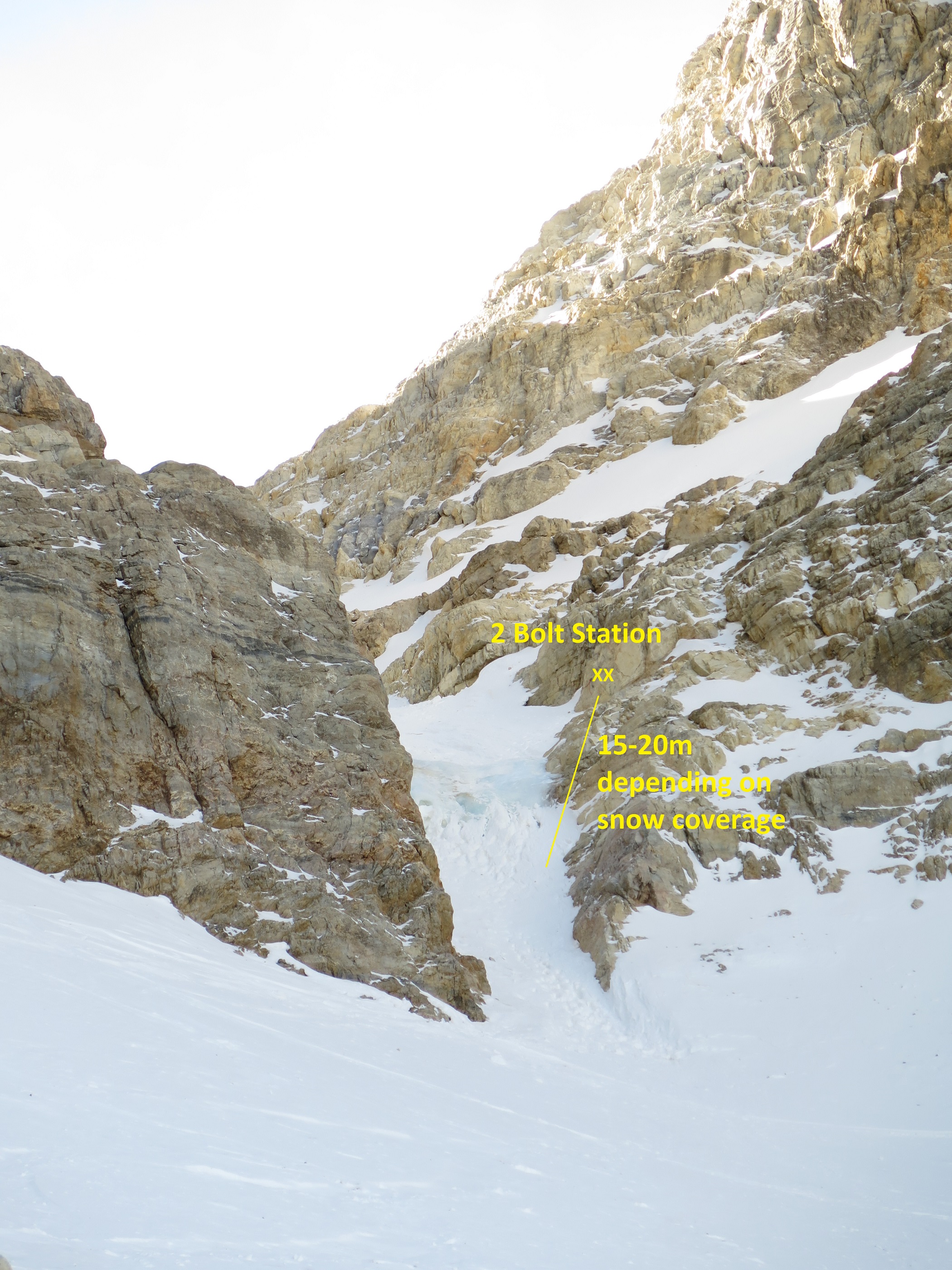 Great spring skiing on Mount Cathedral on Sunday April 17th. We found 5-10 cm of dry snow on steep north aspects above 2300m which transitioned to nice corn skiing below and became isothermal below 1600m. We skiied north to the Trans Canada Highway through the Cathedral Crags North gully. There is now a bolted anchor for the rappel over the waterfall ice step. It is on the skiiers left just above the step and is marked with a red prussik cord (see attached photo). This year, the step could be rappelled with a 30 m rope (15 m rappel). A 40 m rope (20 m rappel) is nice to get you into lower angle terrain and will work regardless of snow levels.