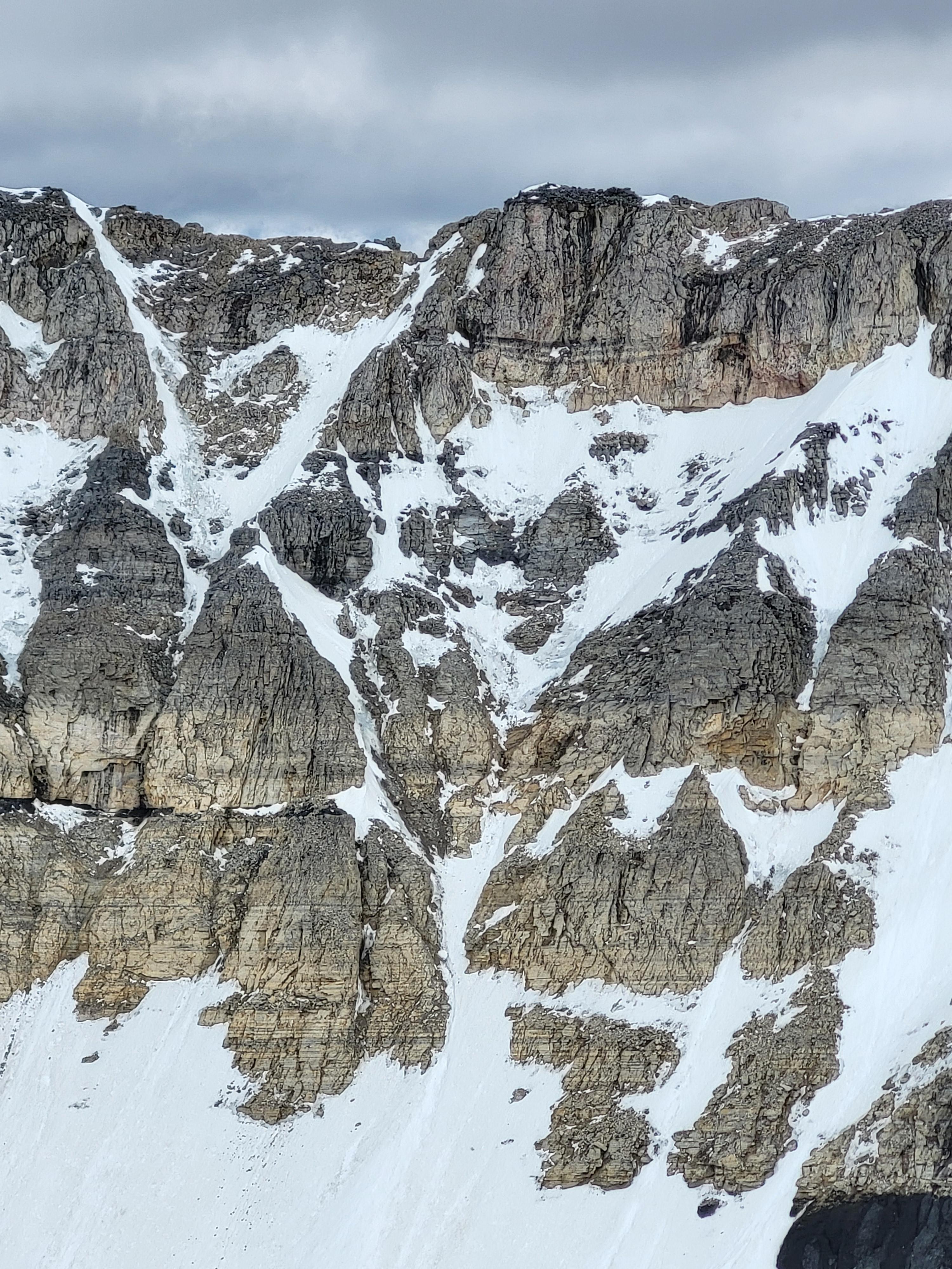Mt Huber required ice screw anchors for the last 2 pitches, snow coverage on summit.