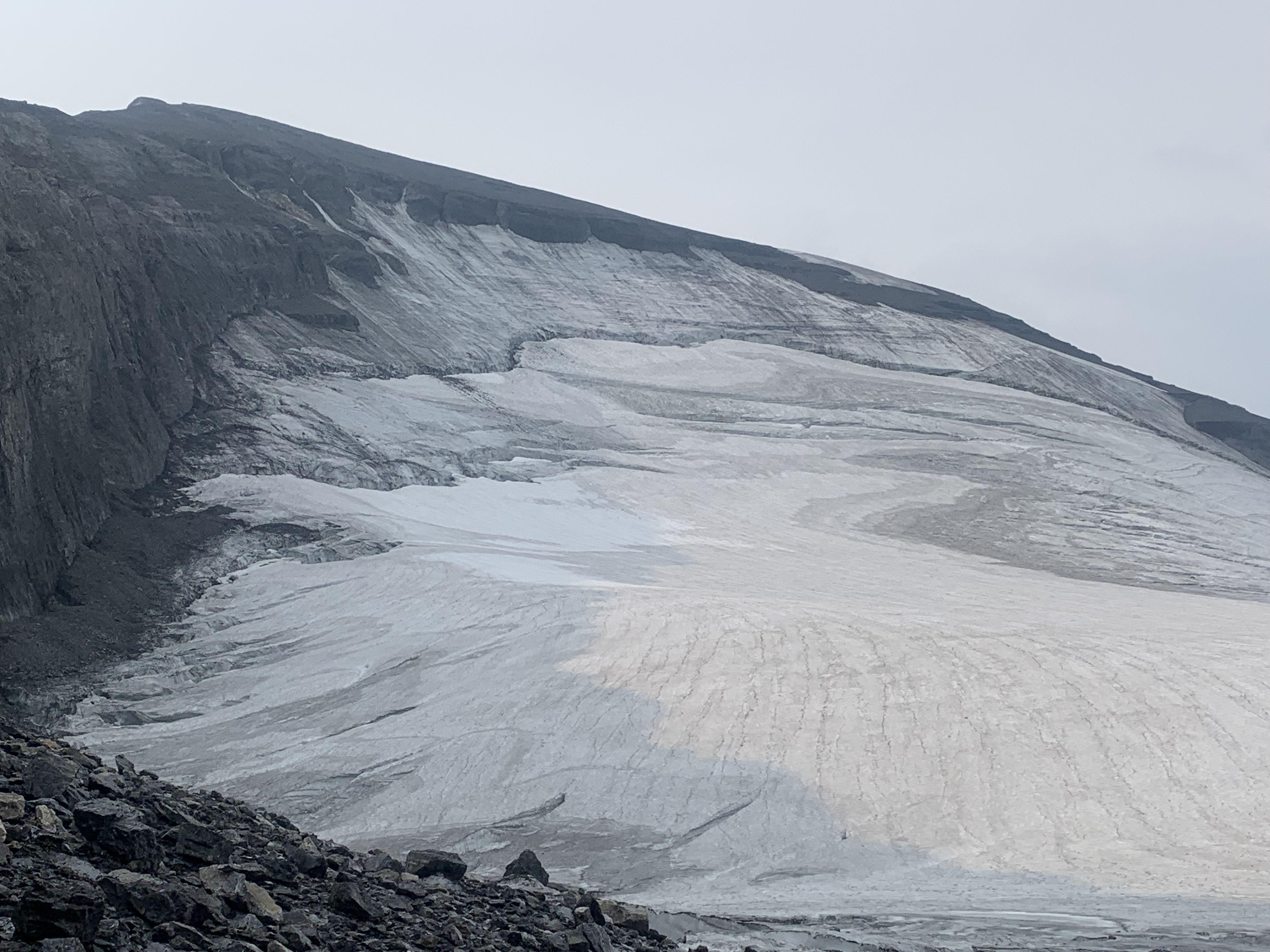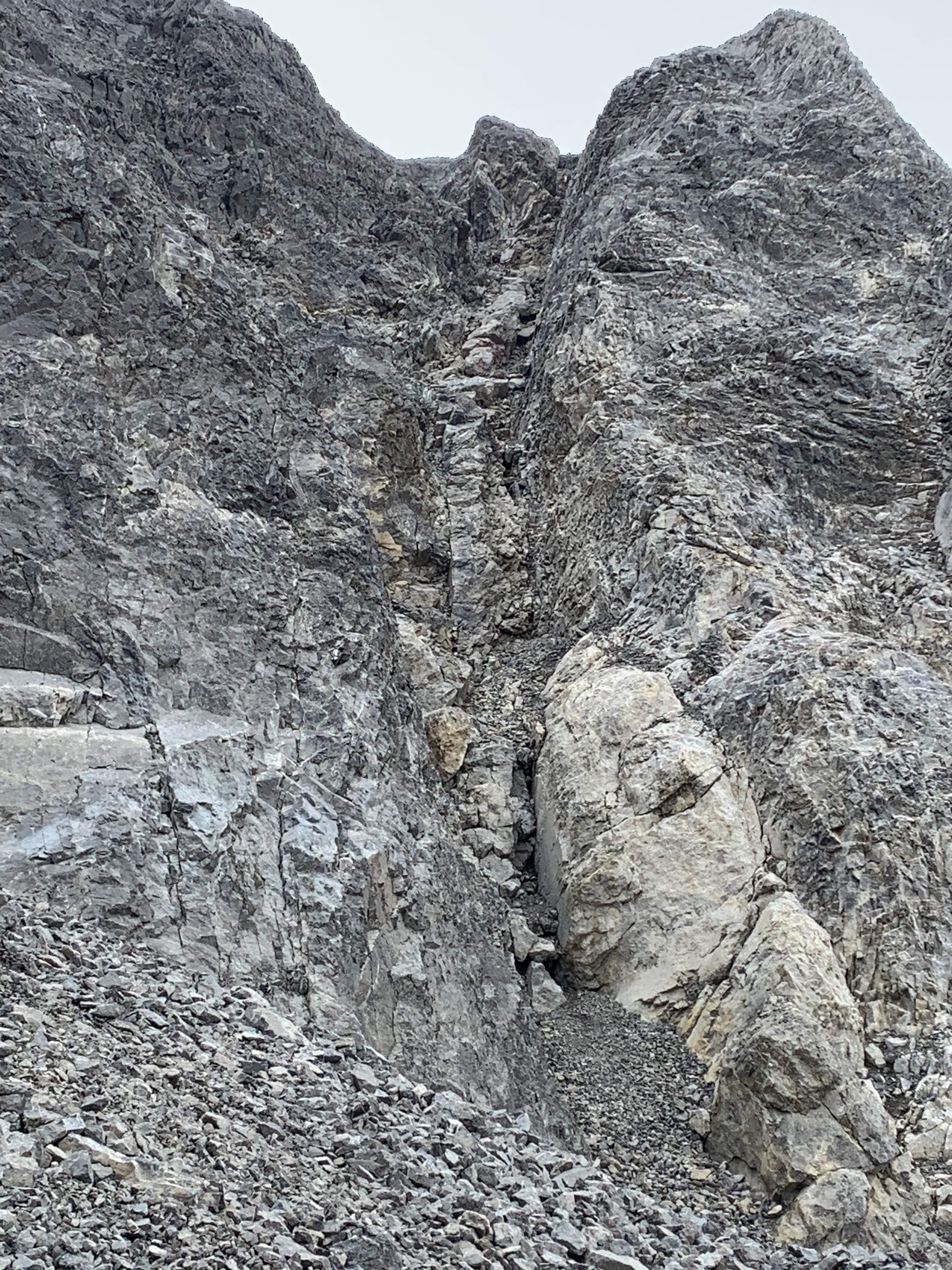 We summited Mt. Joffre via the NE ridge this week. The approach on the Mangin glacier has almost no snow cover but there were a number of thinly bridged crevasses that we had to navigate around. Certainly places to get into trouble up there still, even on the approach. The classic North Face route (first pic) looked to be very unappealing and would also require crossing the bergschrund, which looked complicated and committing with no bridging snow. We opted for the NE Ridge route, which leaves the glacier and goes up a short gully to easier slopes above. The gully access from the glacier was tricky, it's an ice-core moraine type feature, with a thin skin of scree covering the ice, slippery walking and awkward cramponing. The gully itself (second pic) was very very loose, and we were glad to be able to rappel down it rather than having to downclimb. There were two decent rap anchors for descent, a set of pitons at the top and a slung boulder in the middle. We used a 40m rope and it worked well. Also the summit register is getting full, if anyone is headed up there in the near future.